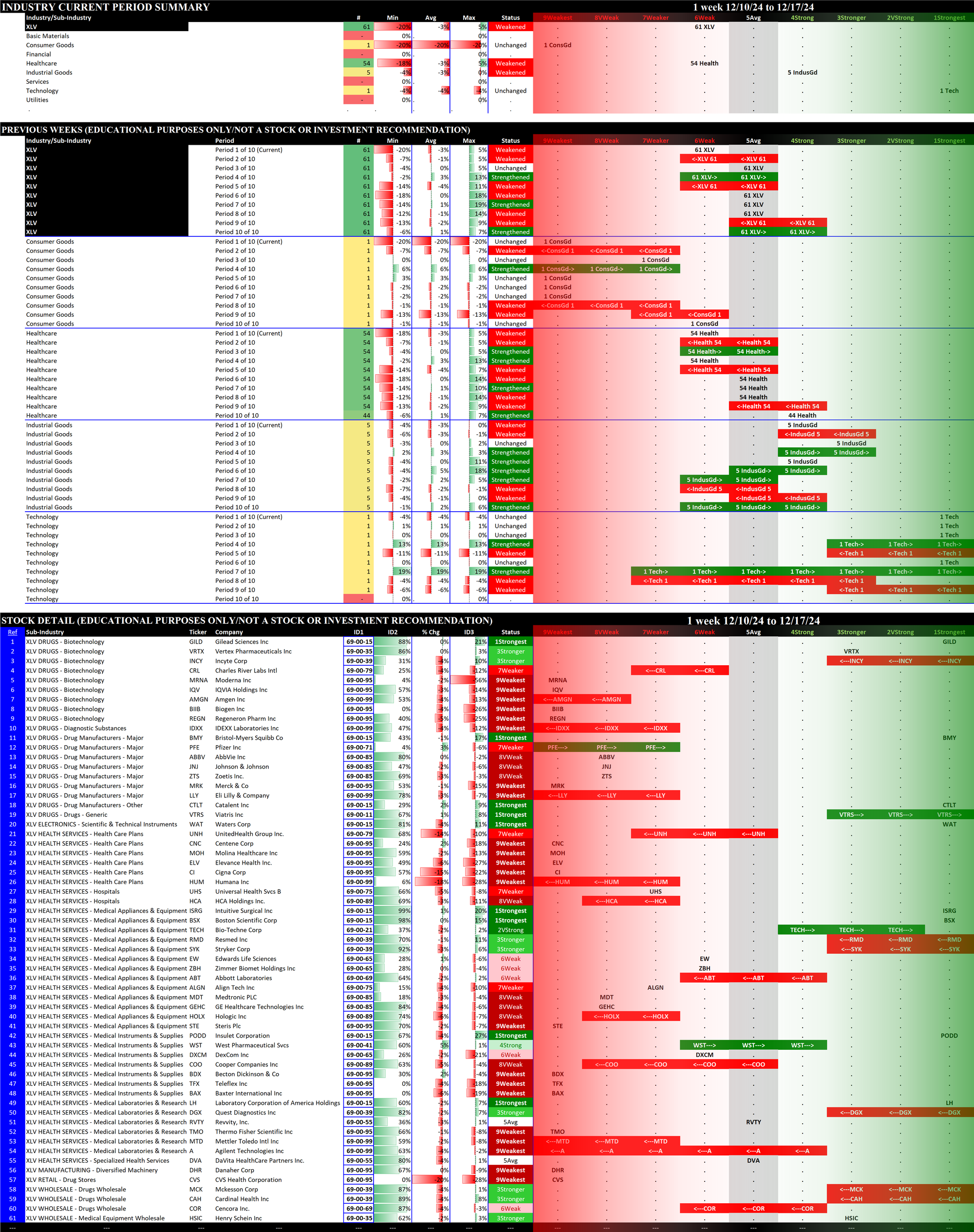The XLK/Technology outlier to the upside was AVGO/Broadcom +40% which began the week and remained a 1Strongest stock. The XLV/Health Care outlier to the downside was CVS/CVS Health Corporation -20% which began the week and remained a 9Weakest stock.