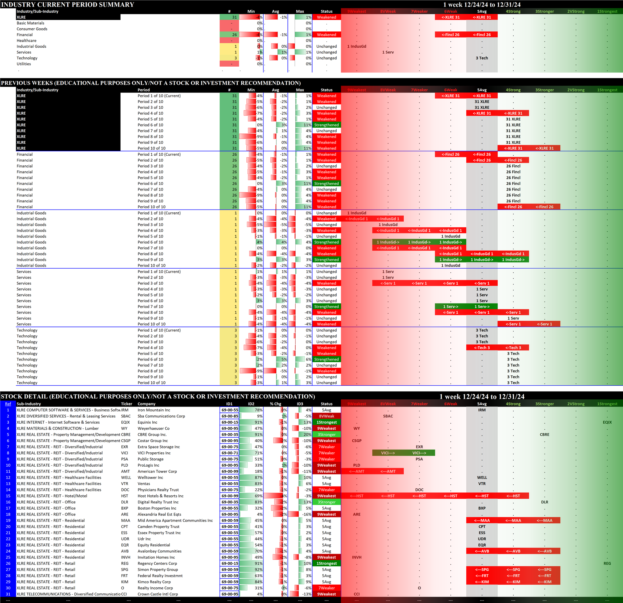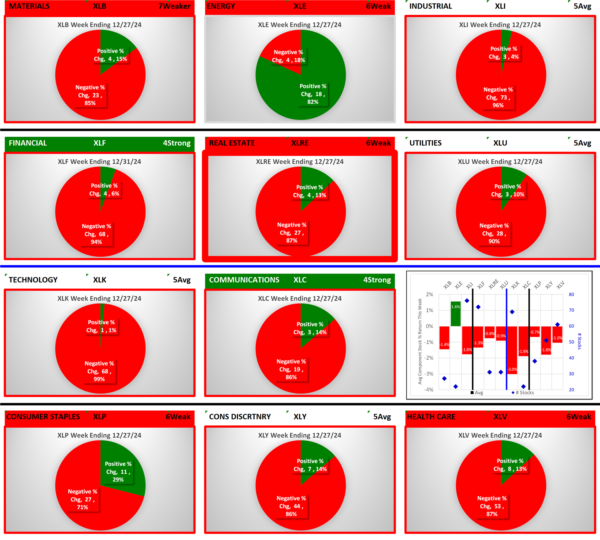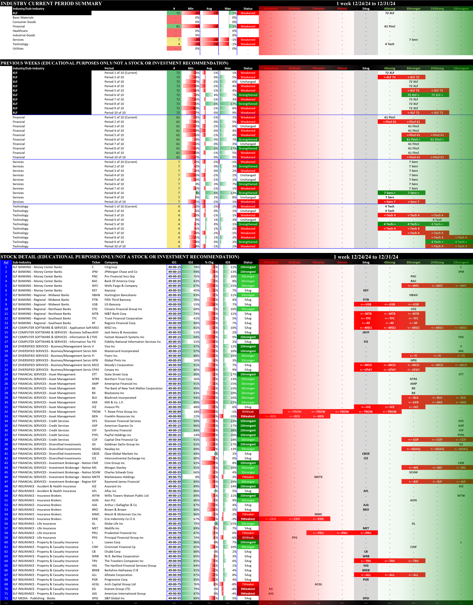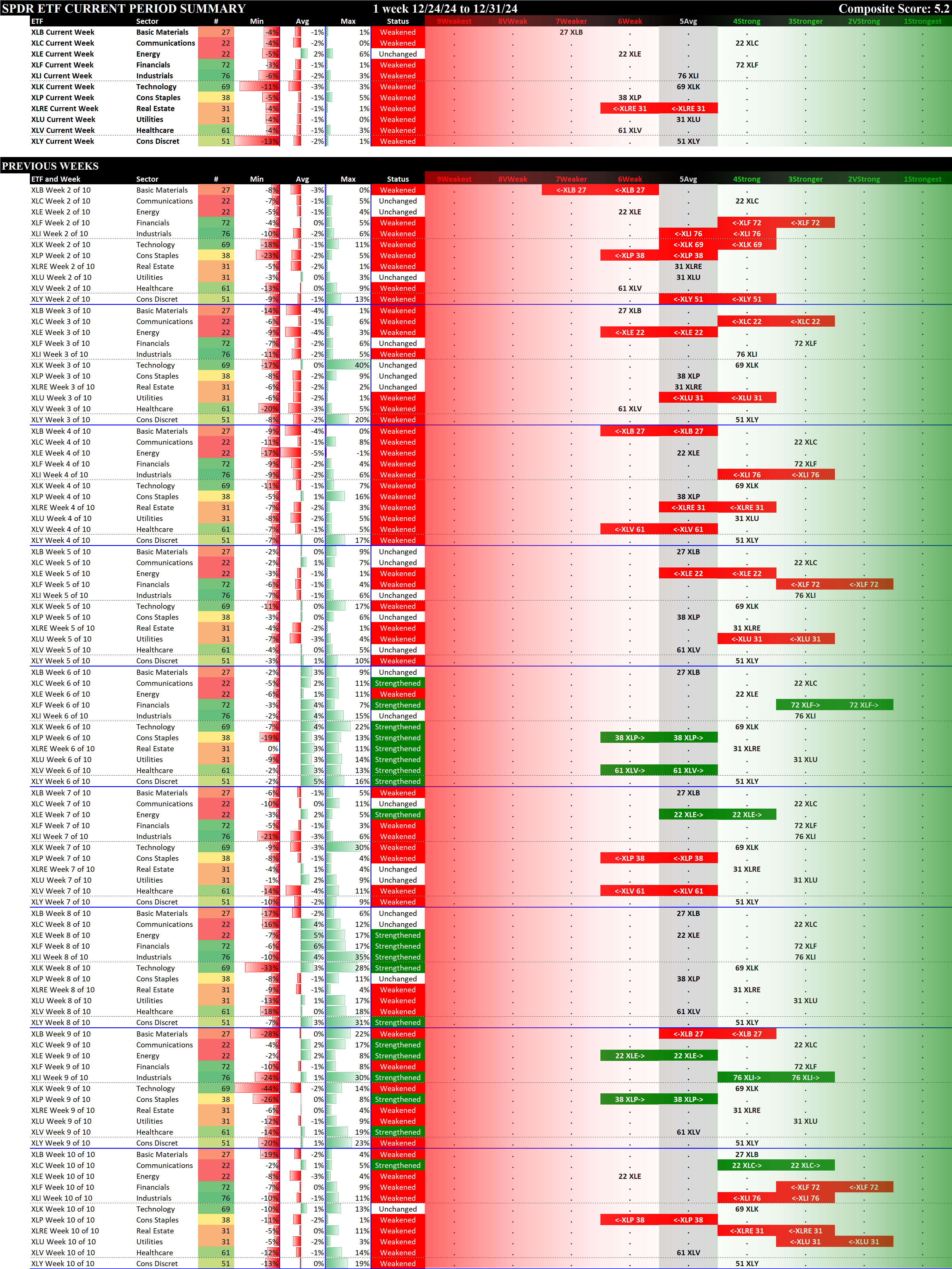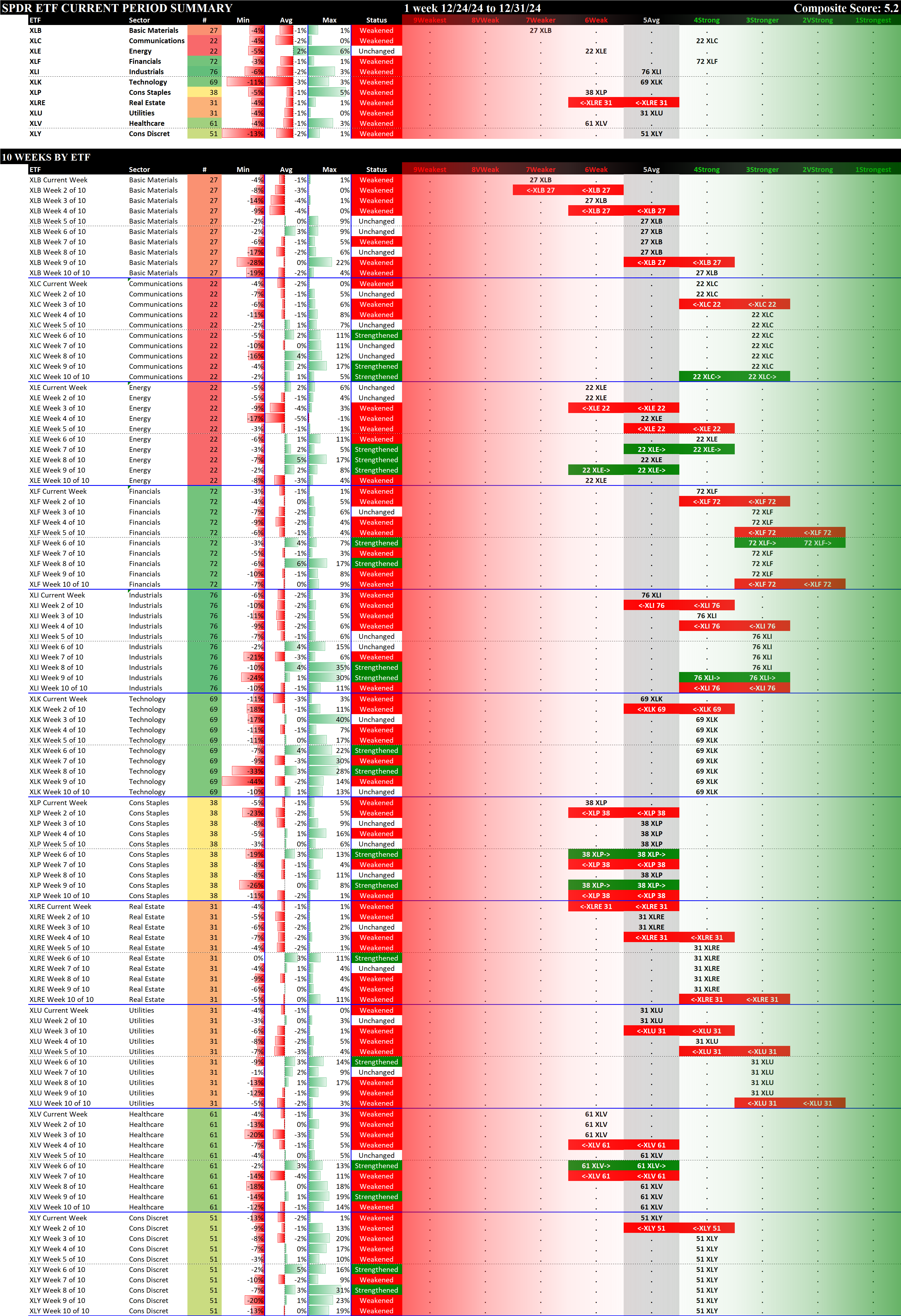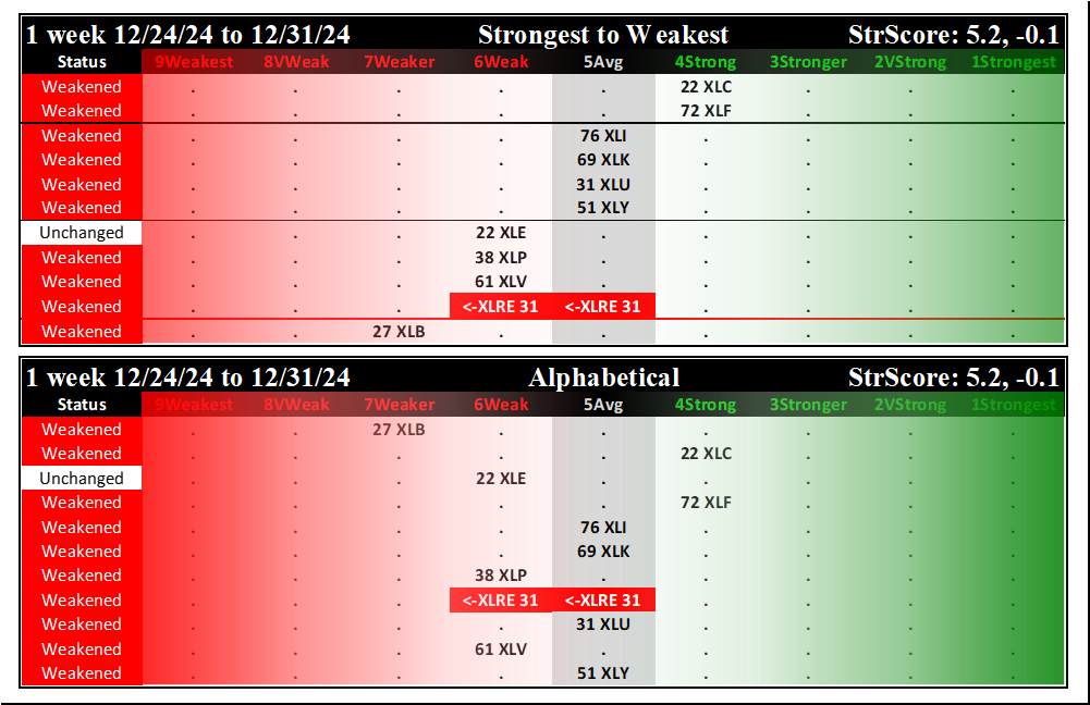 The following Stock Market Organizer strengthening/weakening analysis looks at the 11 SPDR ETFs and their underlying component stocks for the week ending Tuesday 2024-12-31, as follows:
