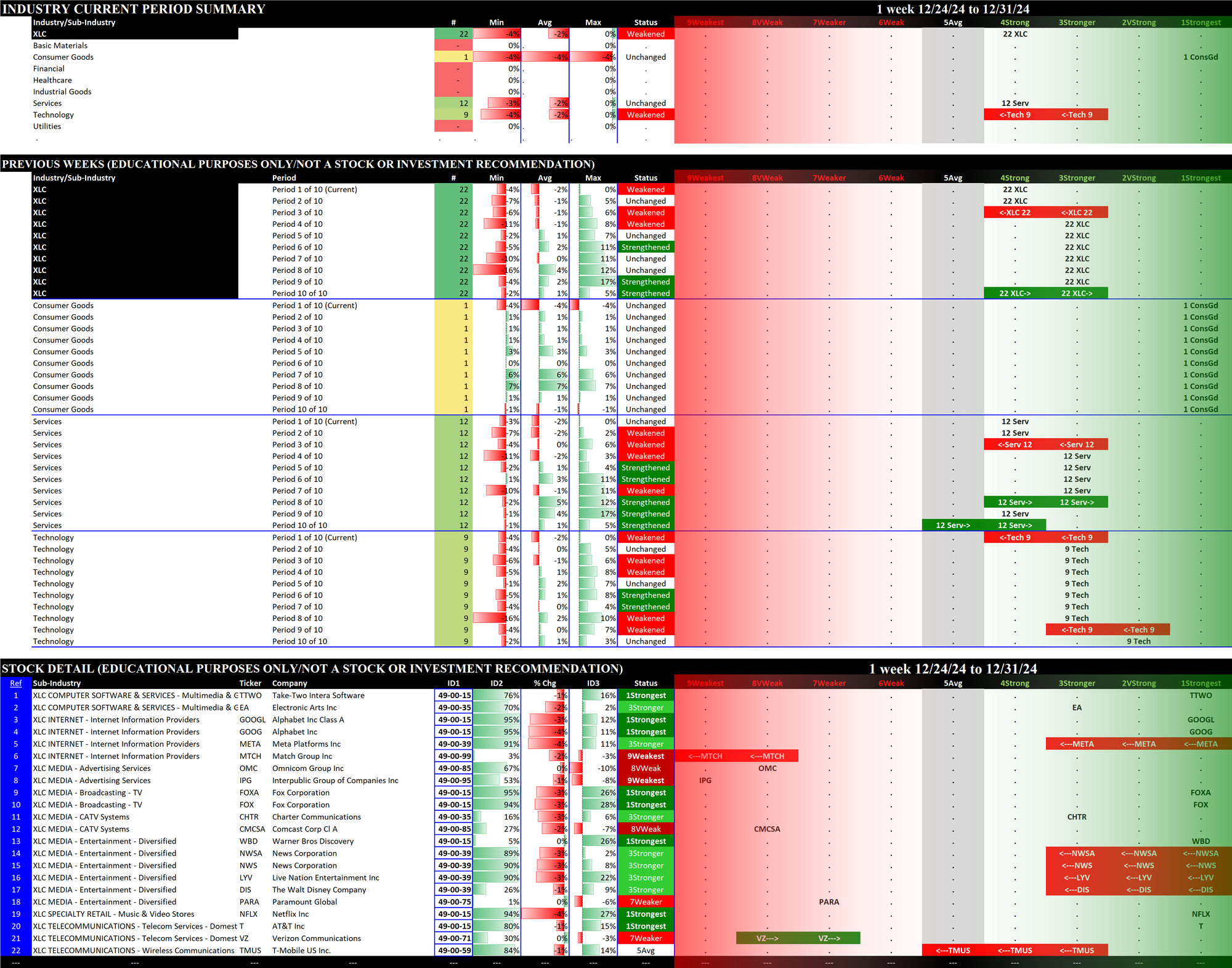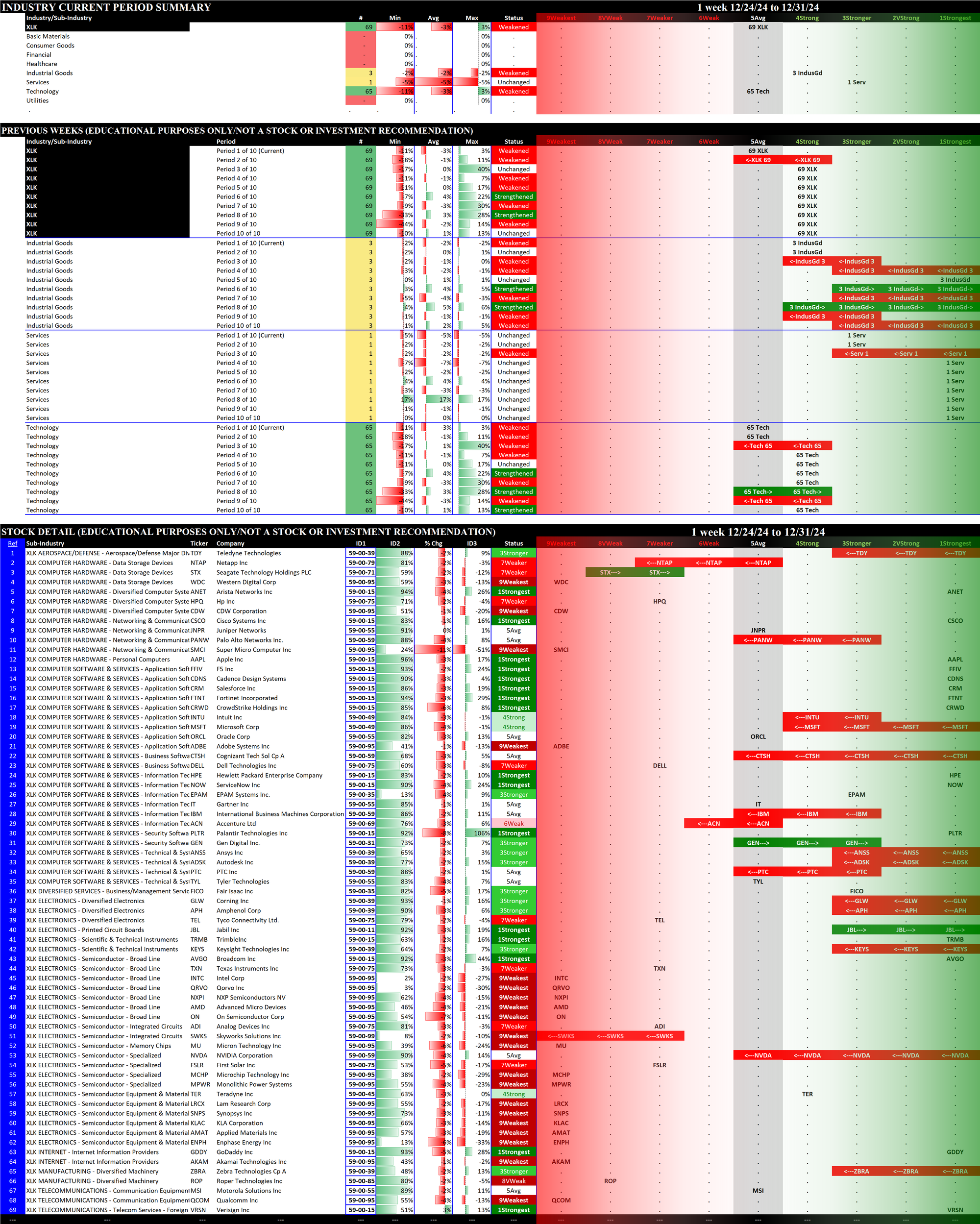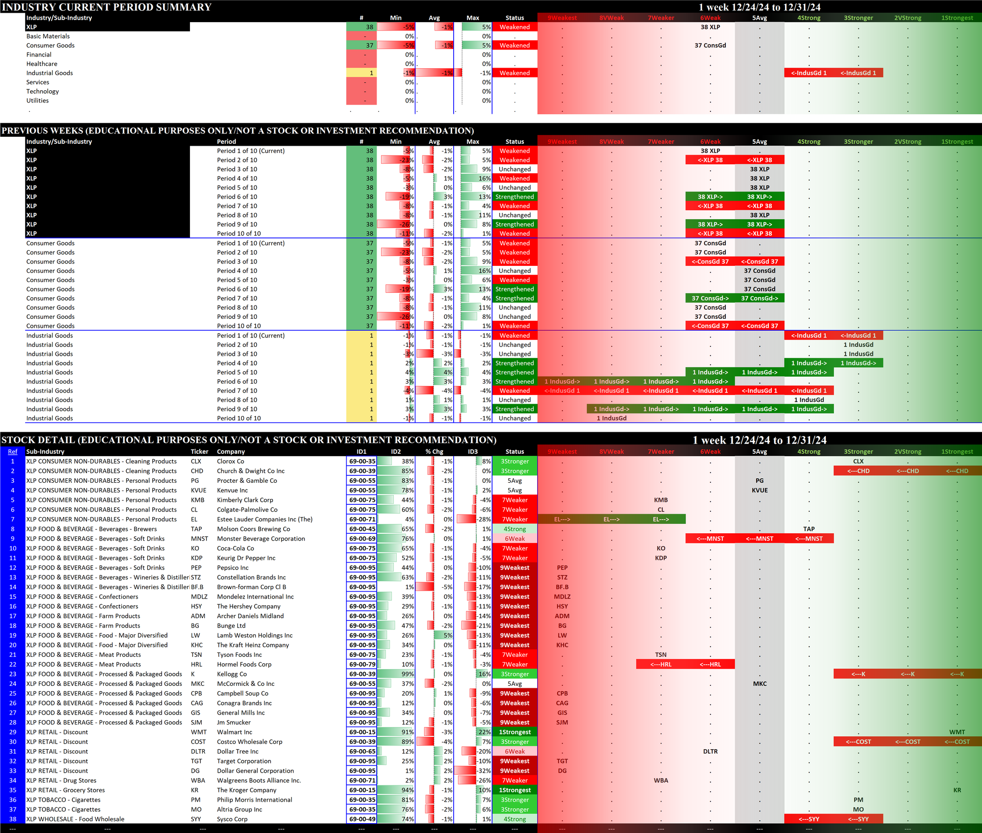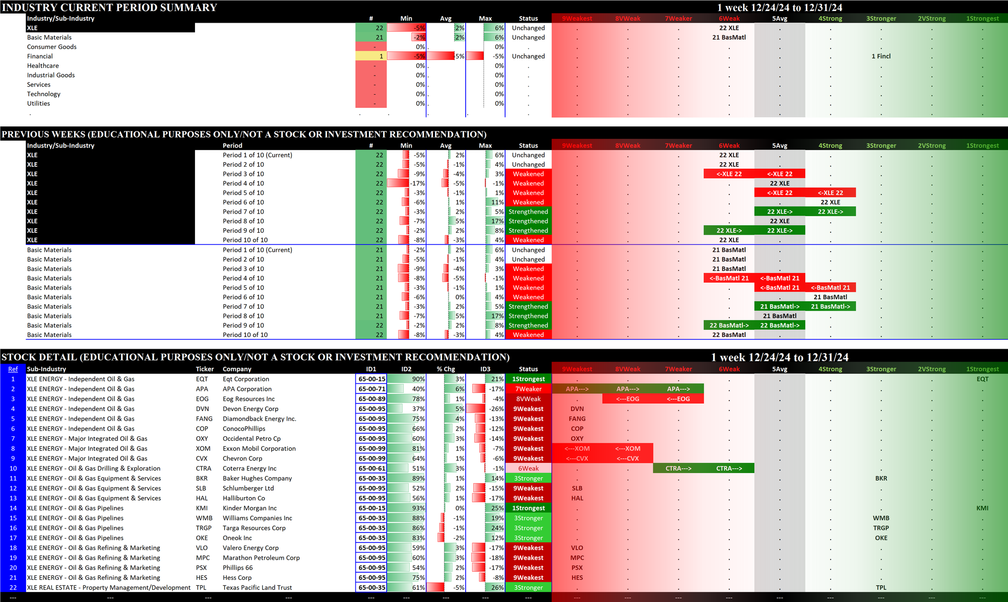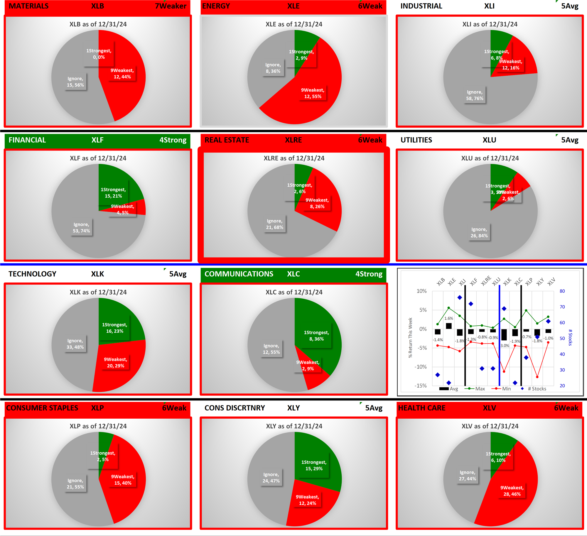 The following Stock Market Organizer strengthening/weakening analysis looks at the 11 SPDR ETFs and their underlying component stocks for the week ending Tuesday 2024-12-31, as follows: