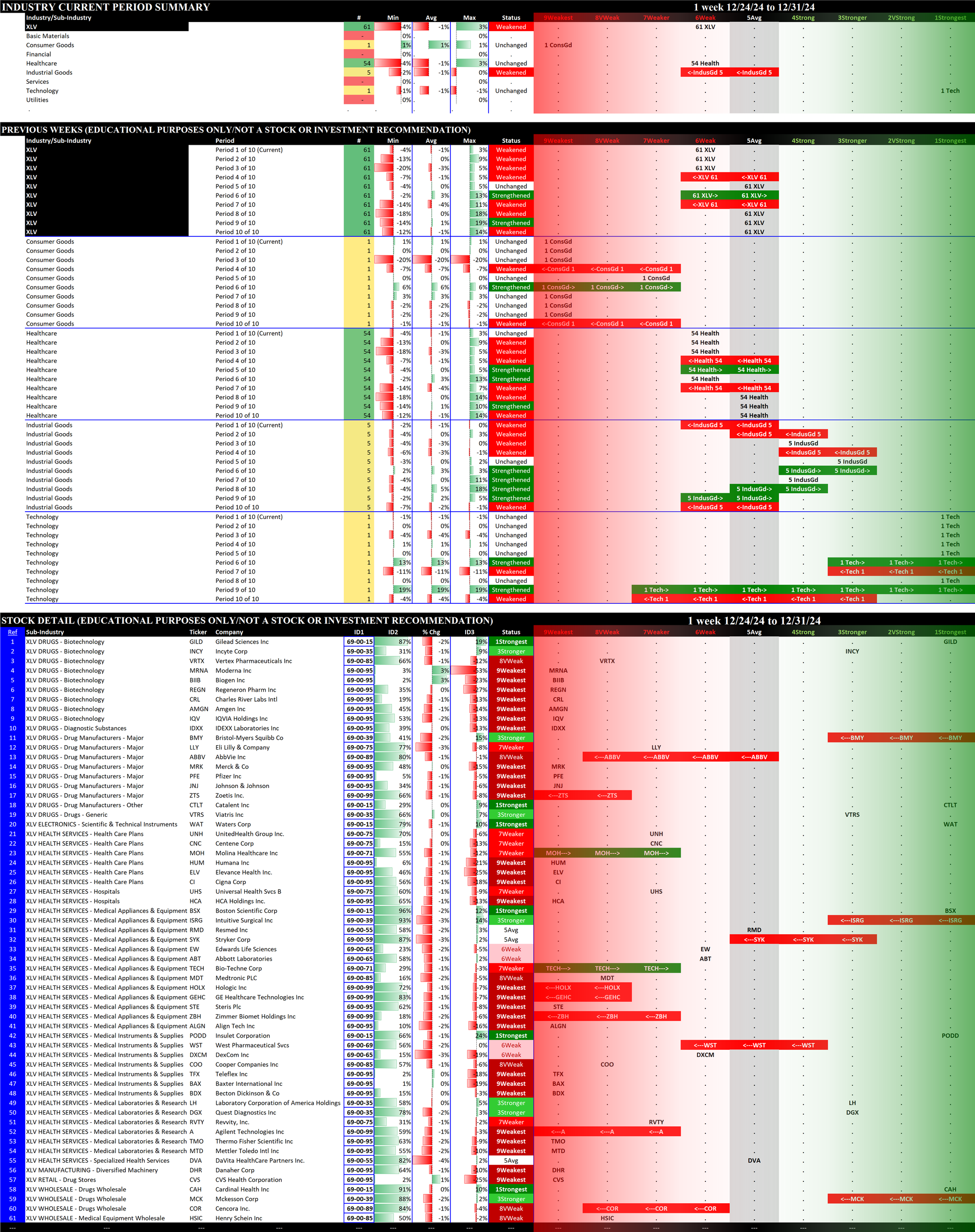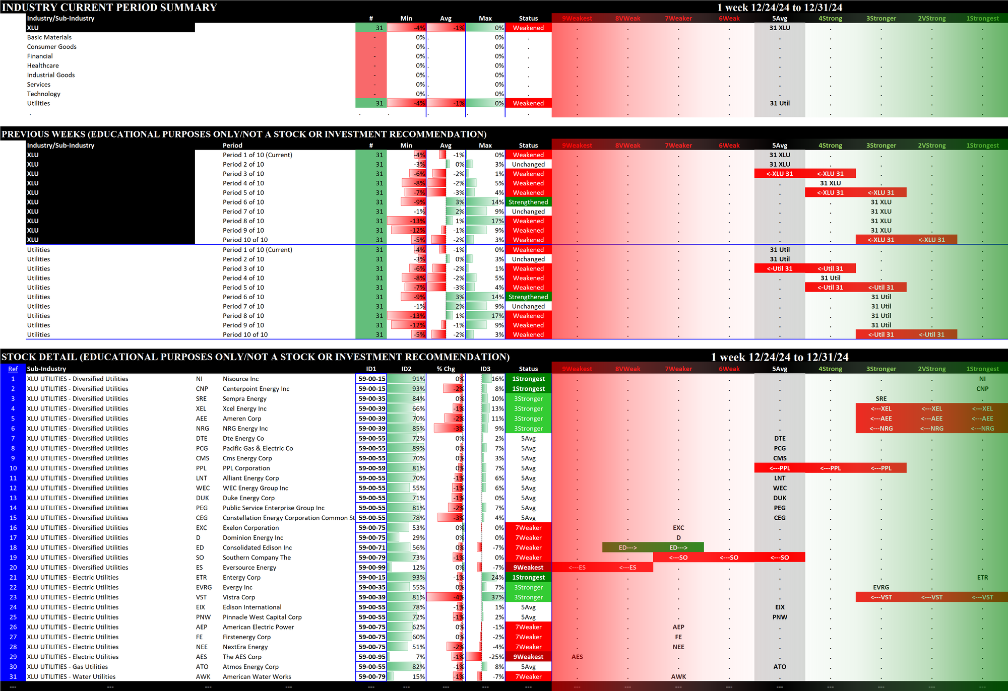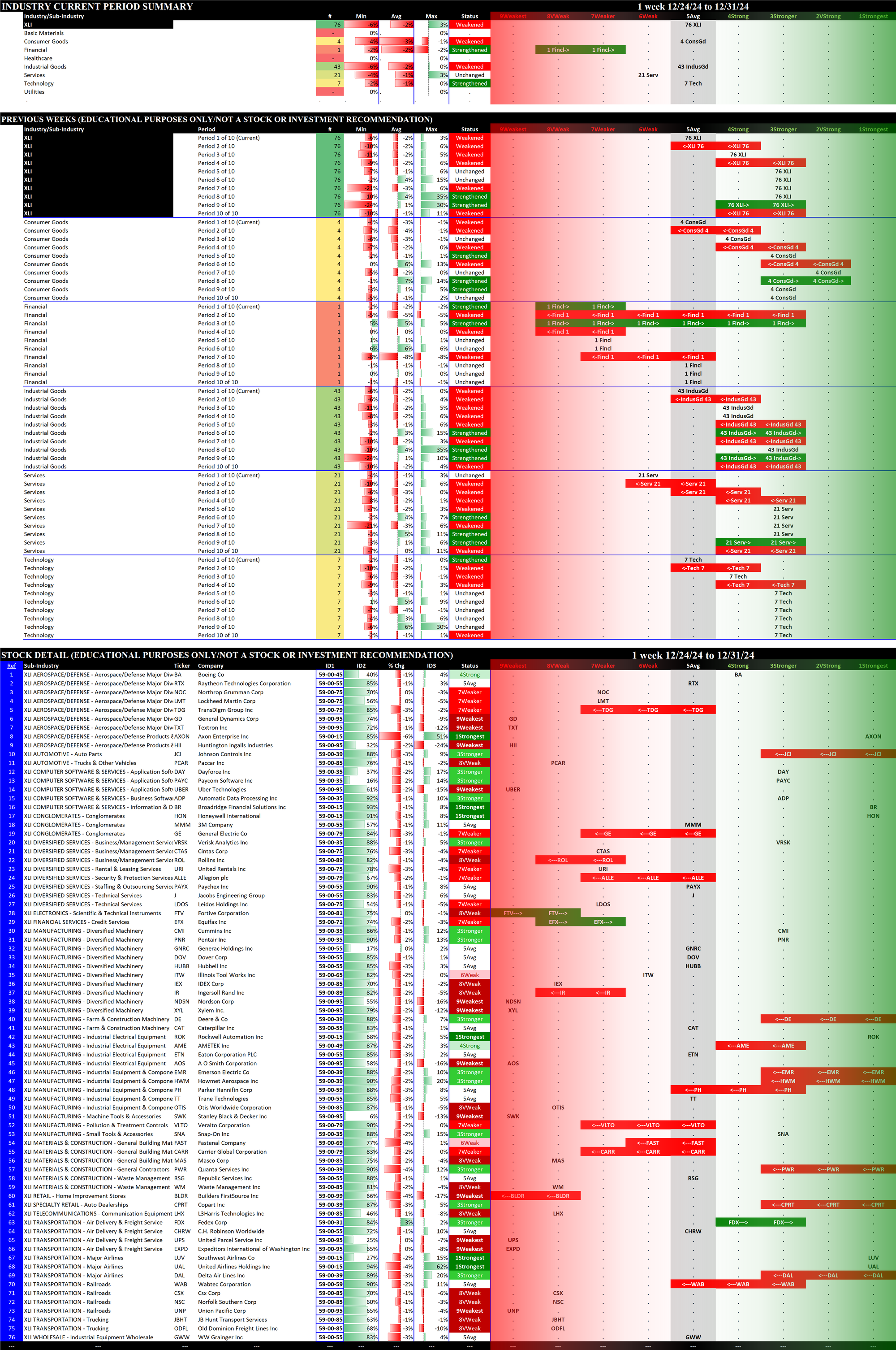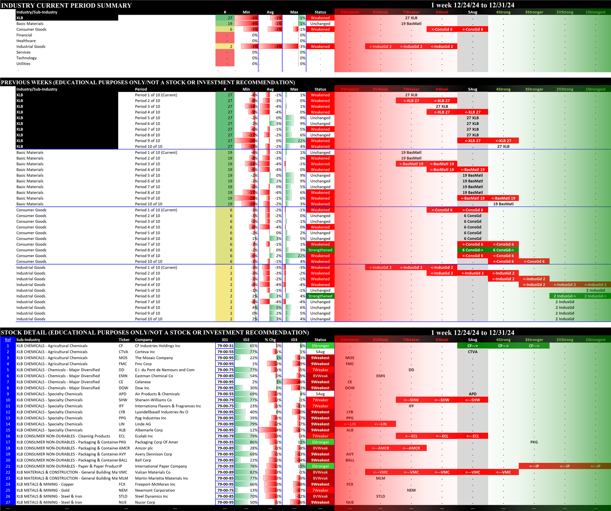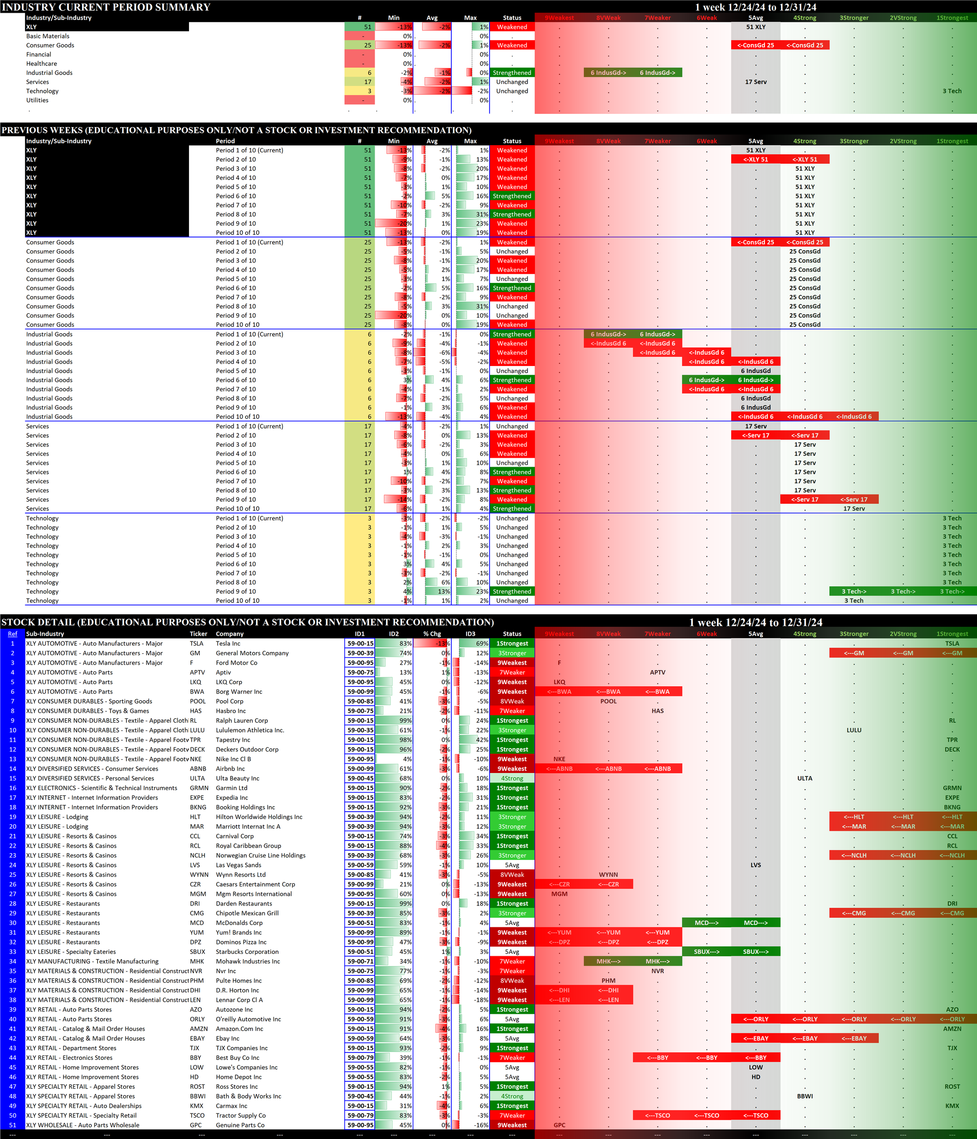 The following Stock Market Organizer strengthening/weakening analysis looks at the 11 SPDR ETFs and their underlying component stocks for the week ending Tuesday 2024-12-31, as follows: