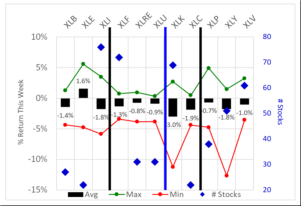 XLE/Energy was the relative strong performer this week as the only sector with a majority of positive stocks this week and the highest and only positive average return at +1.6%.