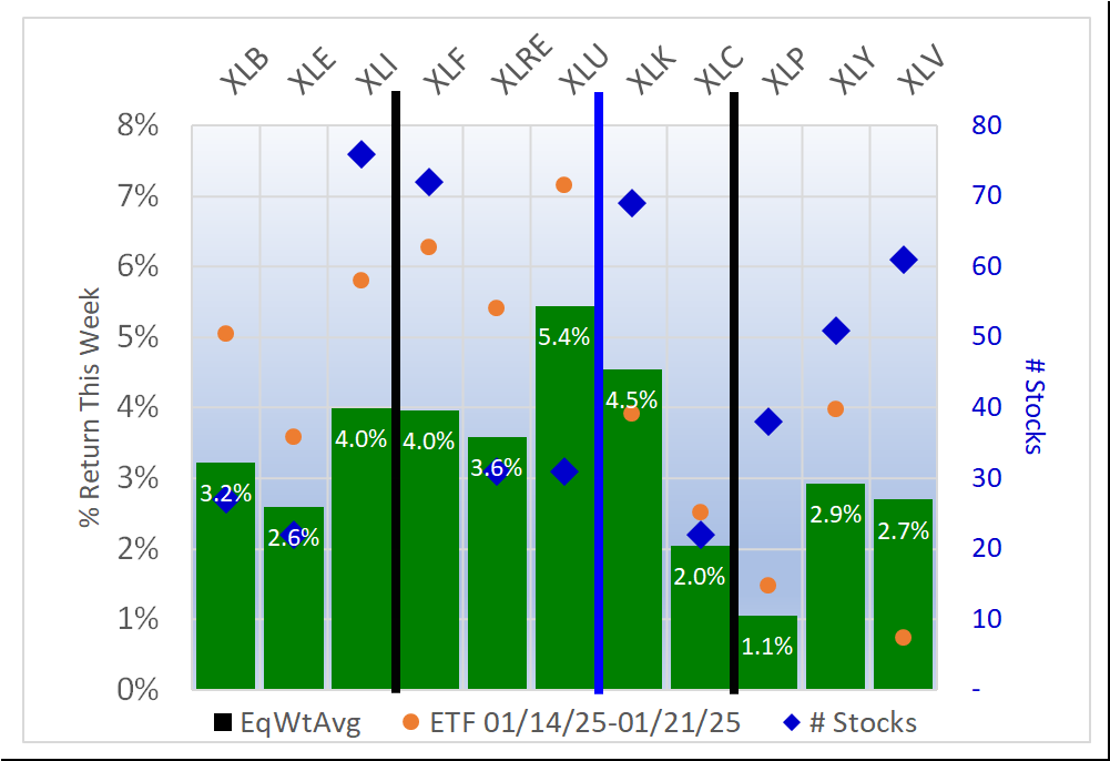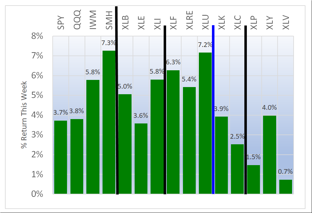 All 11 ETFs had positive average returns for the week. XLU/Utilities had the highest positive average return at +5.4%.