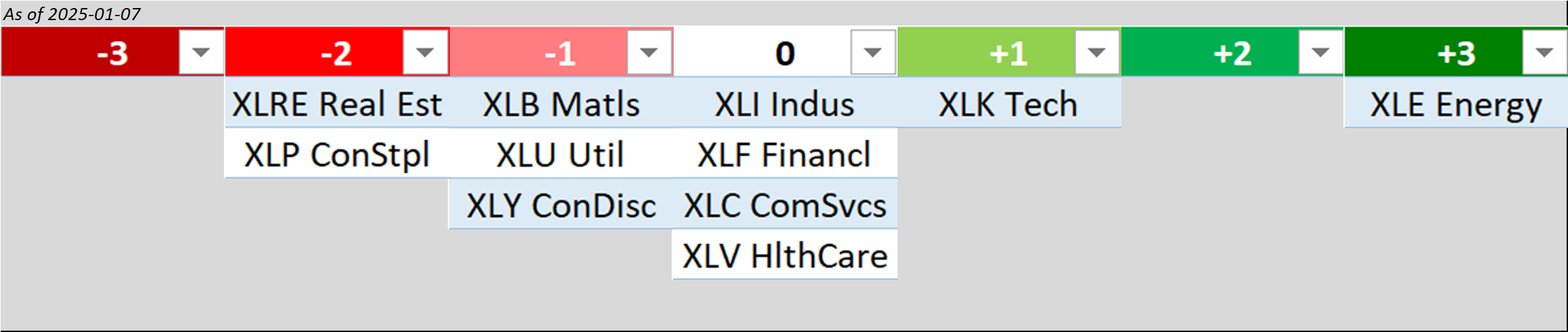 - Bottom row: XLP/Consumer Staples, XLY/Consumer Discretionary, and XLV/Health Care