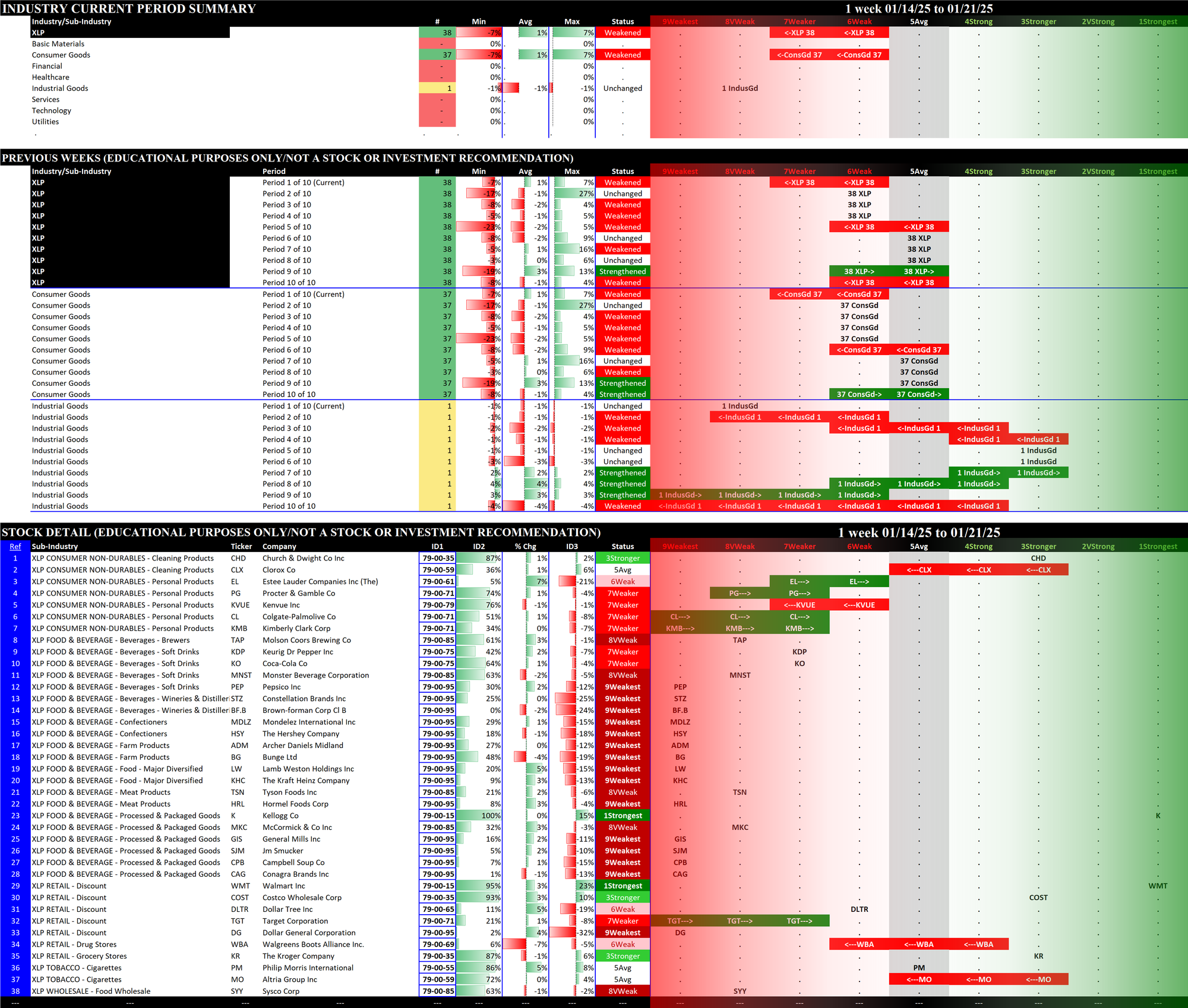 2.7 XLP Consumer Staples (38 stocks, mid-sized), WEAKENED RATING TO 7Weaker = WORST