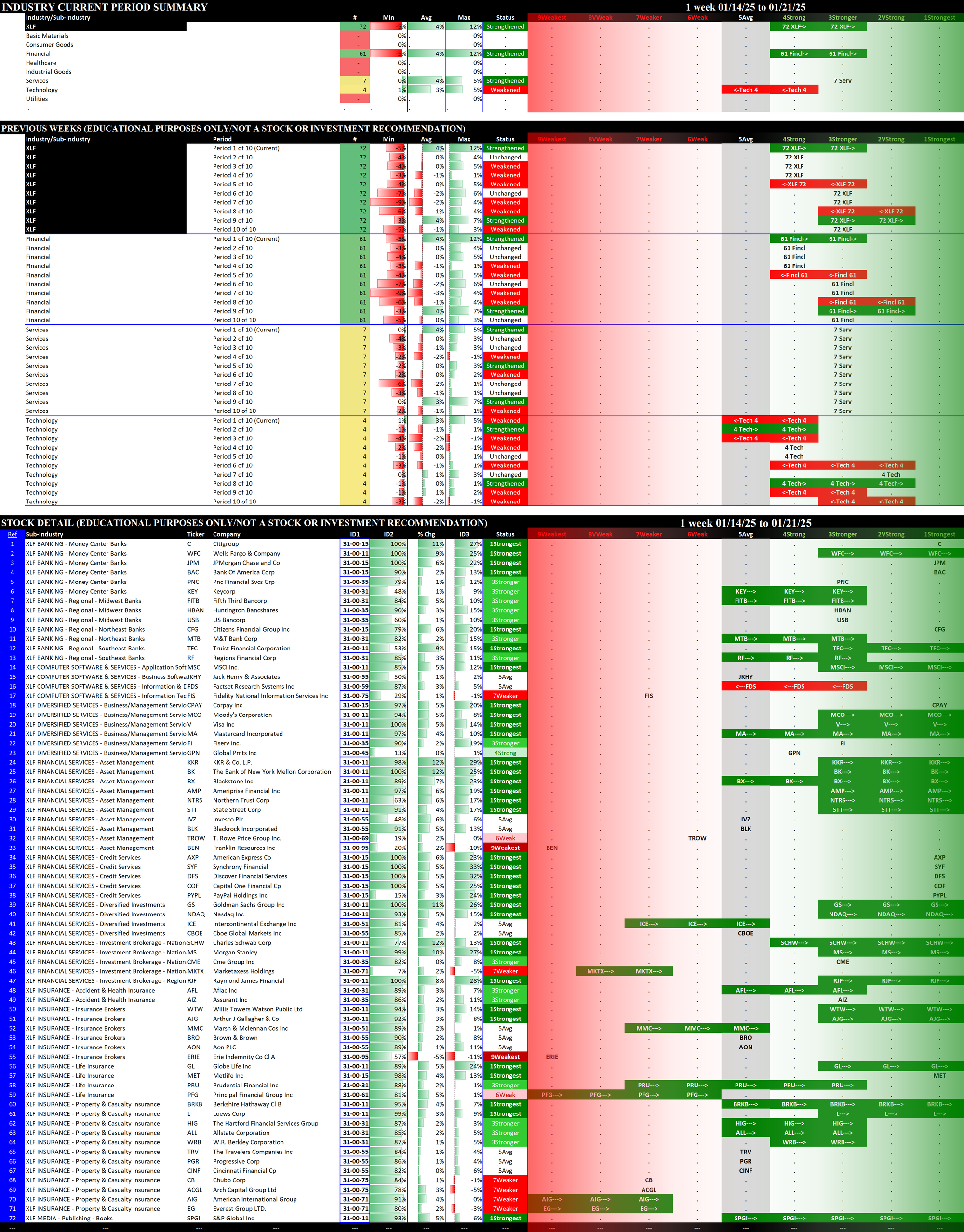 Below are 10-week historical strength rating summaries of the ETFs, sorted by week - each grouping shows one week for all 11 ETFs in newest-to-oldest format. This reveals the weekly strengthening/weakening path of all the ETFs.