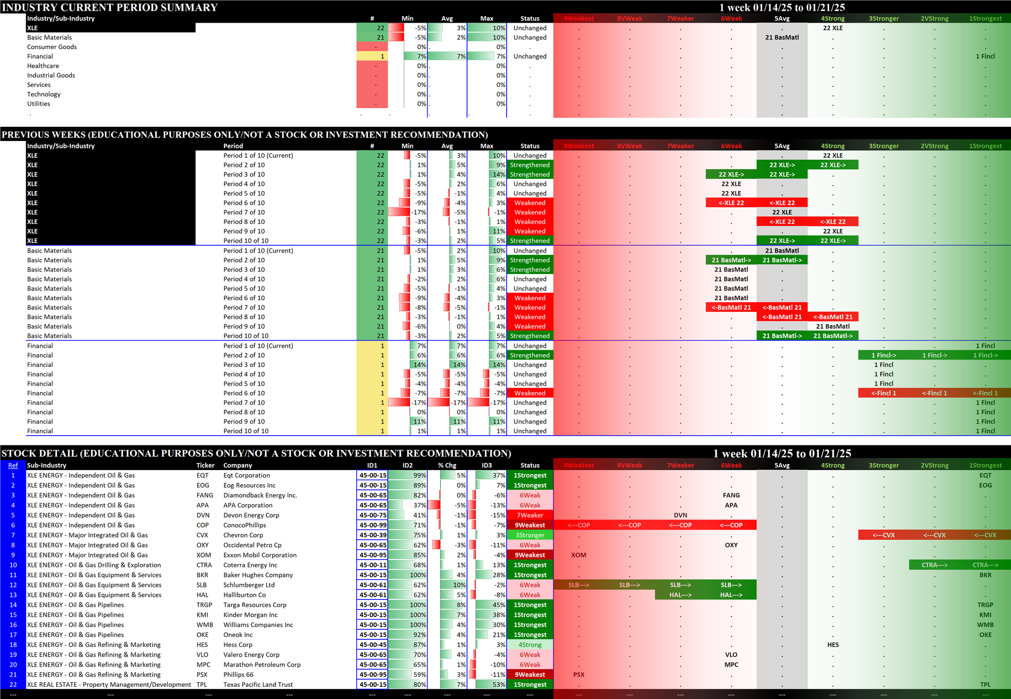- The middle section shows the previous 10 weeks' strengthening and weakening of the relevant sectors. For example, since the XLB has Basic Materials, Consumer Goods, and Industrial Goods stocks, these three sectors are shown in the middle section of the XLB detail. The XLF (Financial) has Financial, Services, and Tech stocks.