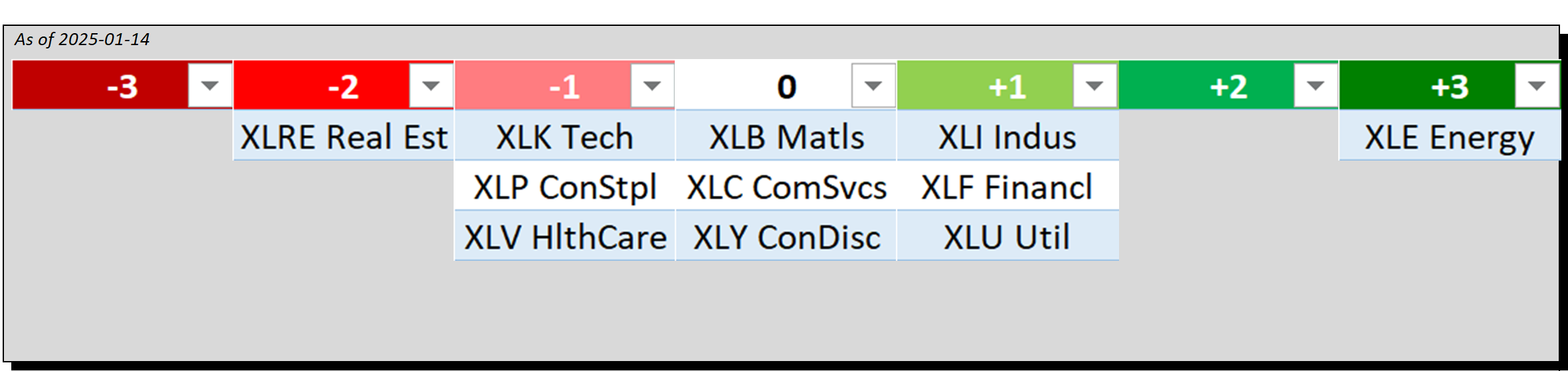 - Bottom row: XLP/Consumer Staples, XLY/Consumer Discretionary, and XLV/Health Care