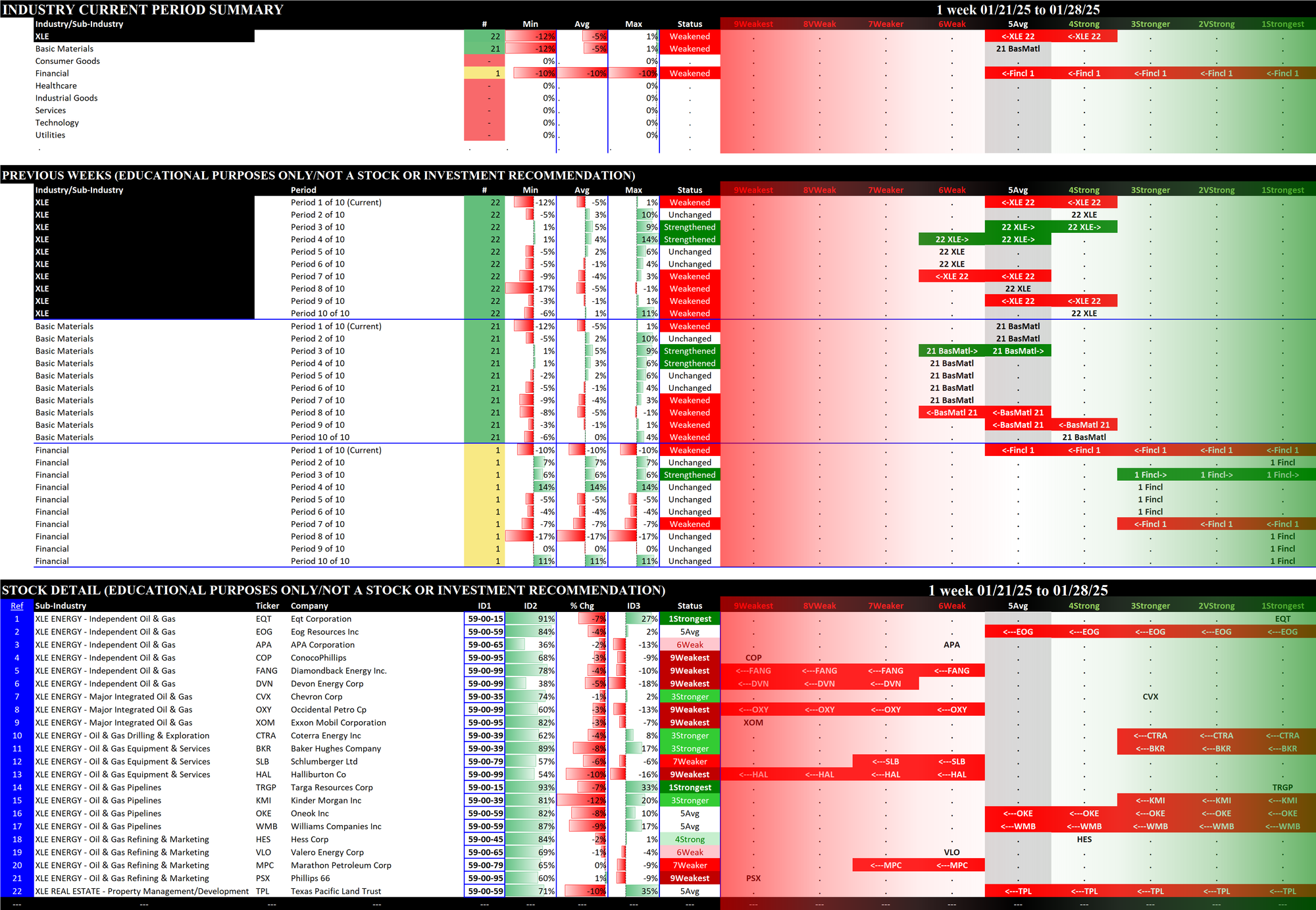 - The middle section shows the previous 10 weeks' strengthening and weakening of the relevant sectors. For example, since the XLB has Basic Materials, Consumer Goods, and Industrial Goods stocks, these three sectors are shown in the middle section of the XLB detail. The XLF (Financial) has Financial, Services, and Tech stocks.