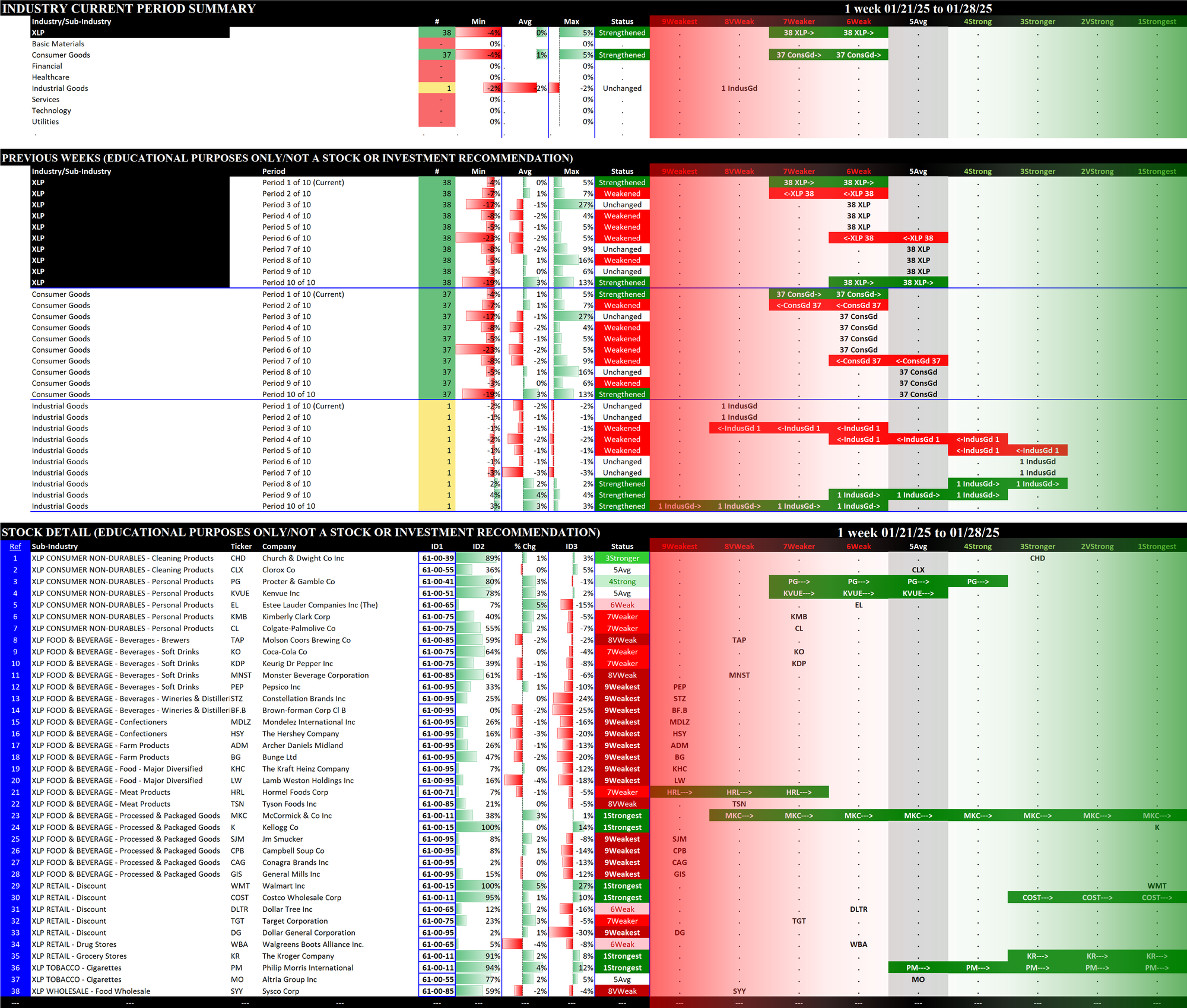2.7 XLP Consumer Staples (38 stocks, mid-sized), STRENGTHENED RATING TO 6Weak = tied for WORST