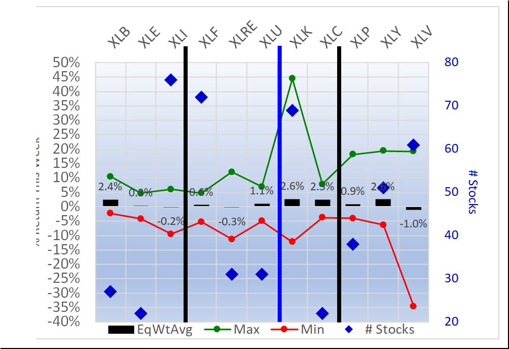- XLY/Consumer Discretionary, 2.6% average for 51 stocks