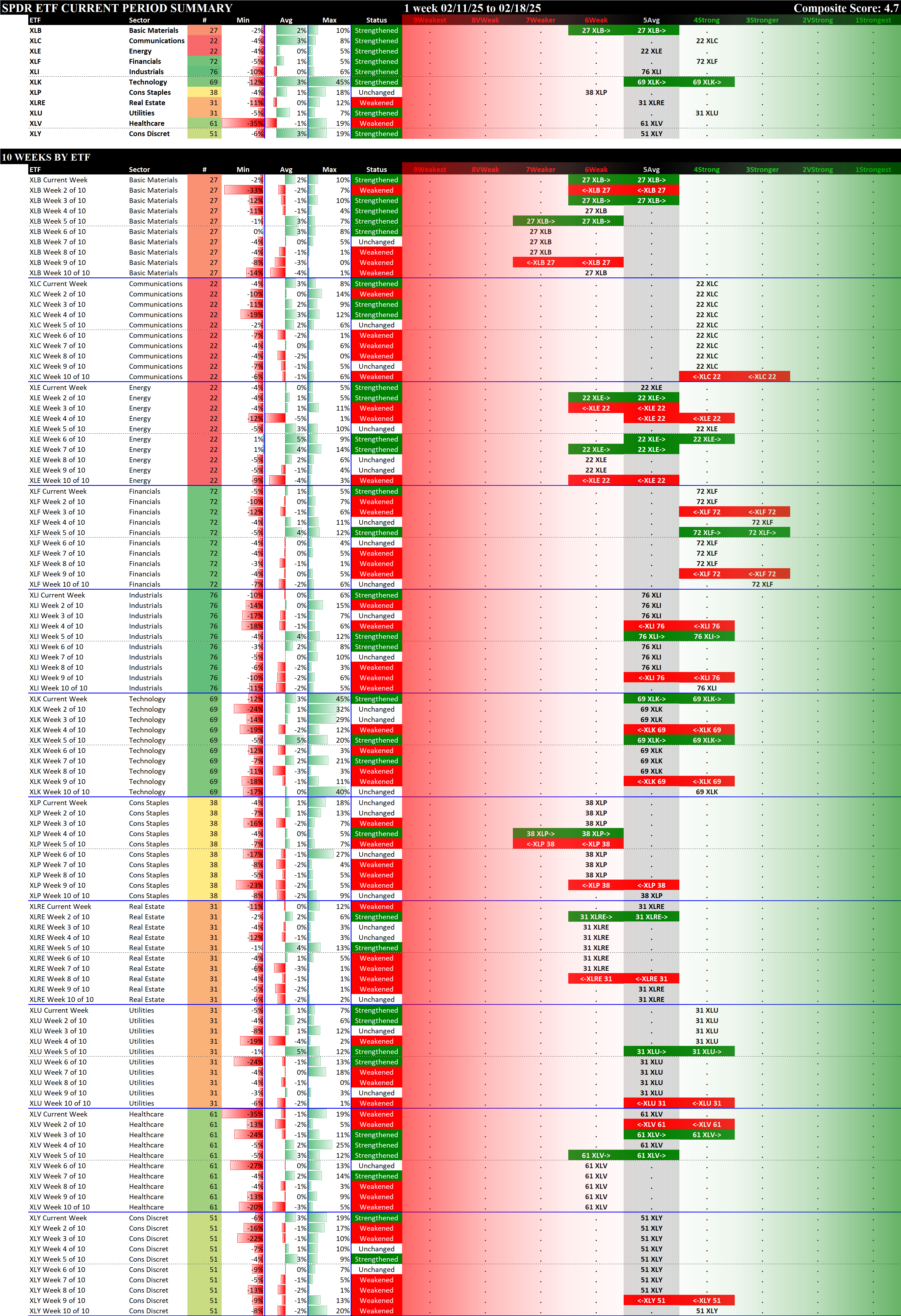 Below are 10-week historical strength rating summaries of the ETFs, sorted by week - each grouping shows one week for all 11 ETFs in newest-to-oldest format. This reveals the weekly strengthening/weakening path of all the ETFs.
