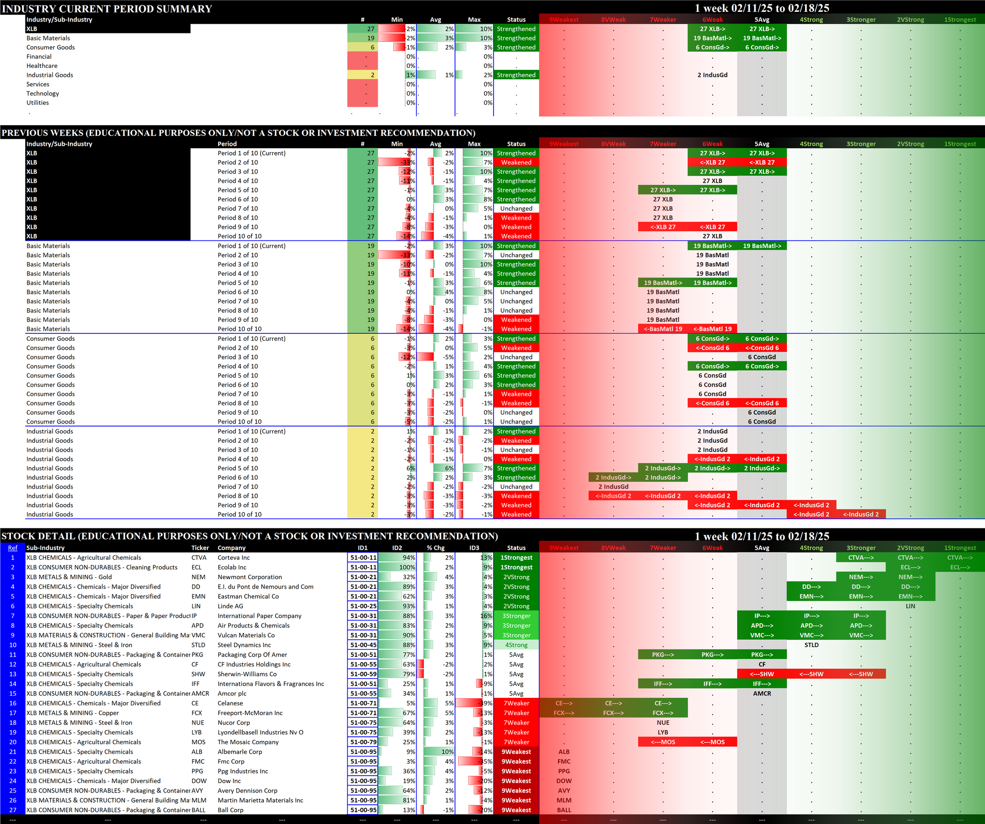 - The bottom section shows strengthening/weakening for the underlying ETF component stocks, and includes the listing of their Stock Market Organizer industries and sub-industries. These stocks are listed in order based on Sub-industry then strongest to weakest comparative stock strength rating. The Basic Materials XLB ETF includes both Newmont Corporation/NEM in the Gold sub-industry within the Metals & Mining industry and Dow Inc./DOW in the Specialty Chemicals sub-industry within the Chemicals industry.