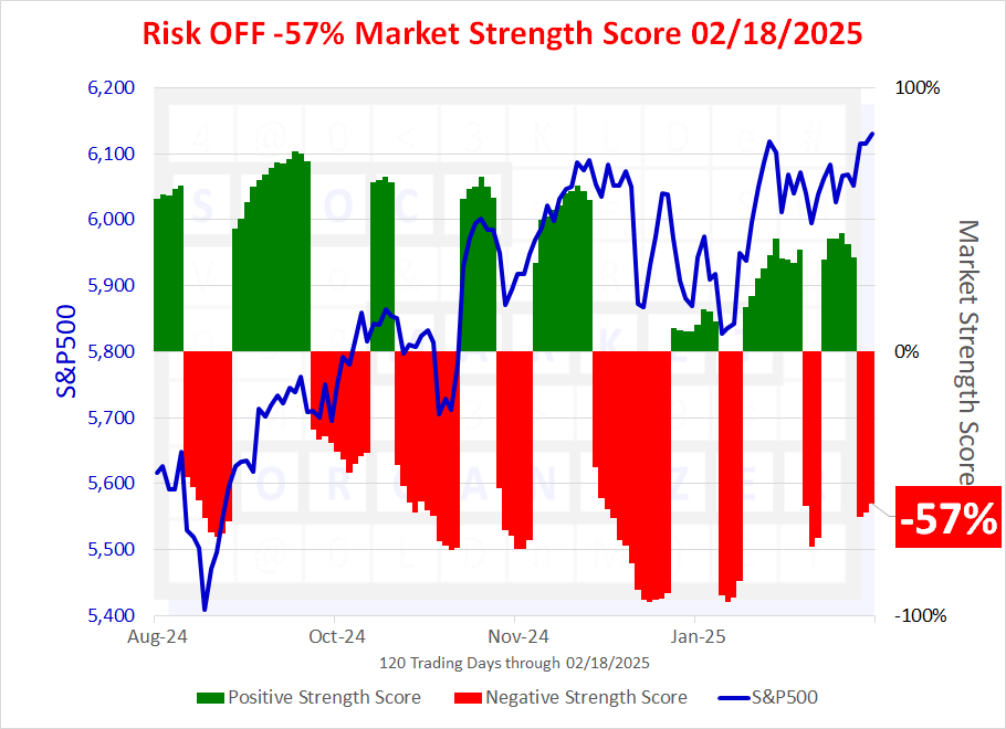 These results are combined with overall market environment readings - the Market Strength Score and the Sector Risk Gauge, which reflect "Risk OFF" as of Thursday, February 13, 2025 - to discern appropriate portfolio exposure and risk/position management given prevailing market and sector conditions. Today the Market Strength Score is -57%, not yet near the extreme of -100%. This is not a prediction that it will go to the extreme of -100%, it is simply highlighting where the market is relative to a potential extreme.
