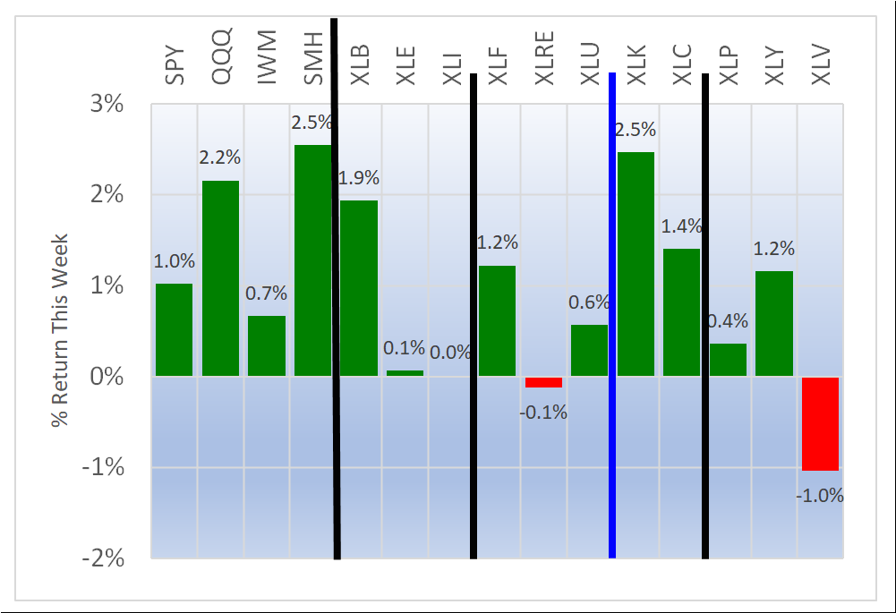 The following pie charts show the breadth of positive and negative returns for the week for the component stocks of each ETF.
