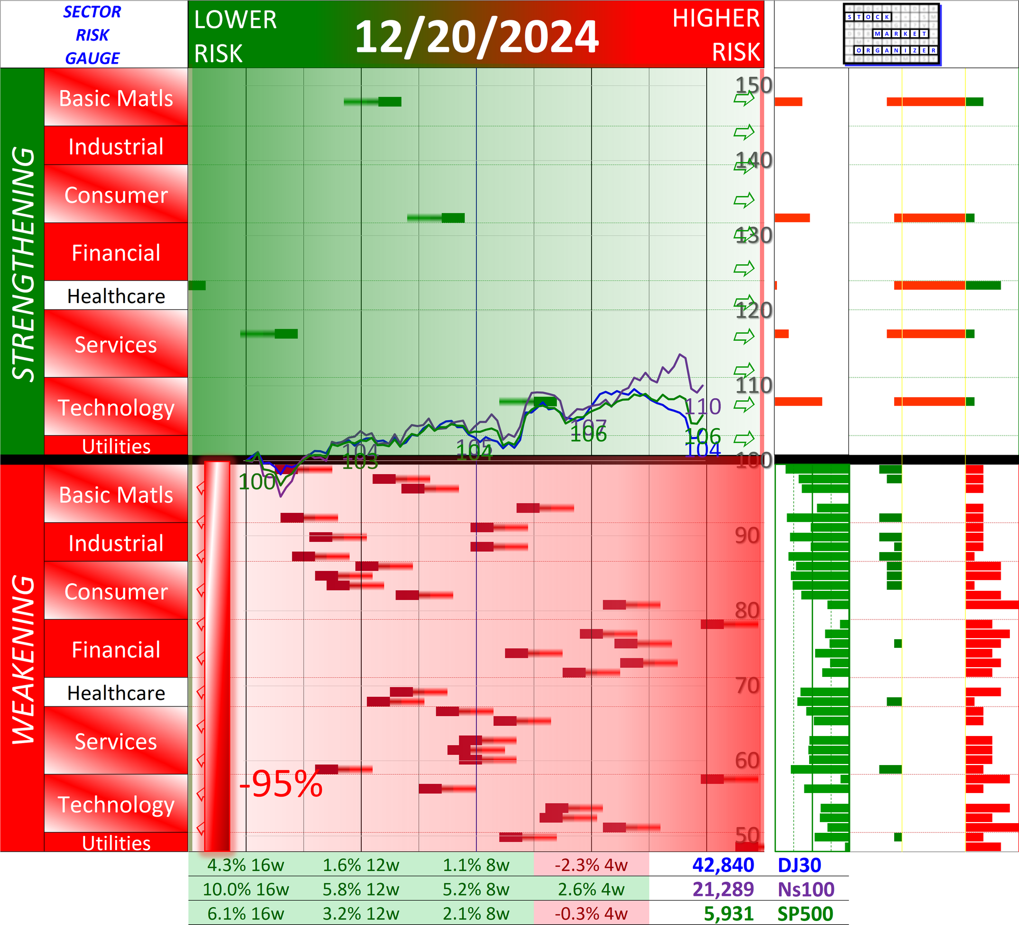 Current 2024-12-20 Sector Risk Gauge, indicative of a -95% Market Strength Score. The underlying objectively measured change depends on the strengthening and weakening of the component industries and sectors.