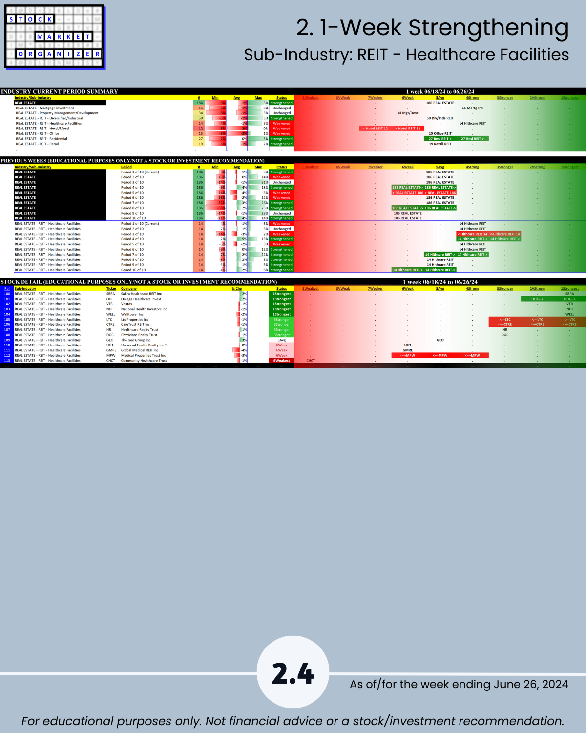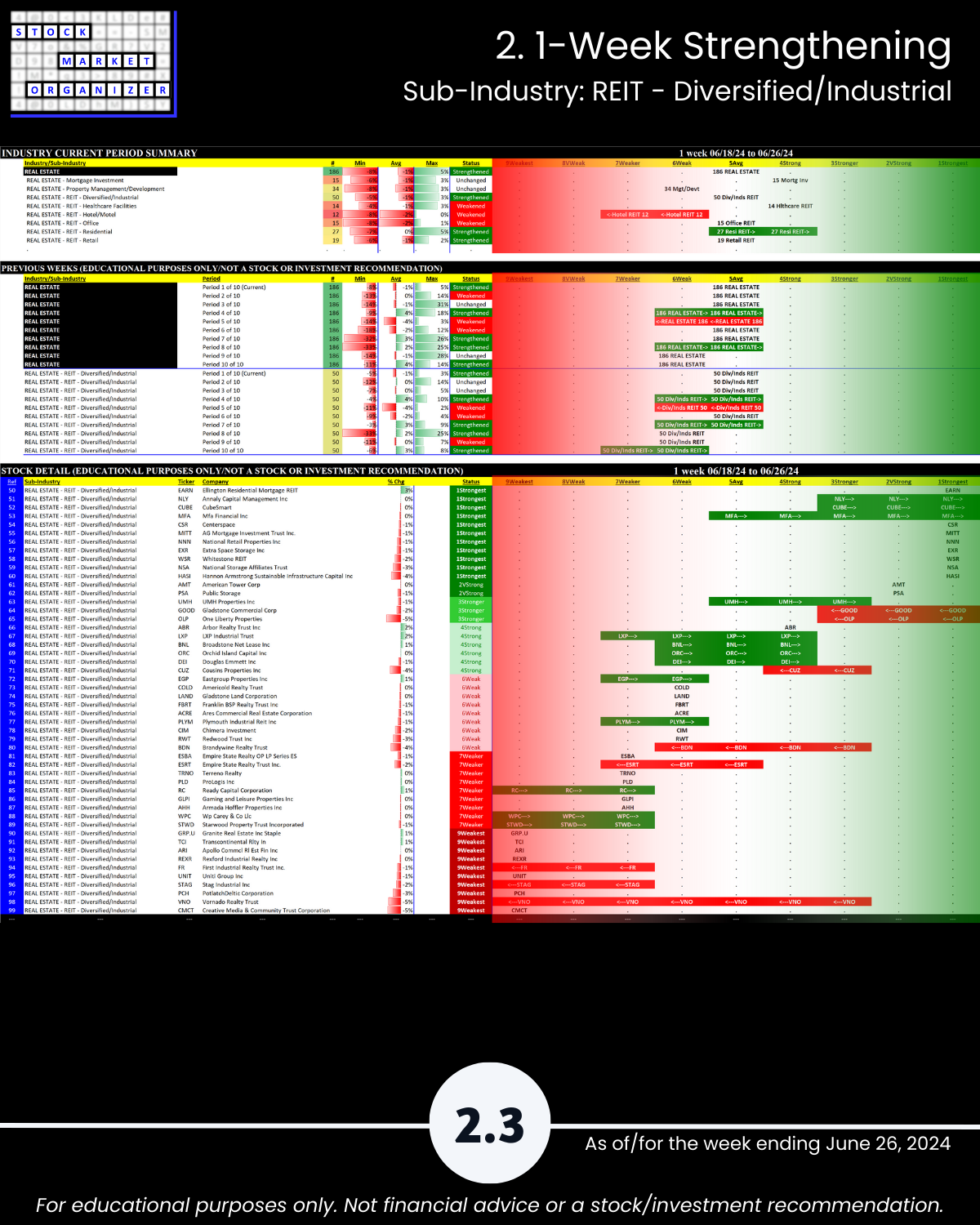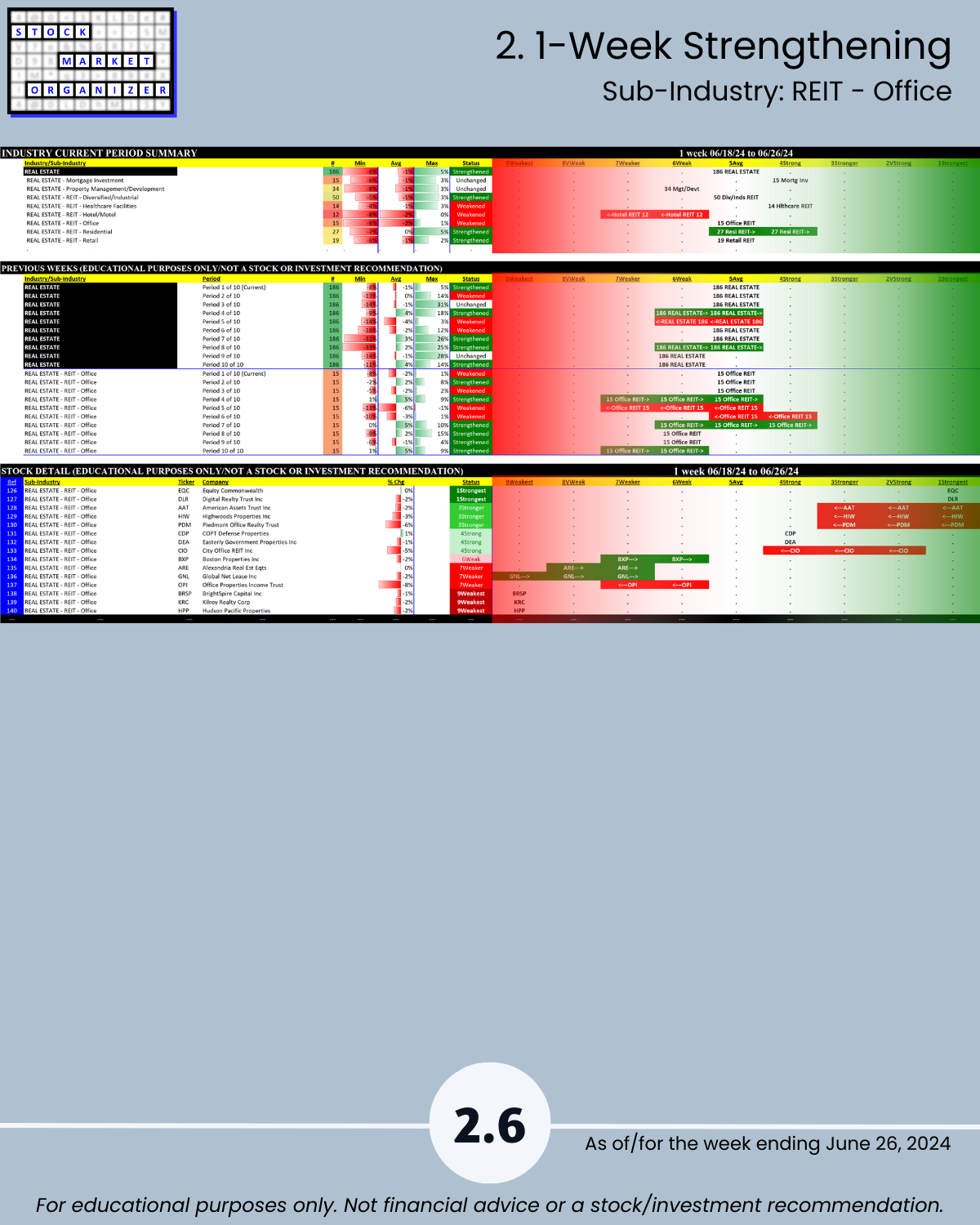 Commercial Real Estate fans, this 6/26/24 report is for you. Ranked based on current strength: 186 stocks in 8 sub-industries. You won’t find this anywhere else, because I created it from scratch. Sincere questions: would you rather own a strong stock in a strengthening sub-industry or a weak stock in a weakening sub-industry? And, how do you discern this?