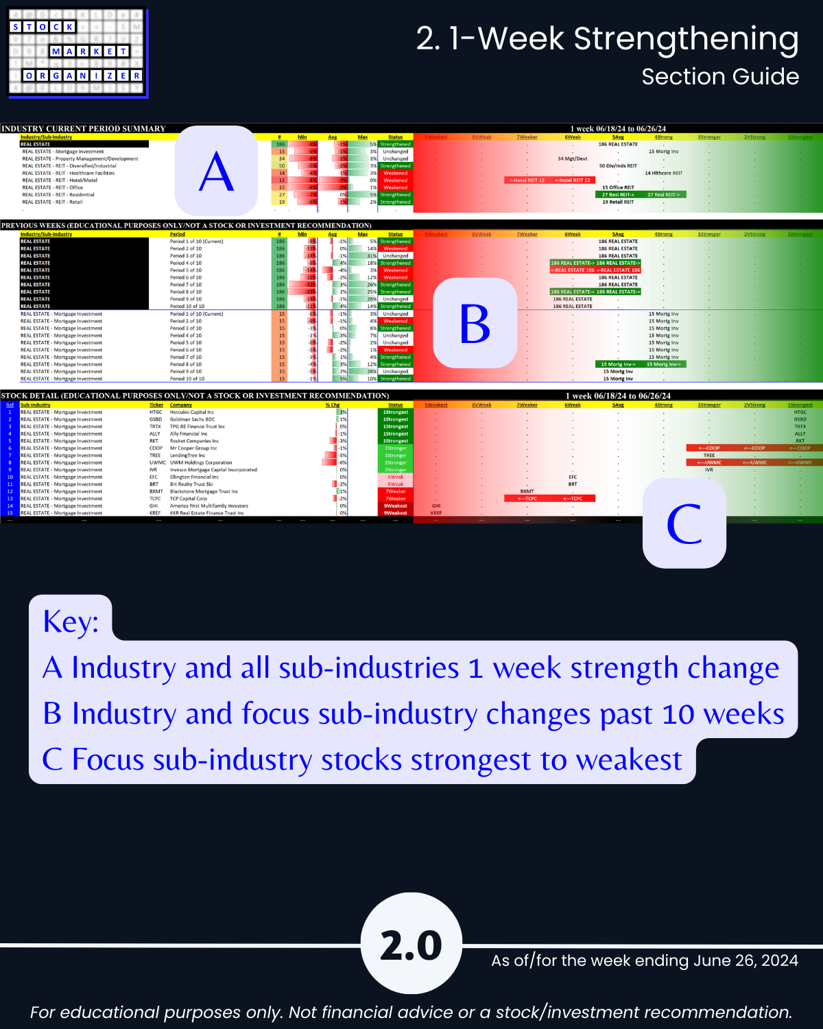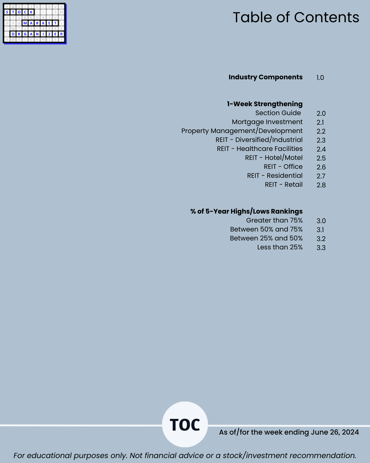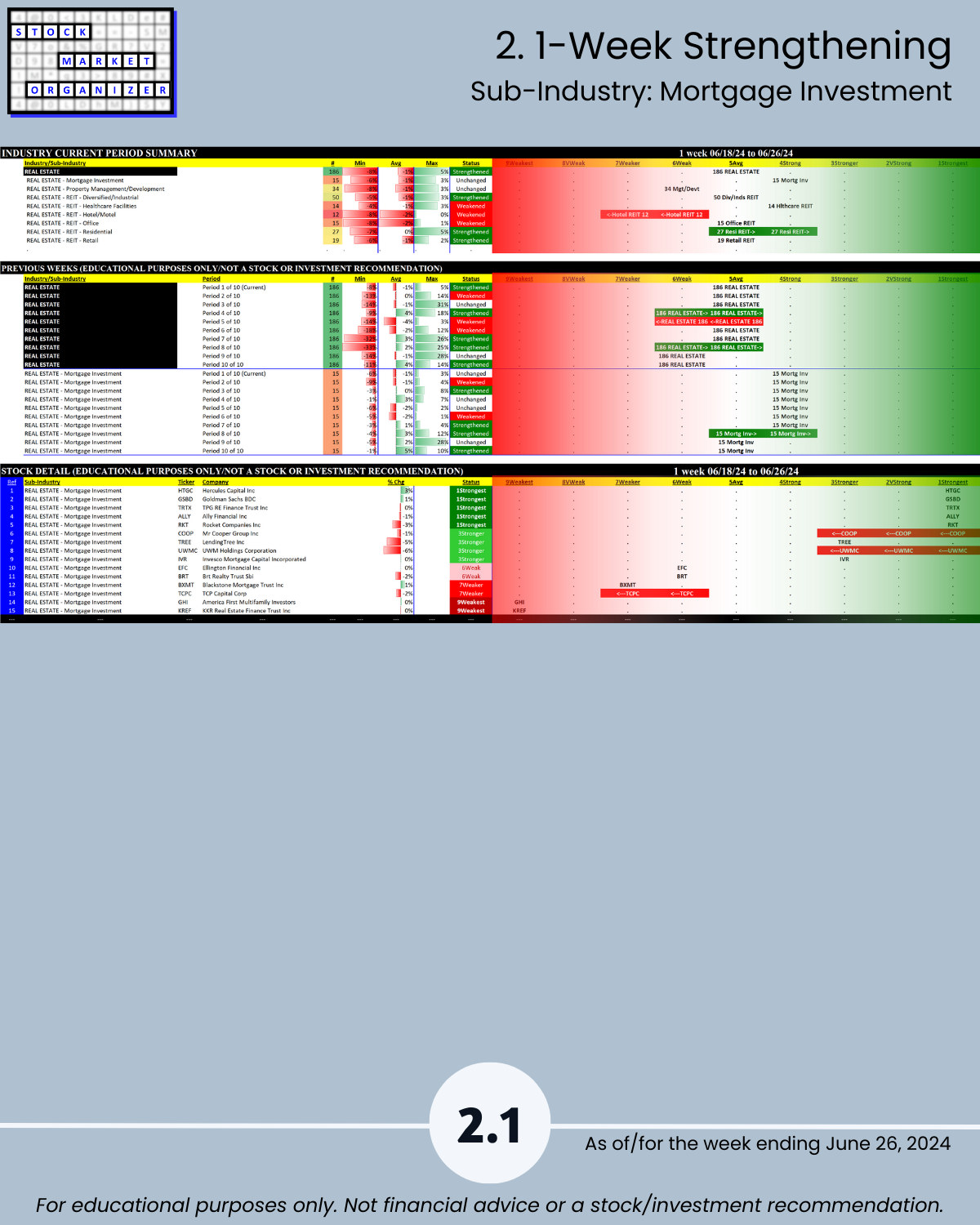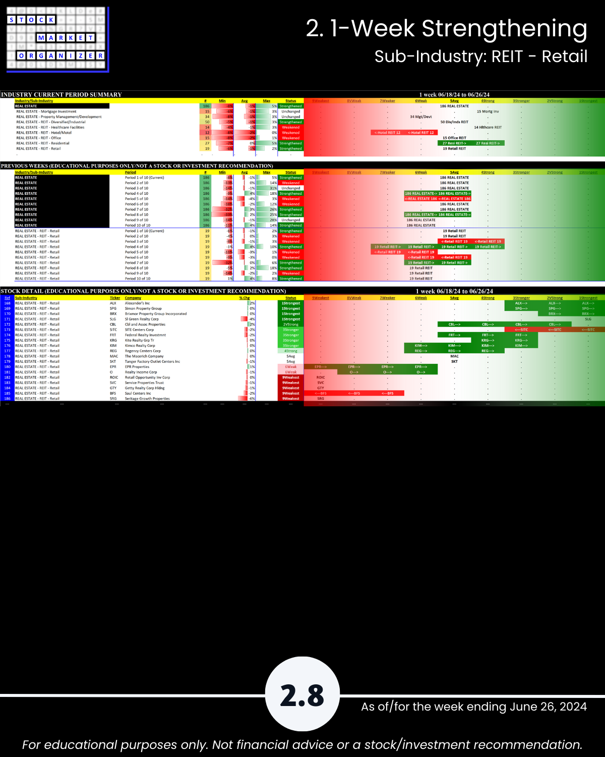 Commercial Real Estate fans, this 6/26/24 report is for you. Ranked based on current strength: 186 stocks in 8 sub-industries. You won’t find this anywhere else, because I created it from scratch. Sincere questions: would you rather own a strong stock in a strengthening sub-industry or a weak stock in a weakening sub-industry? And, how do you discern this?