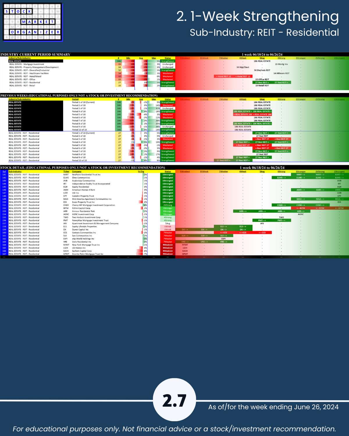 Residential REITs (which strengthened from 5Average to 4Strong) - Weakest sub-industry at 7Weaker: