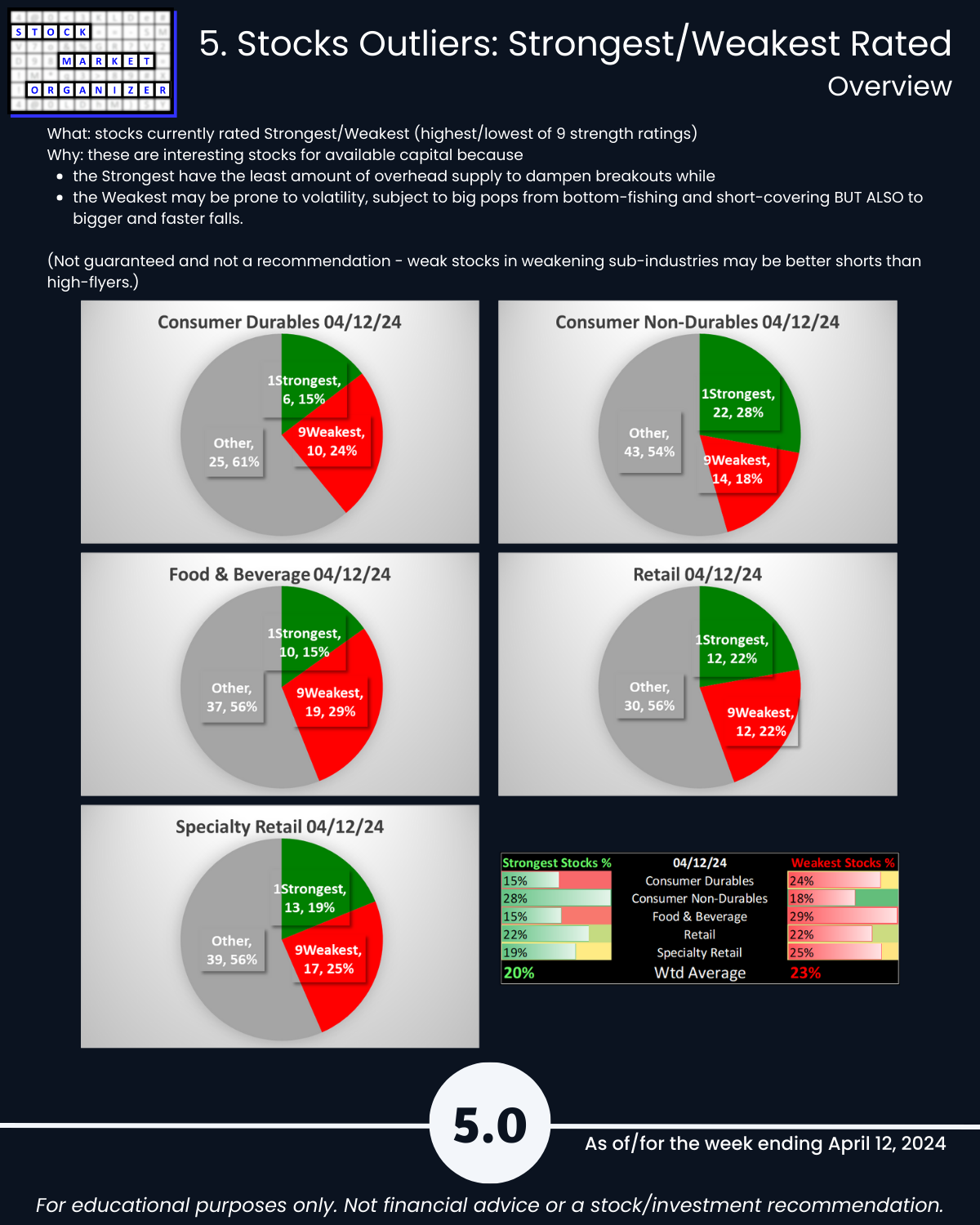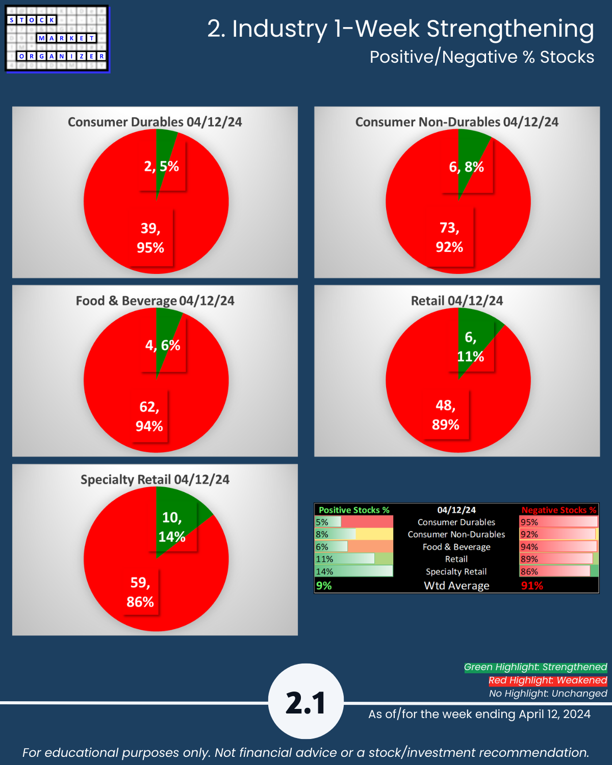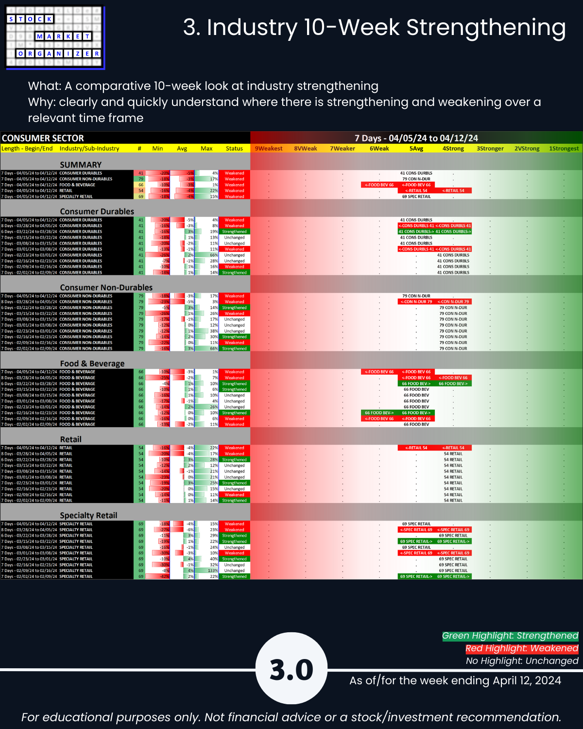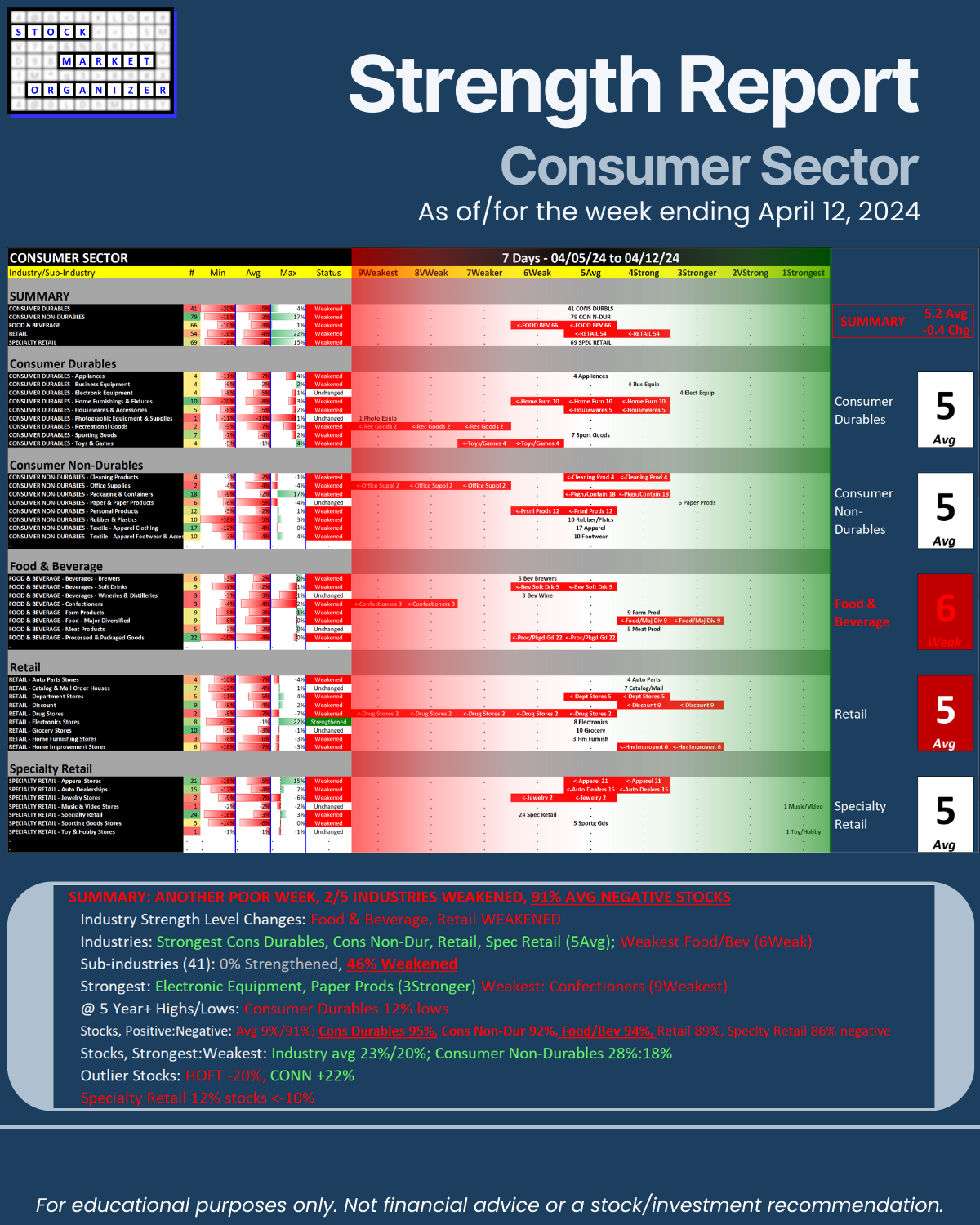 Consumer Sector stunk 4/5/24 and has another clunker 4/12/24. Unique U.S. Stock Market strength-based insights: 🔹 2 of 5 industries weakened as the weighted average strength score falls -0.4 to below Average at 5.2, 🔹 a whopping 91% negative stocks with Consumer Durables at 95%, Food & Beverage 94%, and Consumer Non-Durables 92%, 🔹 Specialty Retail 12% of stocks falling more than -10% 🔹 46% of 41 sub-industries weakened with none strengthening.