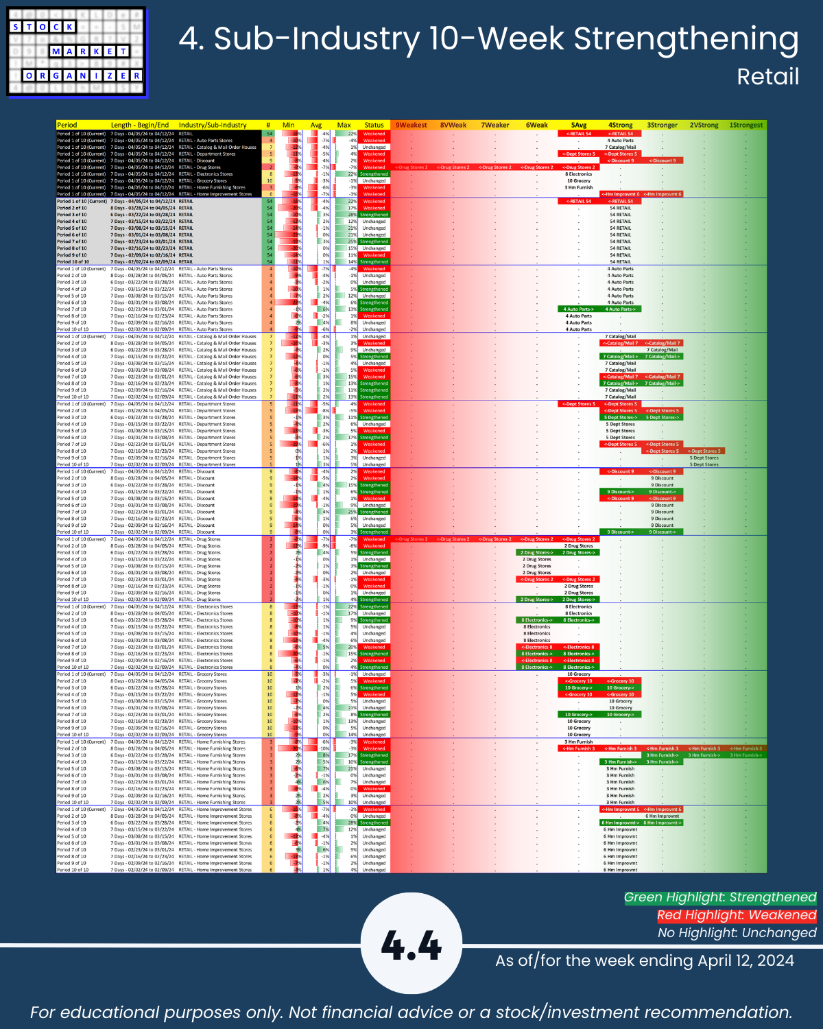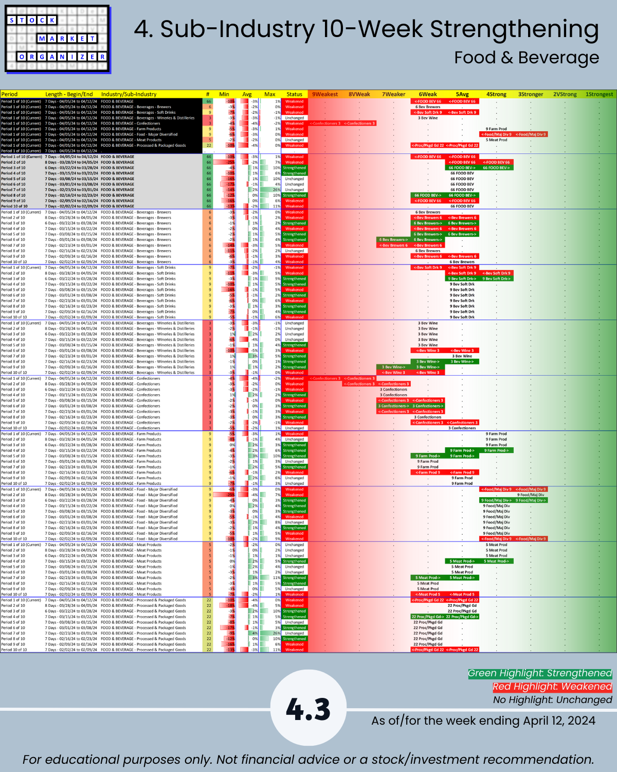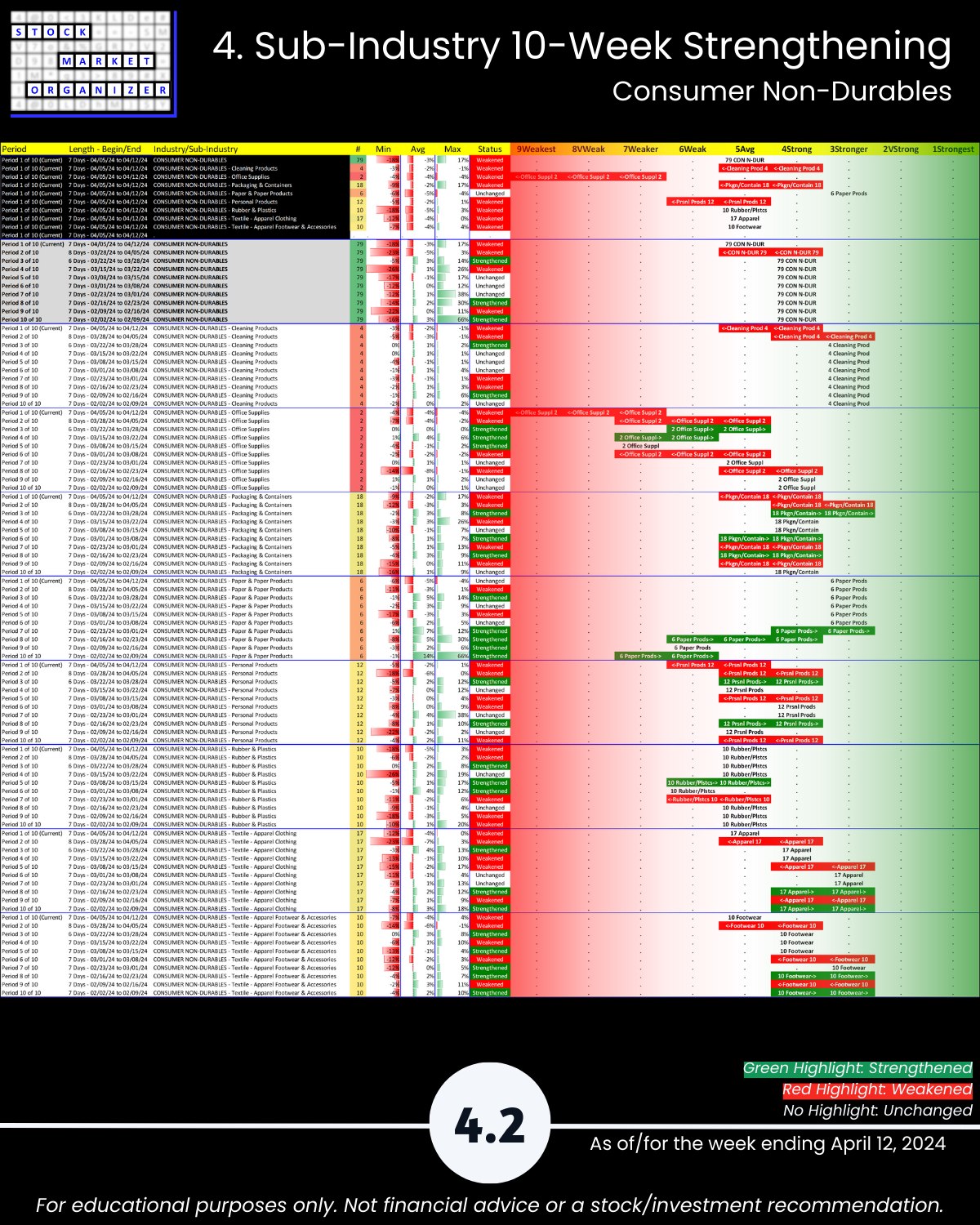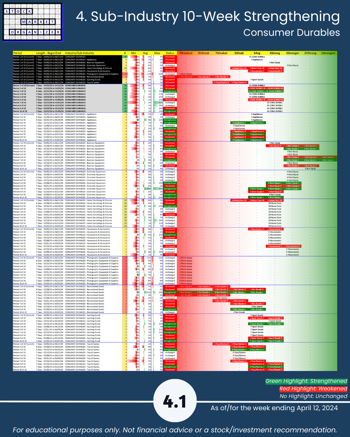 Consumer Sector stunk 4/5/24 and has another clunker 4/12/24. Unique U.S. Stock Market strength-based insights: 🔹 2 of 5 industries weakened as the weighted average strength score falls -0.4 to below Average at 5.2, 🔹 a whopping 91% negative stocks with Consumer Durables at 95%, Food & Beverage 94%, and Consumer Non-Durables 92%, 🔹 Specialty Retail 12% of stocks falling more than -10% 🔹 46% of 41 sub-industries weakened with none strengthening.