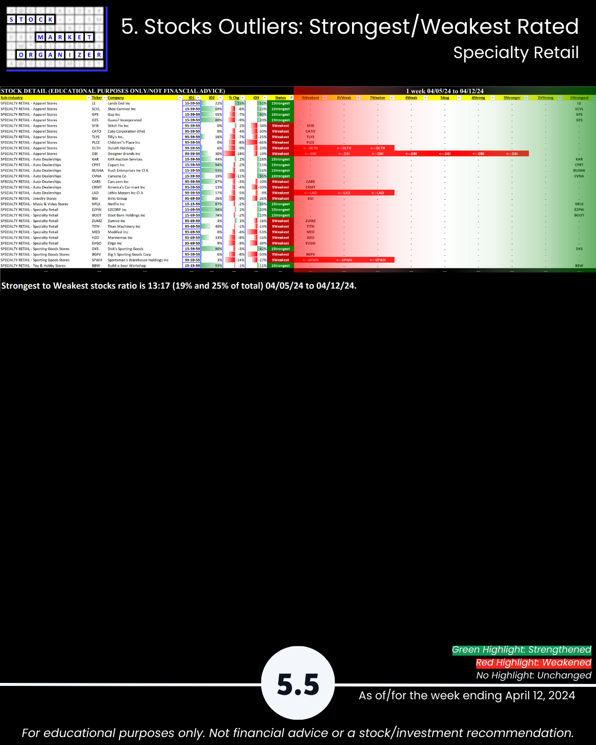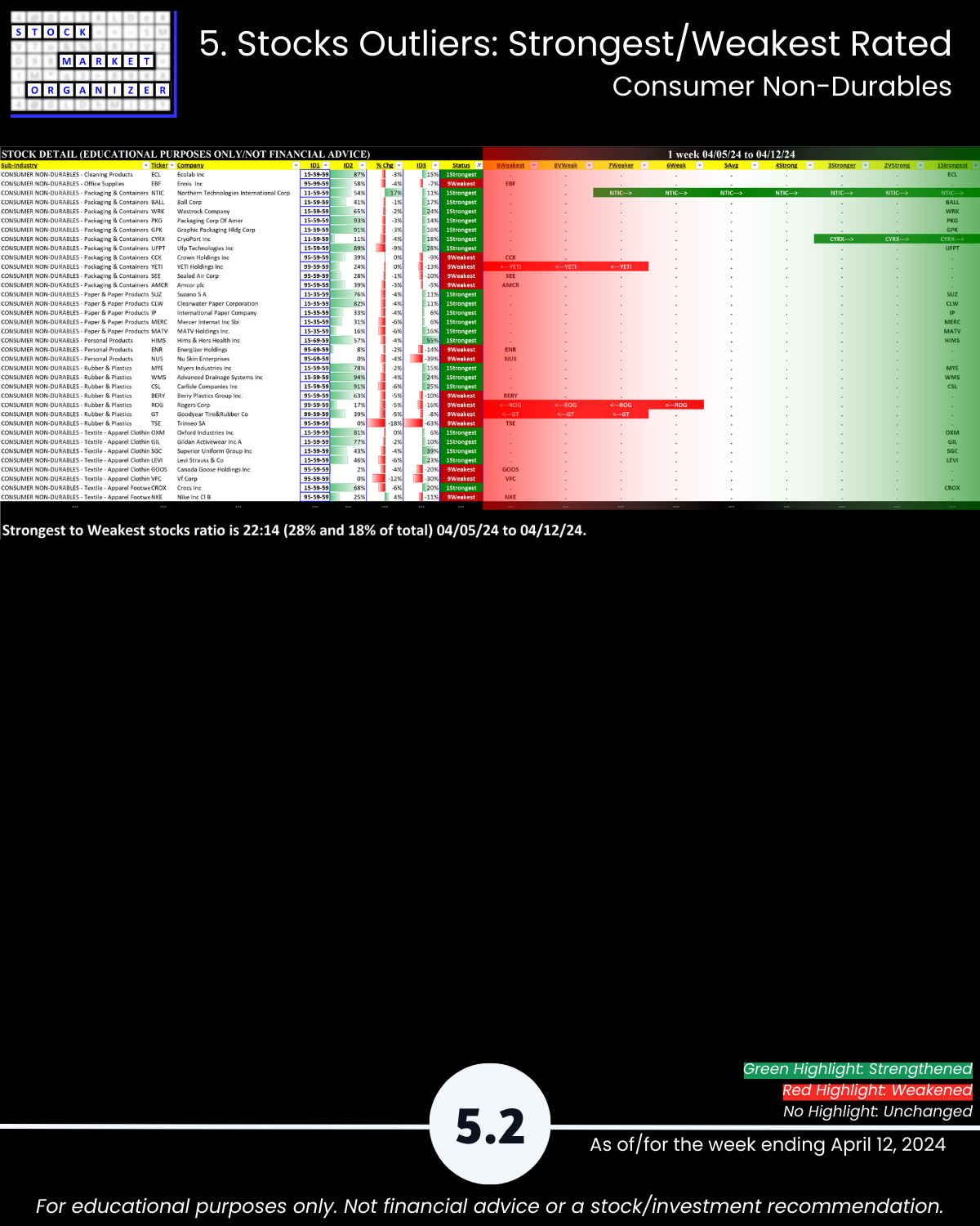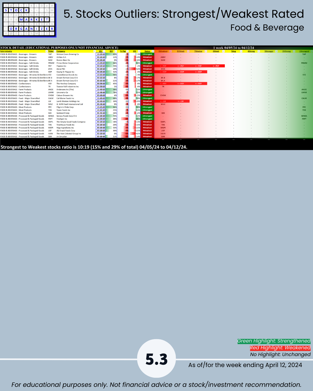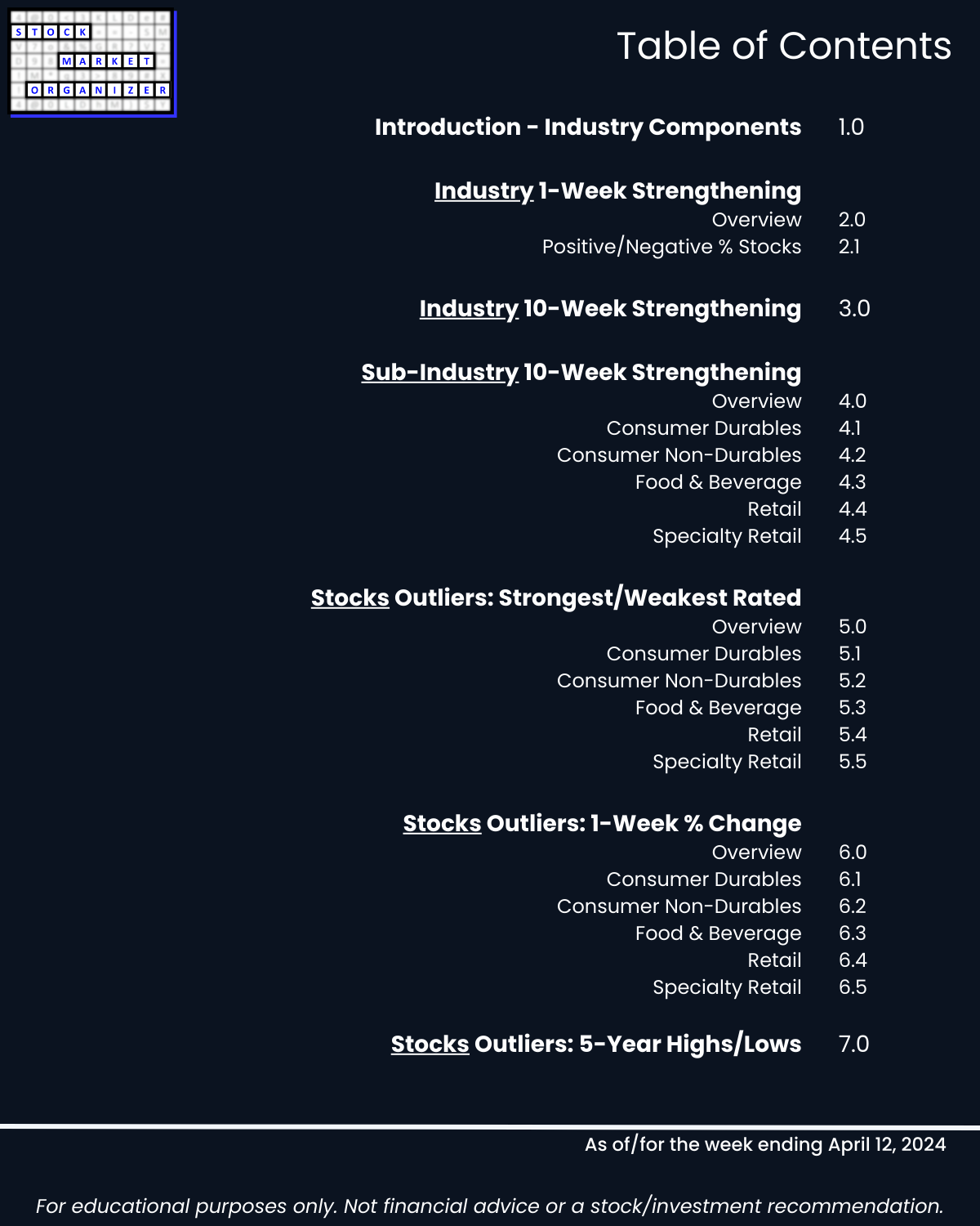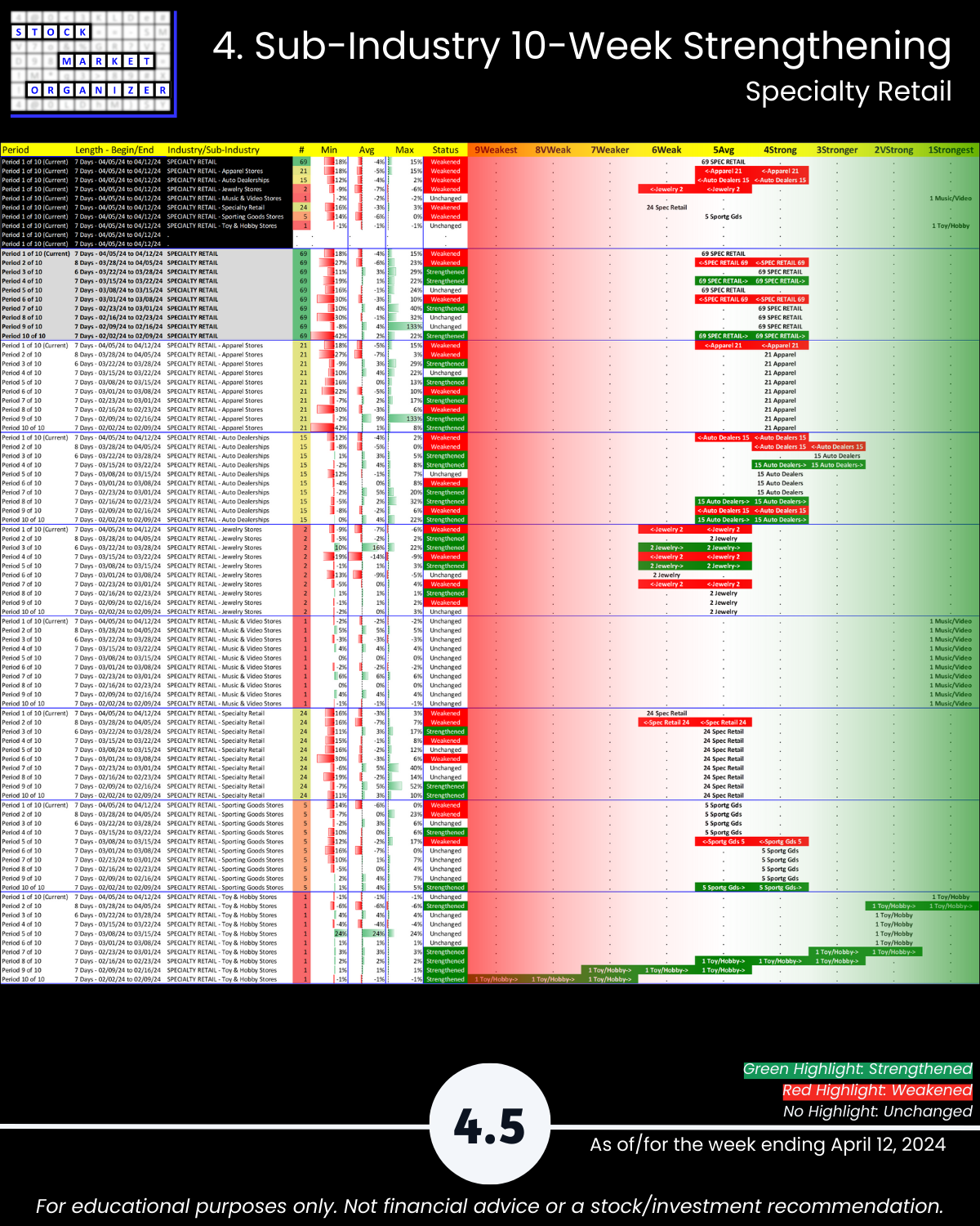 Consumer Sector stunk 4/5/24 and has another clunker 4/12/24. Unique U.S. Stock Market strength-based insights: 🔹 2 of 5 industries weakened as the weighted average strength score falls -0.4 to below Average at 5.2, 🔹 a whopping 91% negative stocks with Consumer Durables at 95%, Food & Beverage 94%, and Consumer Non-Durables 92%, 🔹 Specialty Retail 12% of stocks falling more than -10% 🔹 46% of 41 sub-industries weakened with none strengthening.