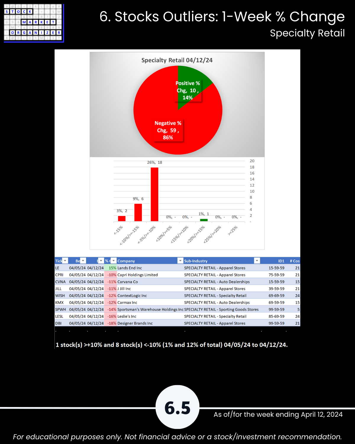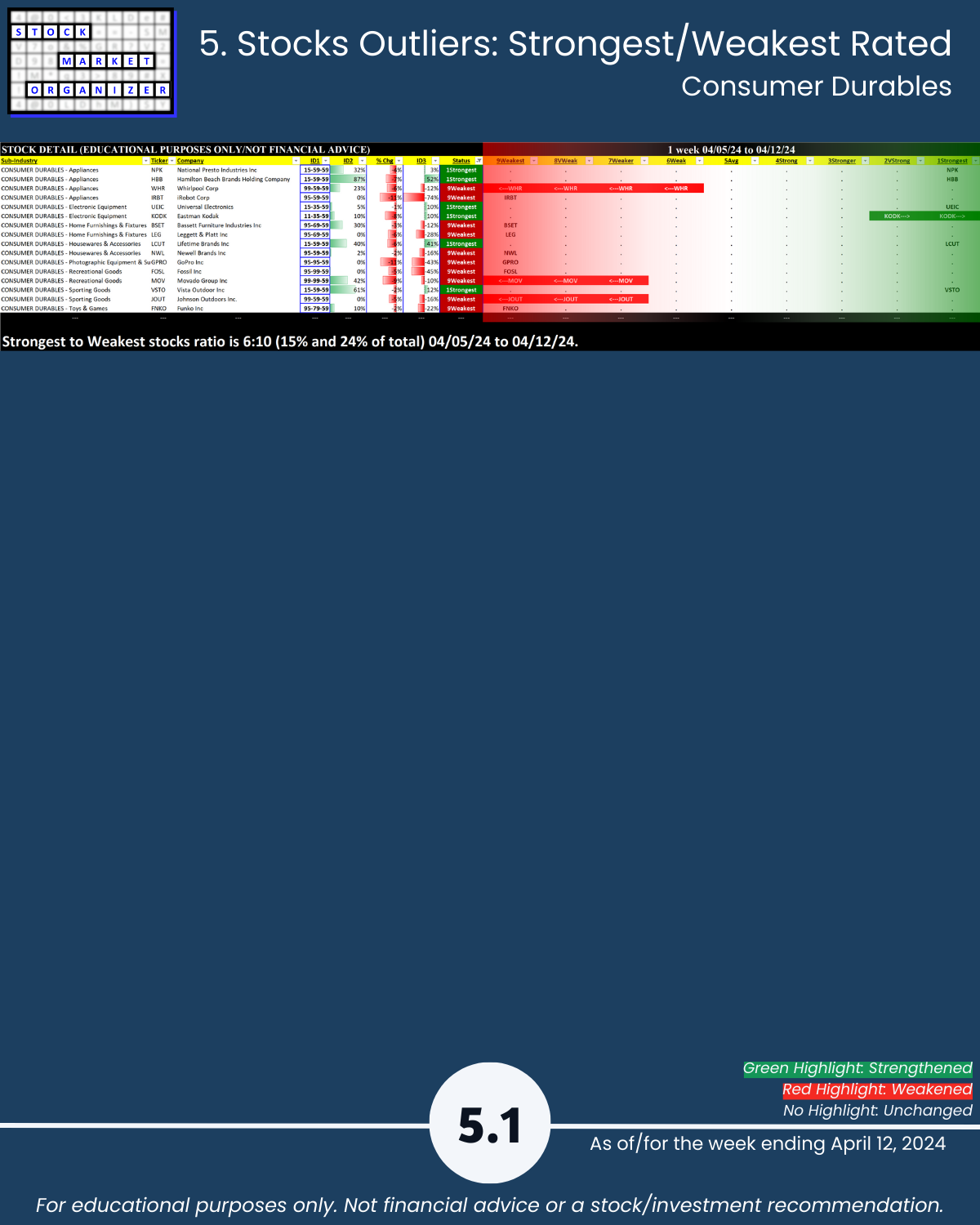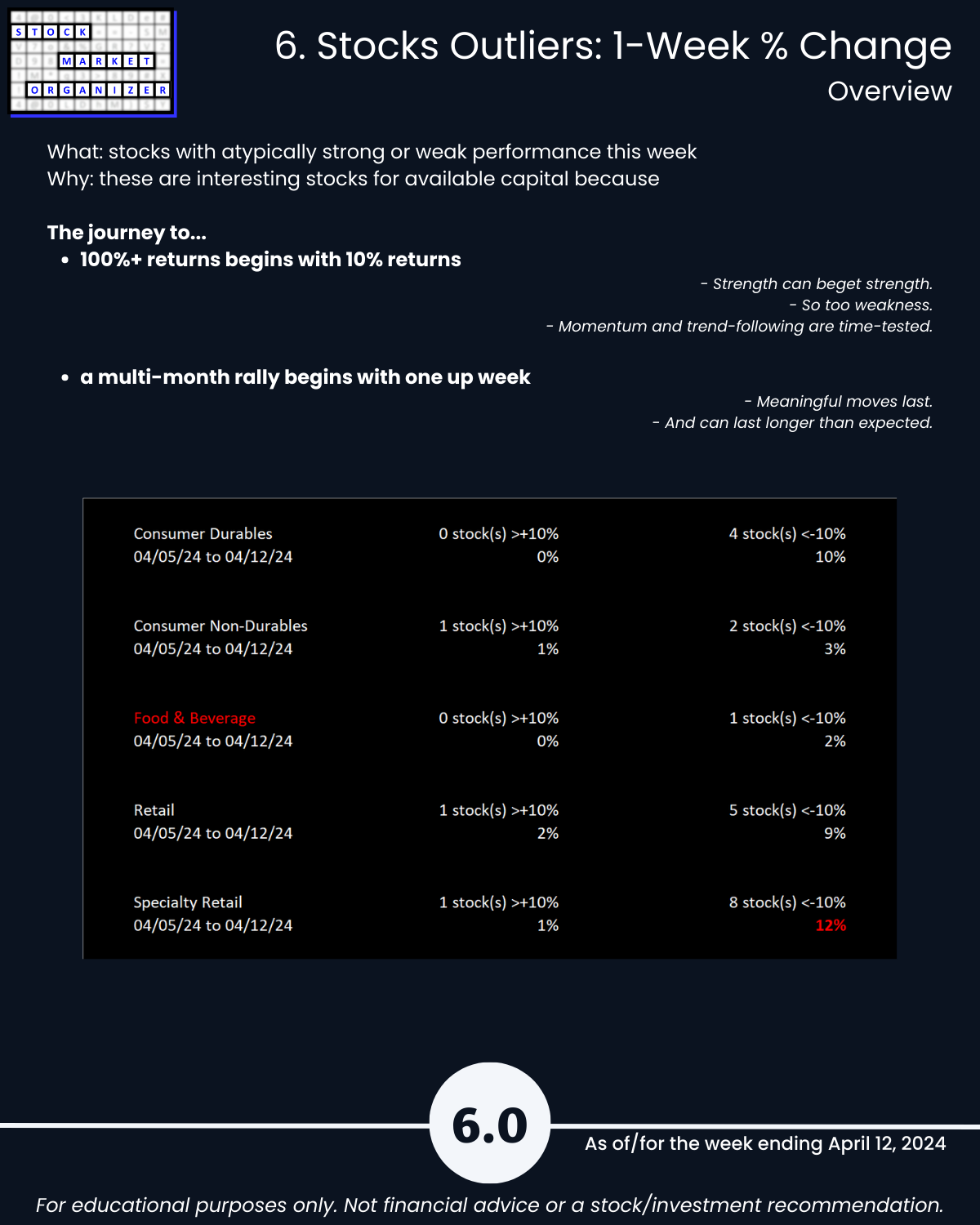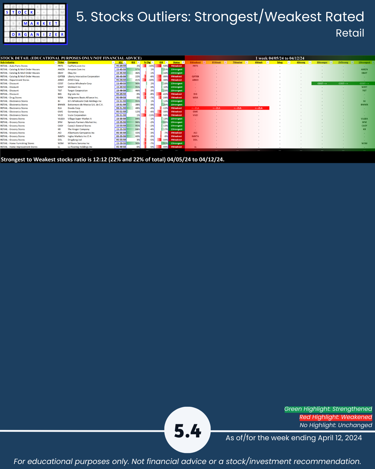Consumer Sector stunk 4/5/24 and has another clunker 4/12/24. Unique U.S. Stock Market strength-based insights: 🔹 2 of 5 industries weakened as the weighted average strength score falls -0.4 to below Average at 5.2, 🔹 a whopping 91% negative stocks with Consumer Durables at 95%, Food & Beverage 94%, and Consumer Non-Durables 92%, 🔹 Specialty Retail 12% of stocks falling more than -10% 🔹 46% of 41 sub-industries weakened with none strengthening.