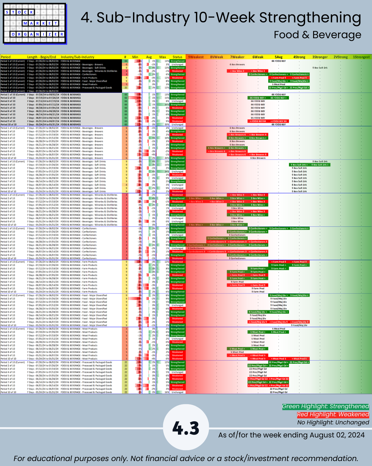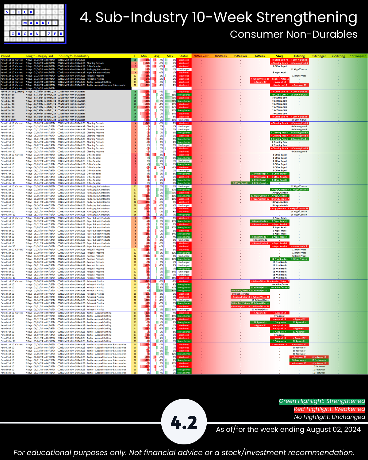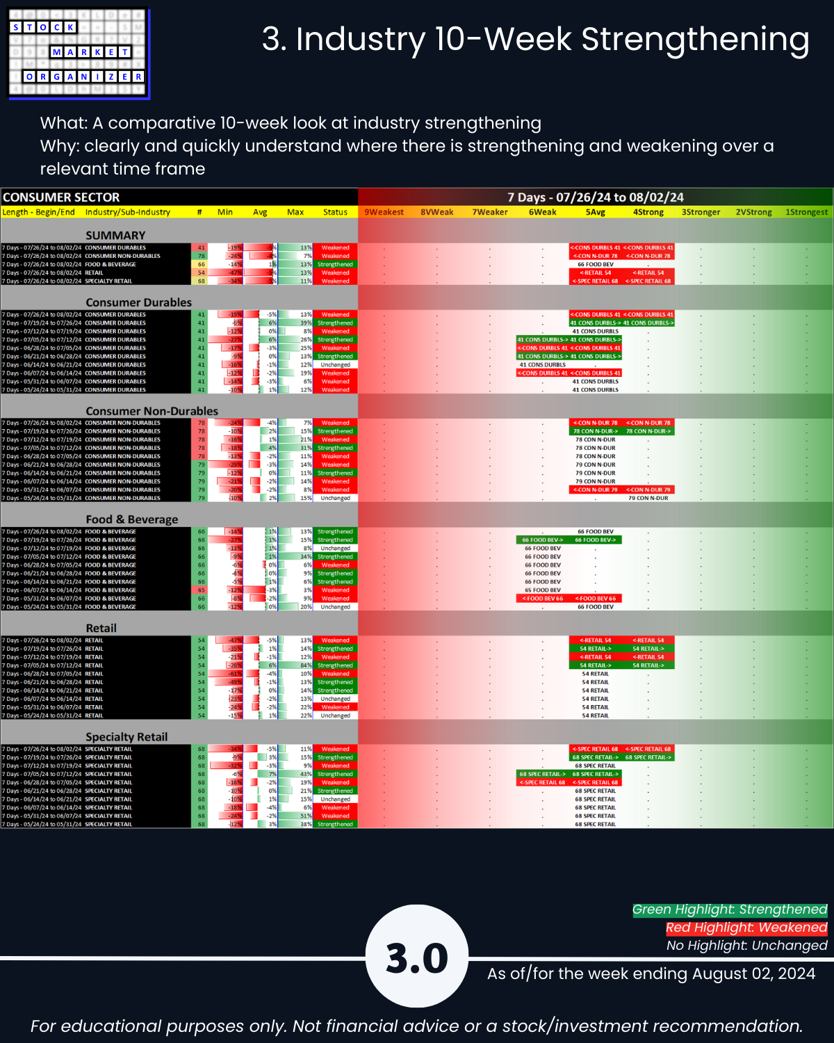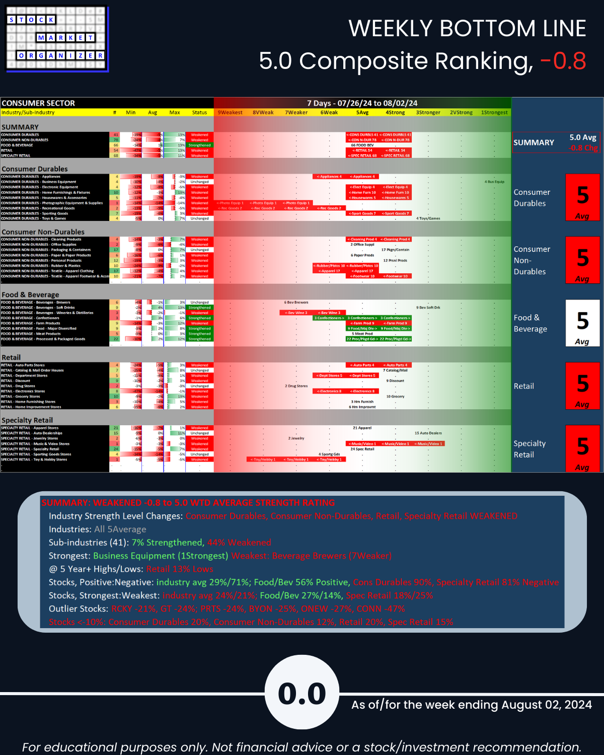 8/2/24 Consumer sector unsurprisingly has a bad week along with the market, -0.8 to a 5.0 weighted average strength ranking. Components: Consumer Durables, Consumer Non-durables, Food & Beverage, Retail, and Specialty Retail. Details attached including strongest/weakest outlier stocks in Section 5.