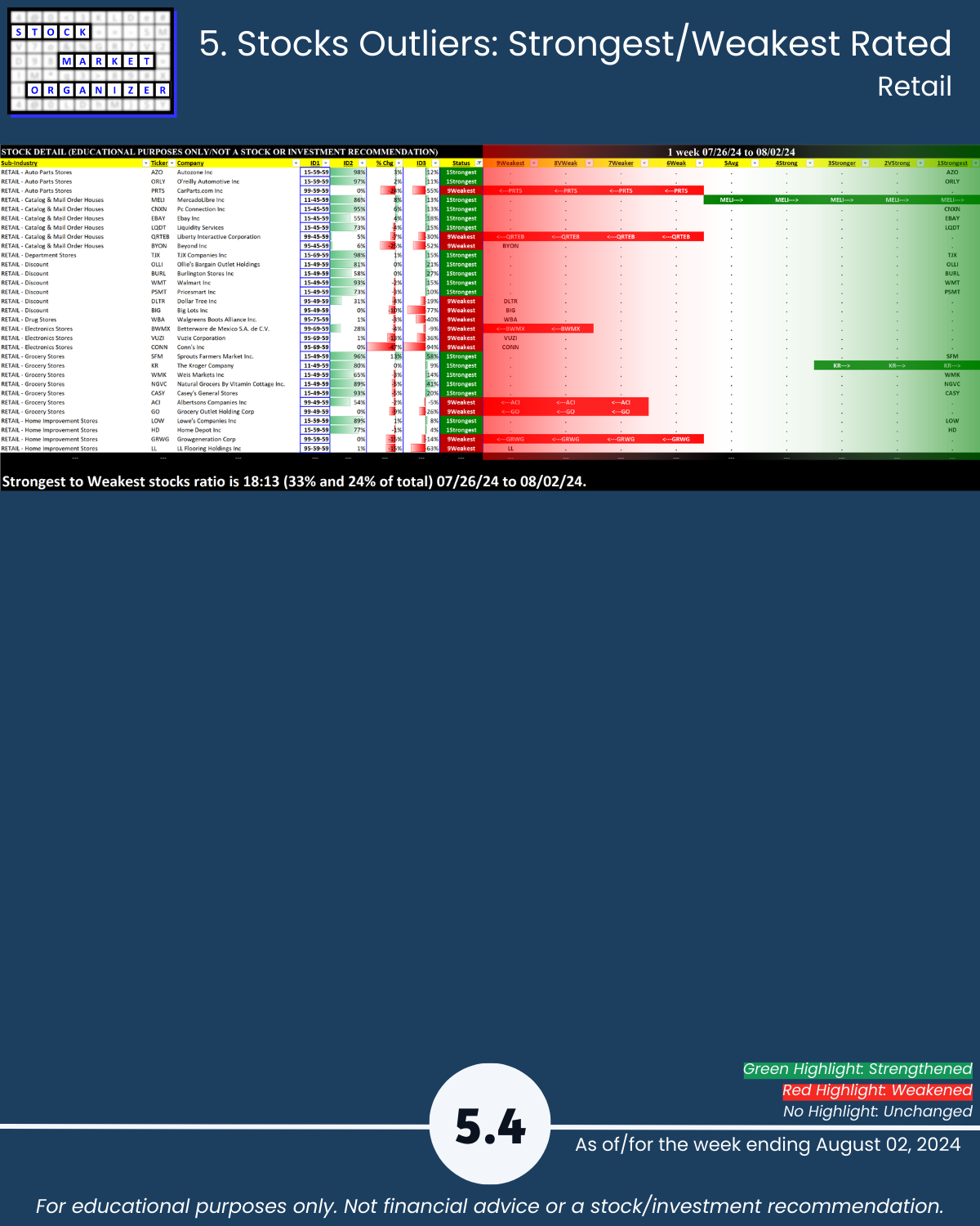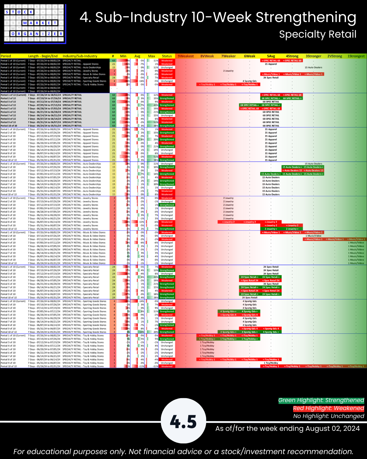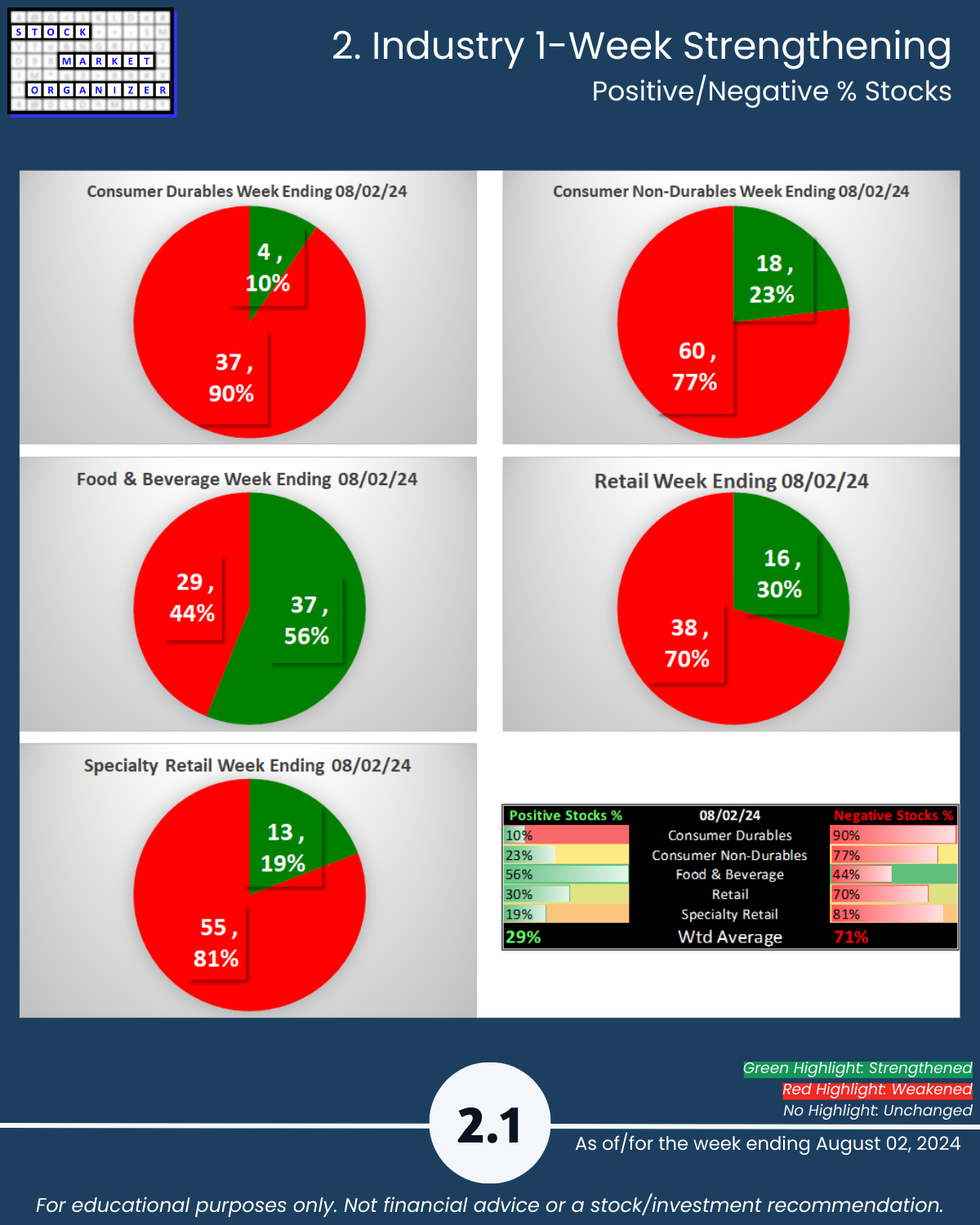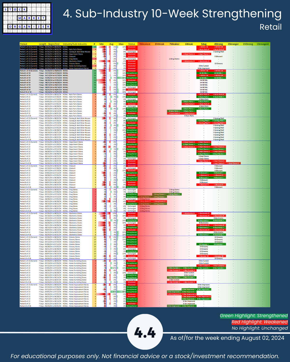 8/2/24 Consumer sector unsurprisingly has a bad week along with the market, -0.8 to a 5.0 weighted average strength ranking. Components: Consumer Durables, Consumer Non-durables, Food & Beverage, Retail, and Specialty Retail. Details attached including strongest/weakest outlier stocks in Section 5.