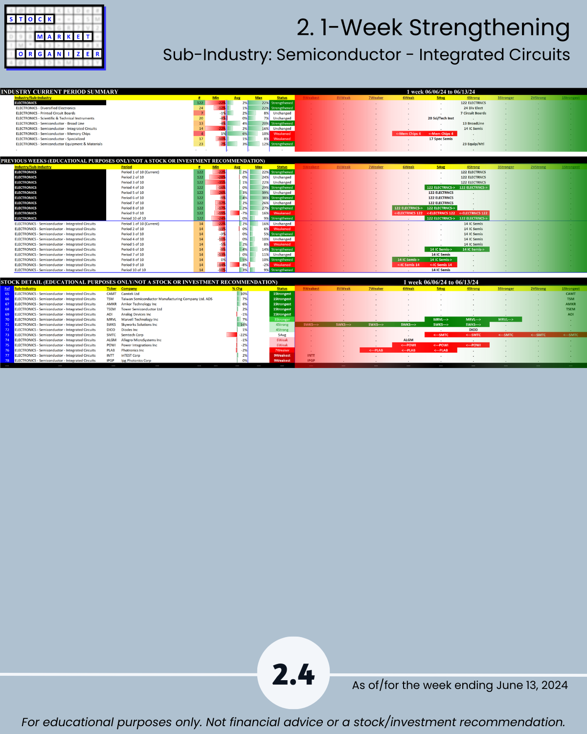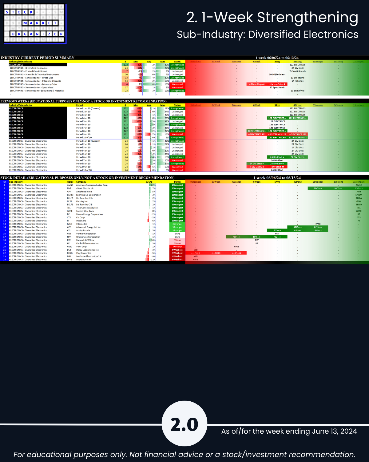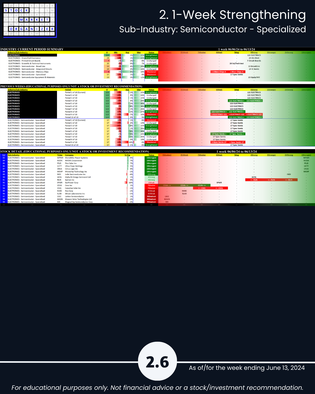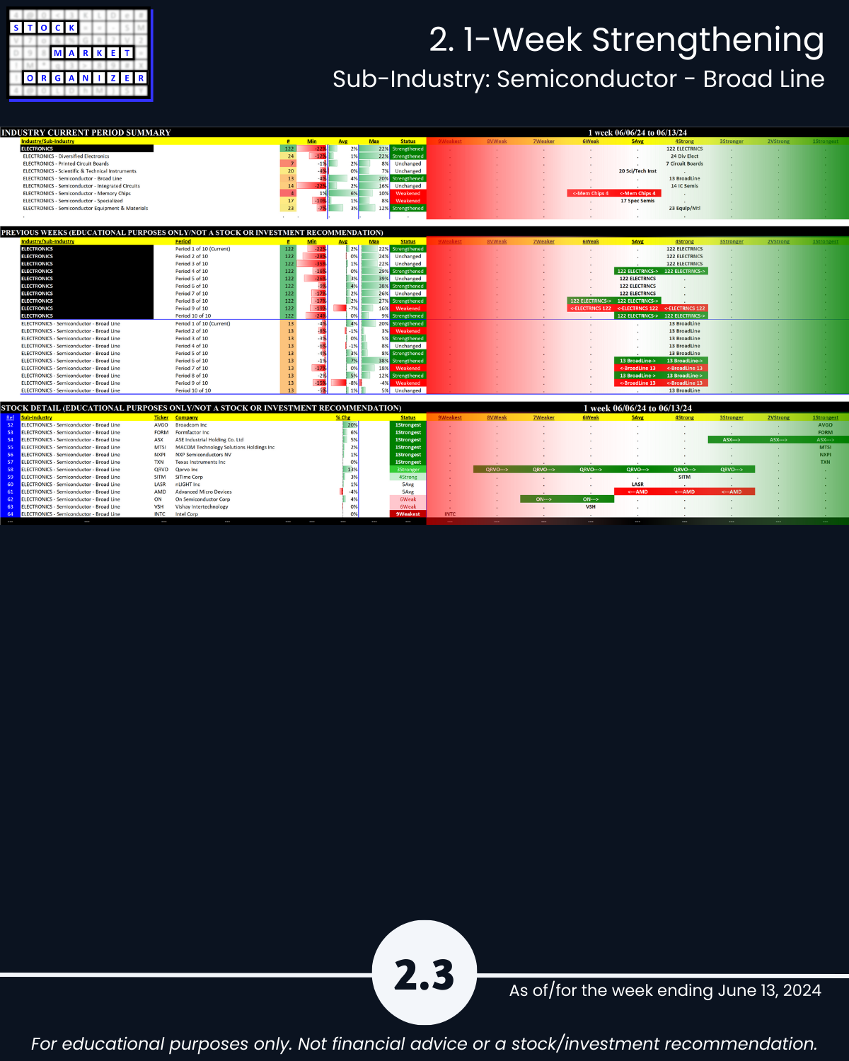 Attached - new look Electronics industry focus report 6/13/24. You can directly compare stocks and sub-industries strength. Why? So you can stack strength.