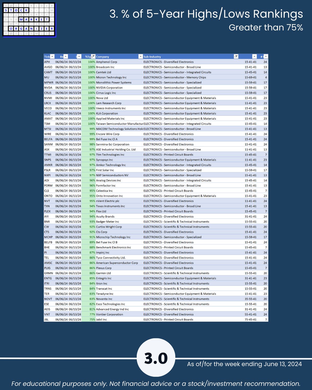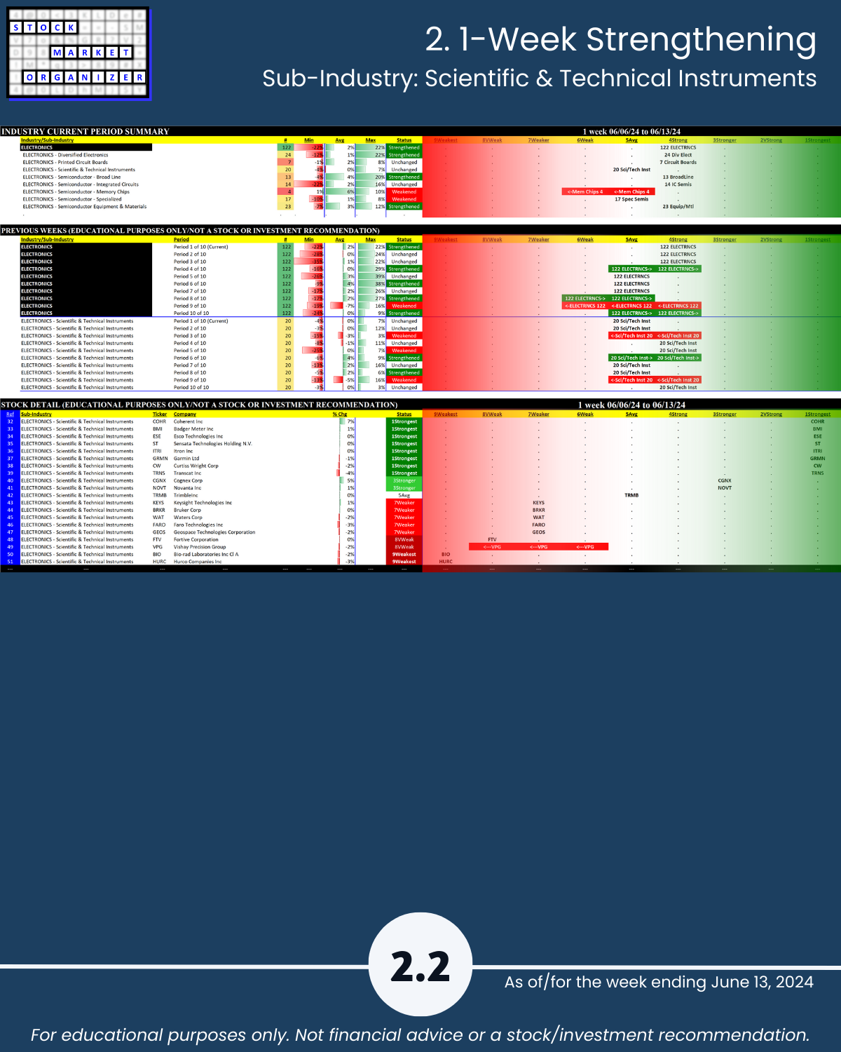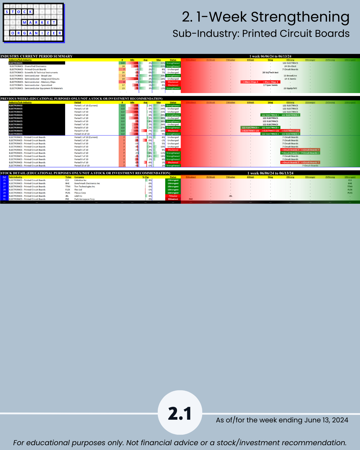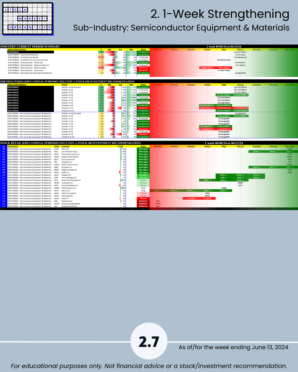 Attached - new look Electronics industry focus report 6/13/24. You can directly compare stocks and sub-industries strength. Why? So you can stack strength.