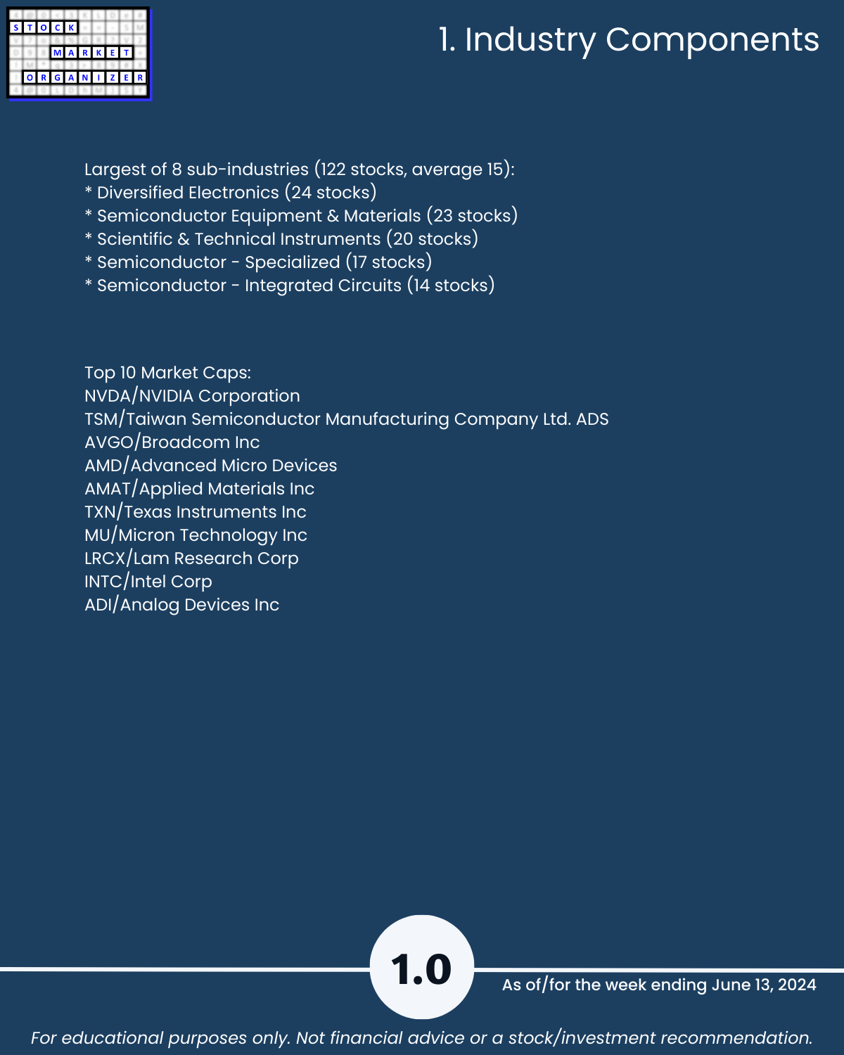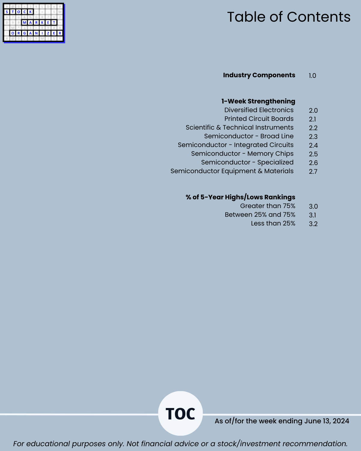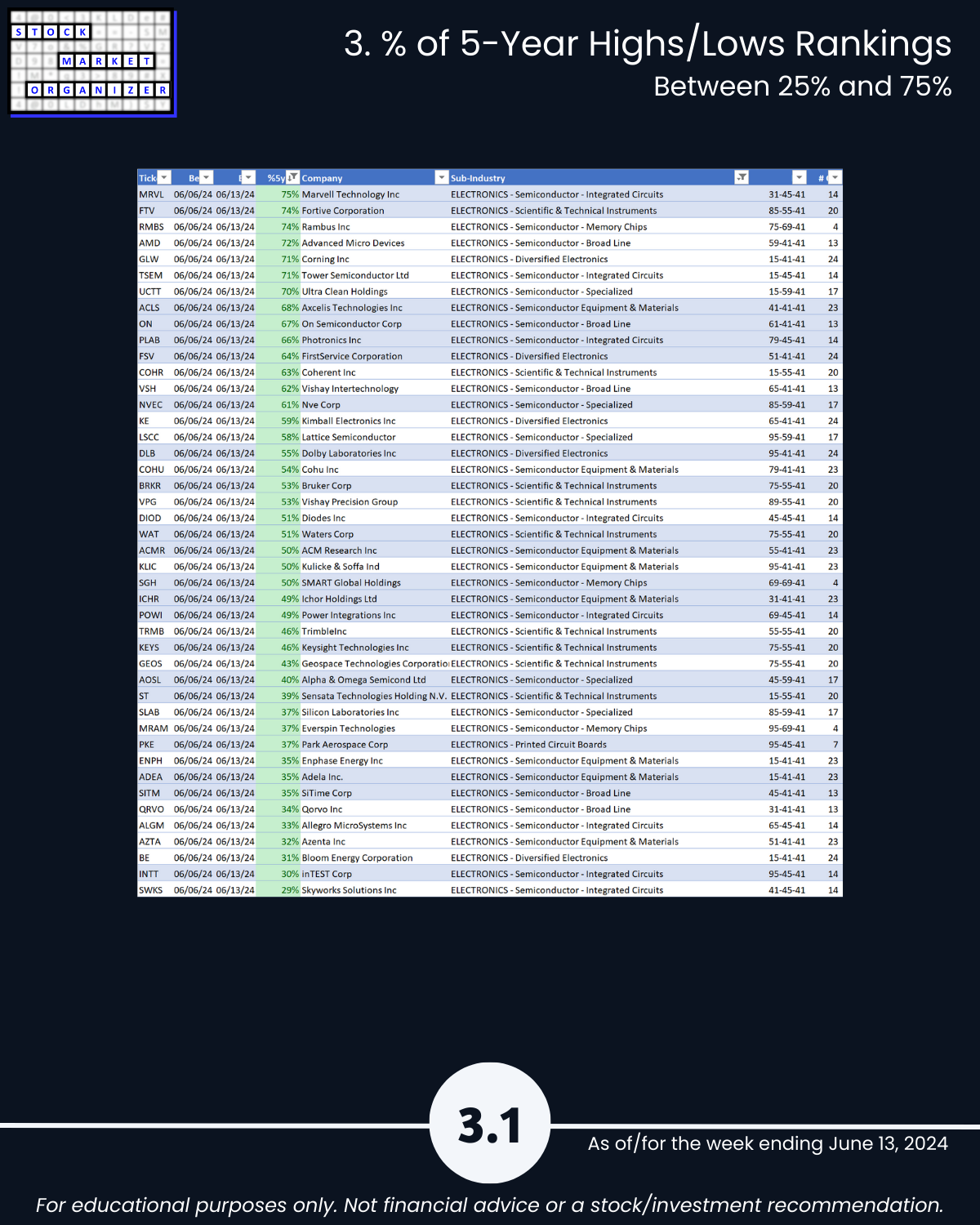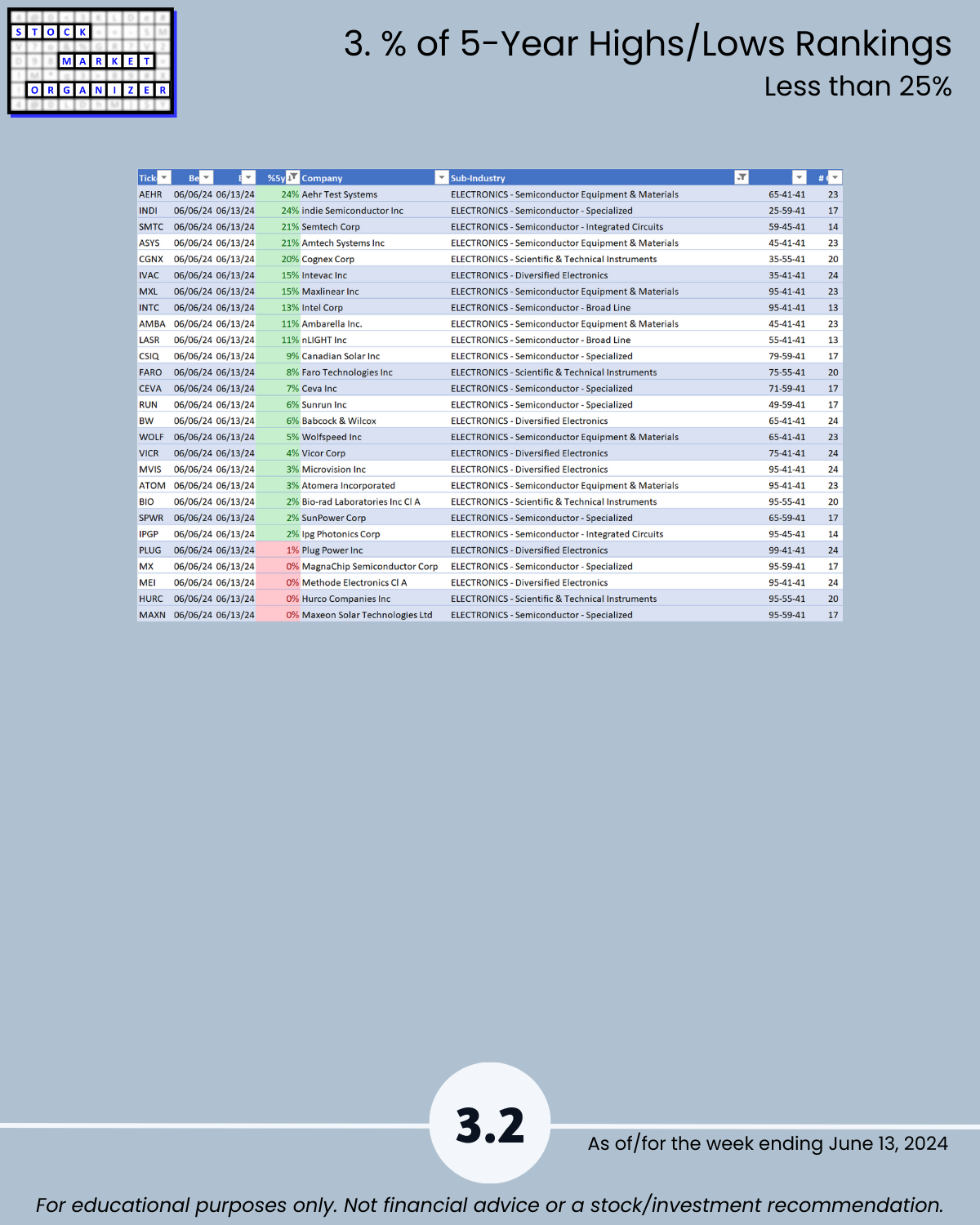 Attached - new look Electronics industry focus report 6/13/24. You can directly compare stocks and sub-industries strength. Why? So you can stack strength.