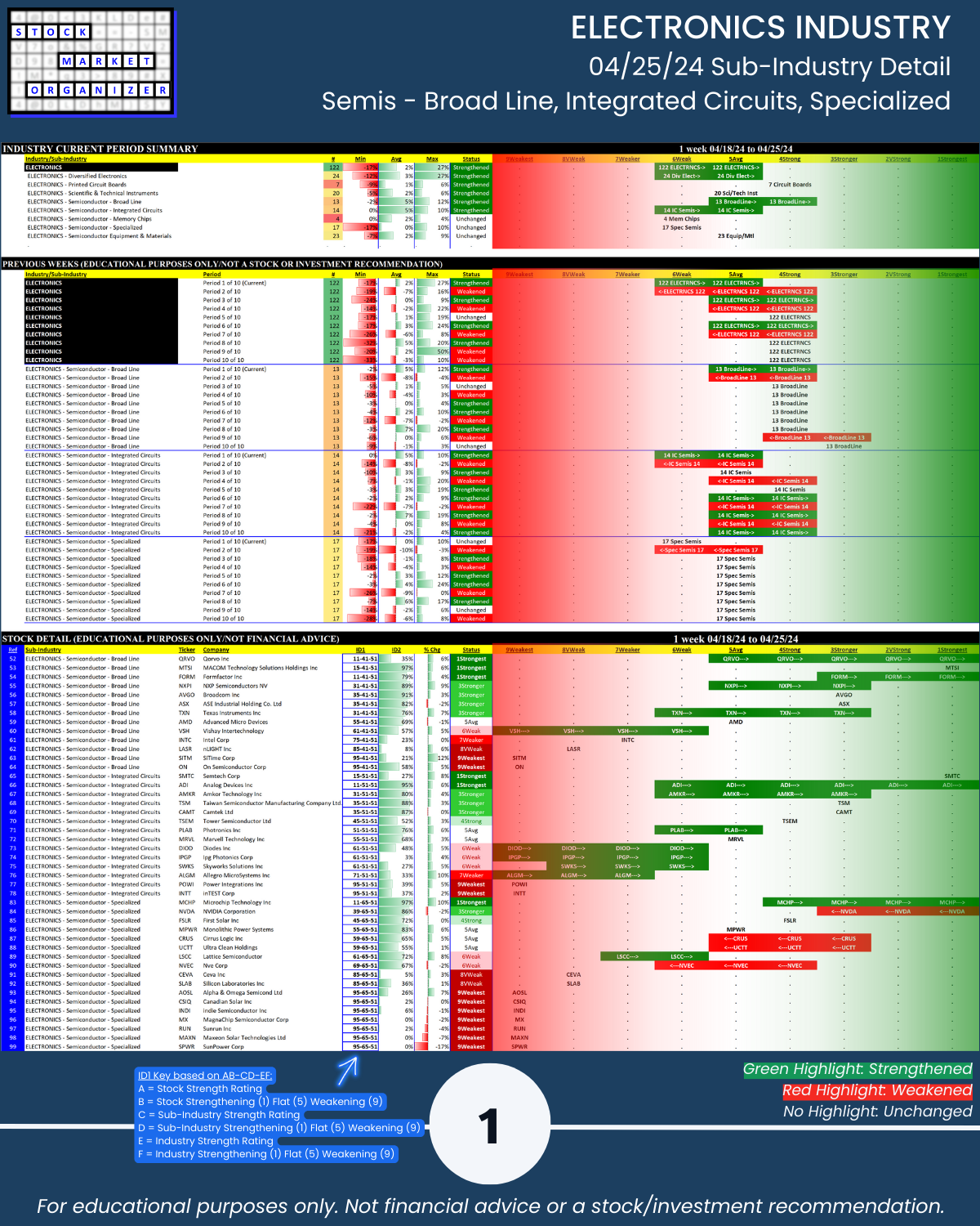 Following up my 4/25/24 Technology Sector Strength report, attached is a unique, simple-yet-detailed look at stocks in 3 Electronics Industry sub-industries: Semiconductors - ๐น Broad Line, ๐น Integrated Circuits, ๐น Specialized.