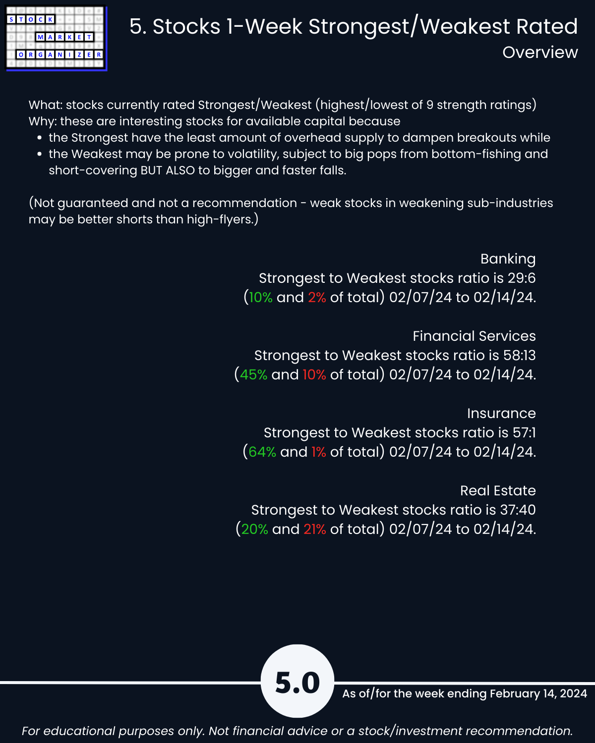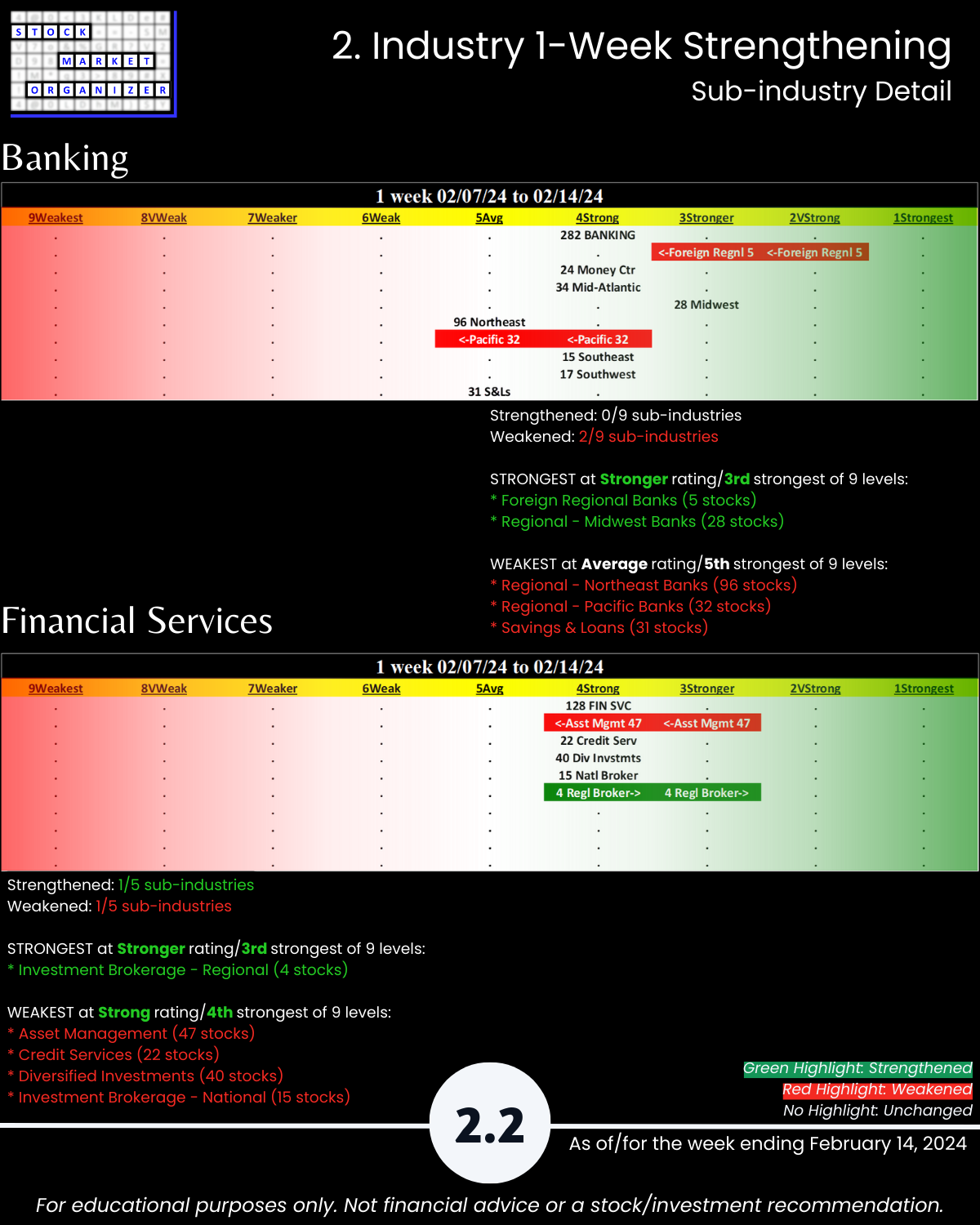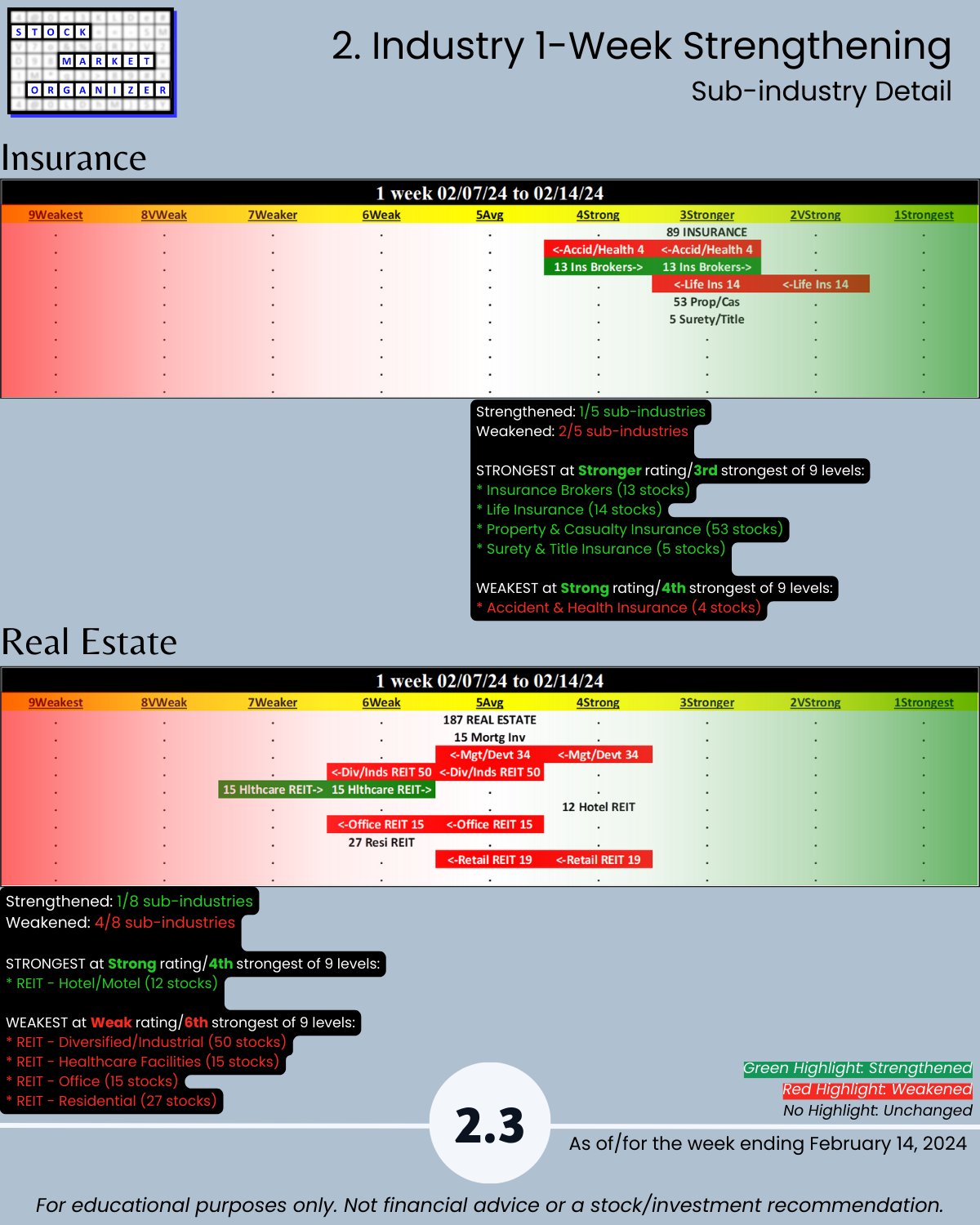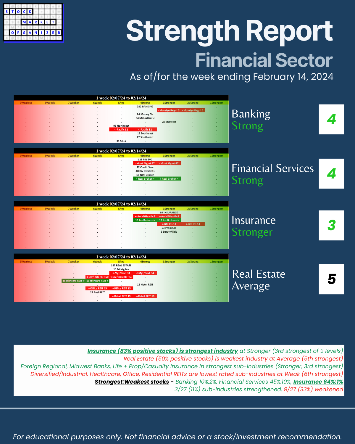 Back-and-forth market = four unchanged Financial Sector industries week ending 2/14/24. Insurance strong – 83% positive stocks last week, and its ratio of Strongest- to Weakest-rated stocks is a massive 64%:1%. Banking stopped weakening (had weakened the preceding two weeks). More detail in the attached Financial Sector Strength report which includes the Strongest- and Weakest-rated Stock Market Organizer stocks and objective strengthening/weakening measurements for the Banking, Financial Services, Insurance, and Real Estate industries.