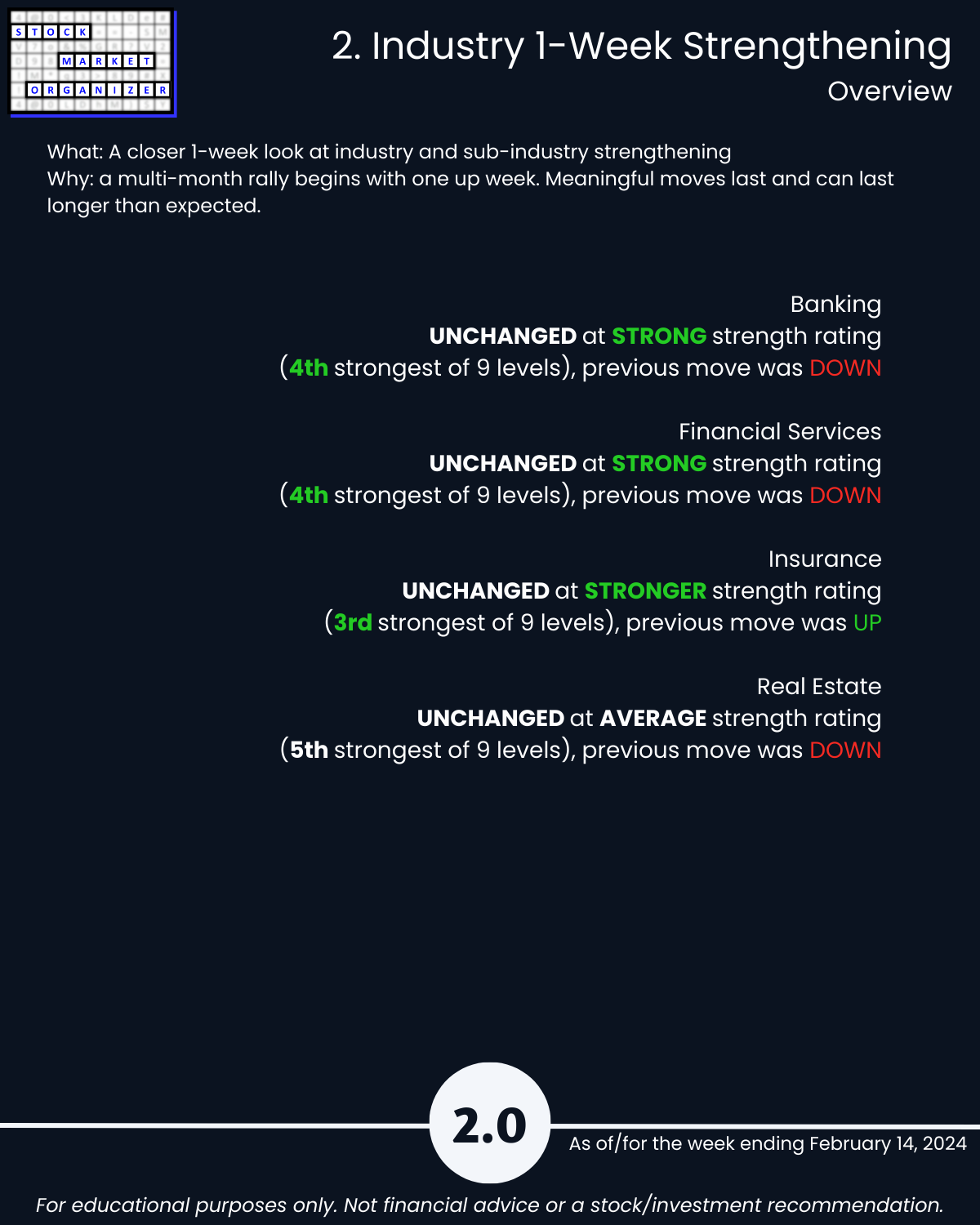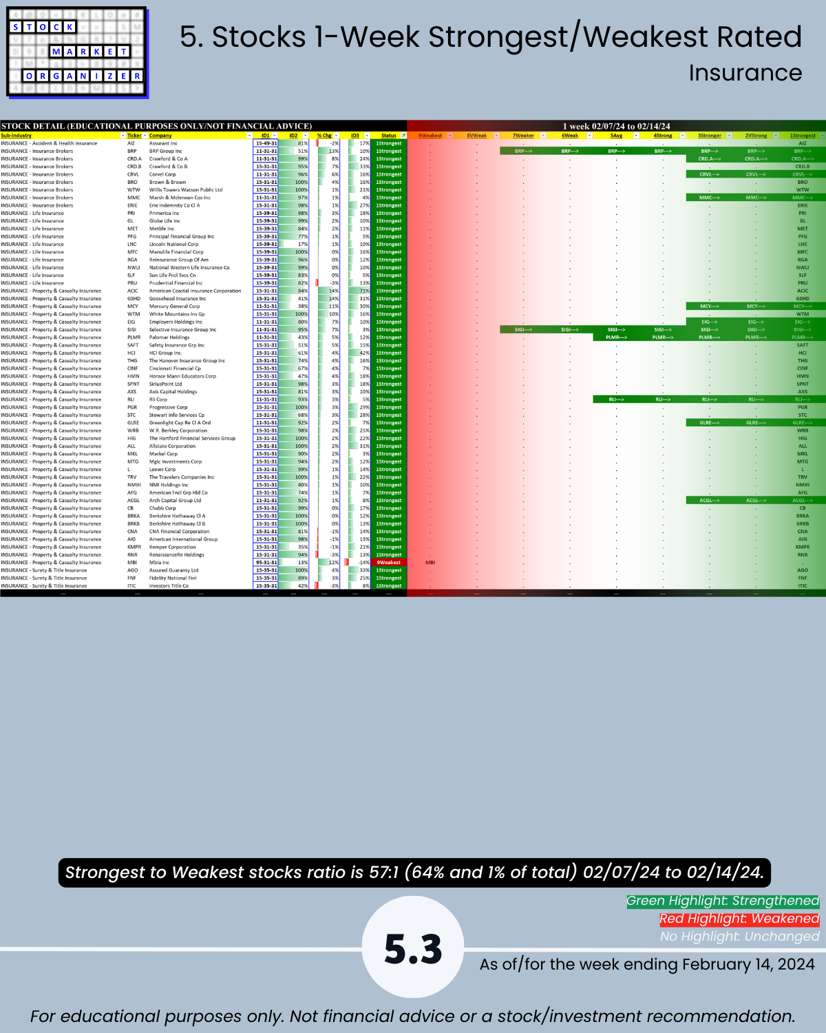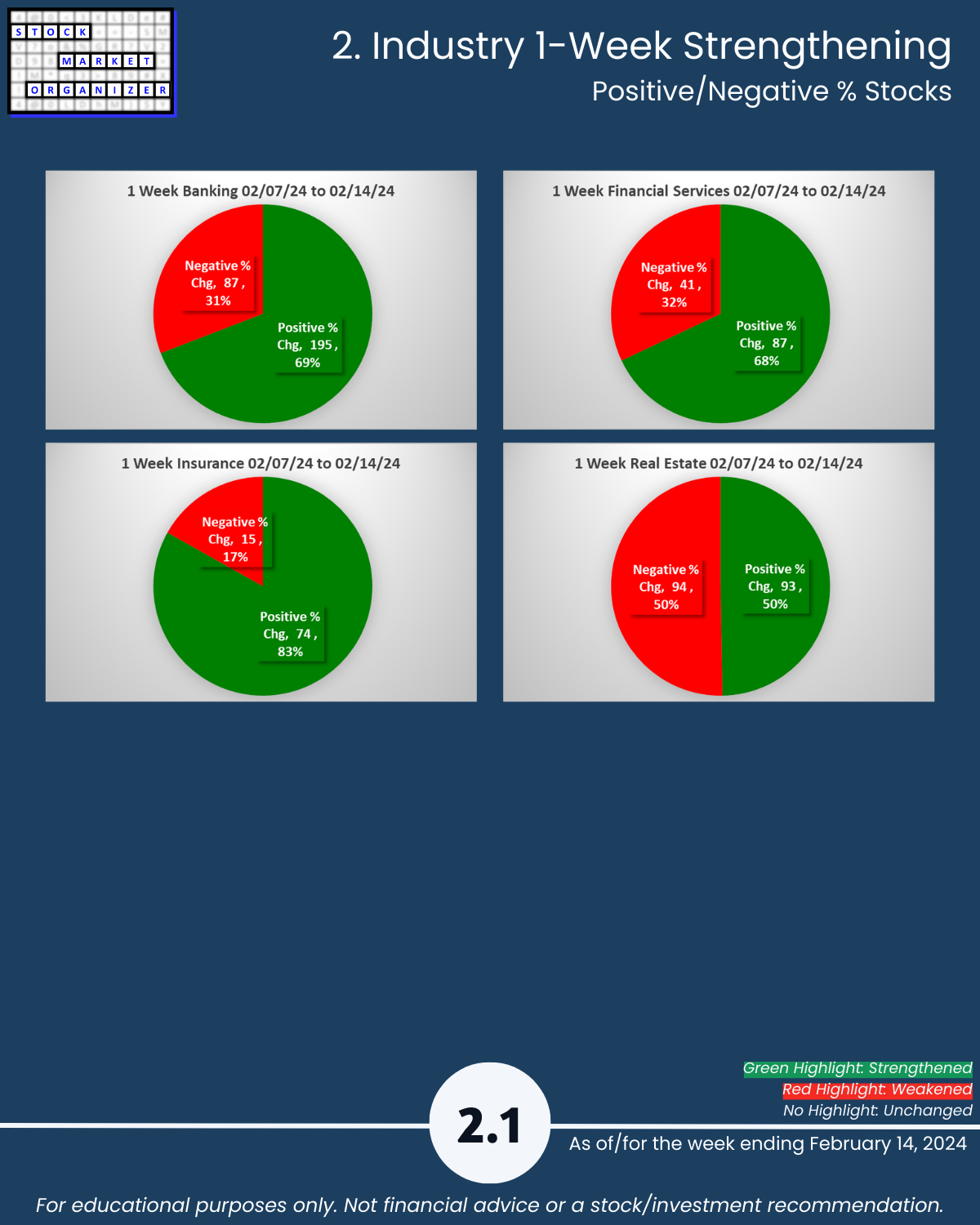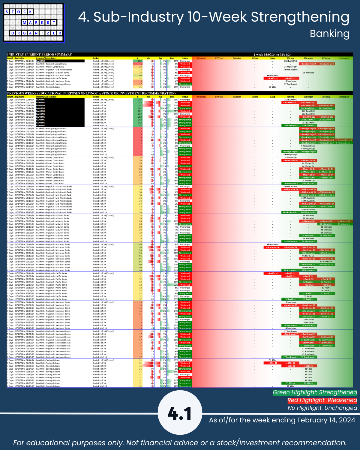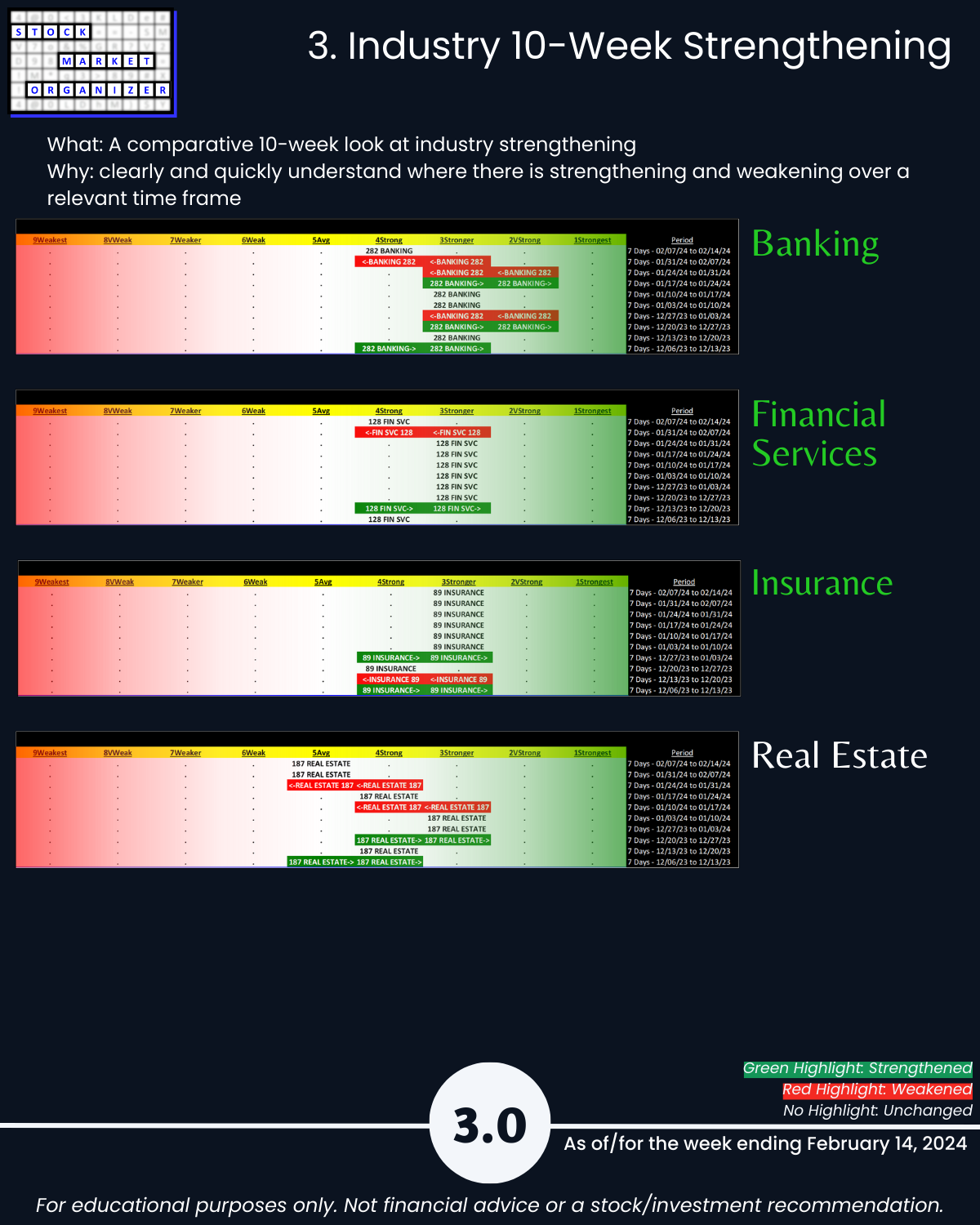 Back-and-forth market = four unchanged Financial Sector industries week ending 2/14/24. Insurance strong – 83% positive stocks last week, and its ratio of Strongest- to Weakest-rated stocks is a massive 64%:1%. Banking stopped weakening (had weakened the preceding two weeks). More detail in the attached Financial Sector Strength report which includes the Strongest- and Weakest-rated Stock Market Organizer stocks and objective strengthening/weakening measurements for the Banking, Financial Services, Insurance, and Real Estate industries.