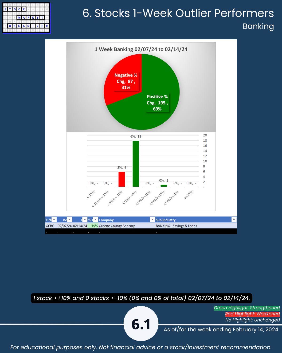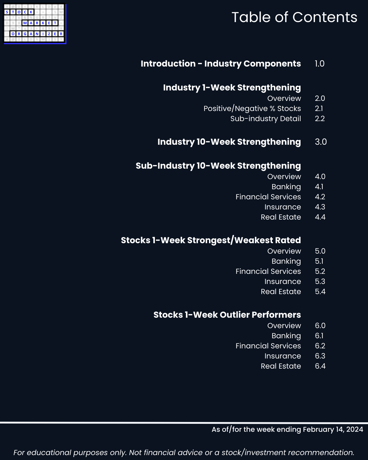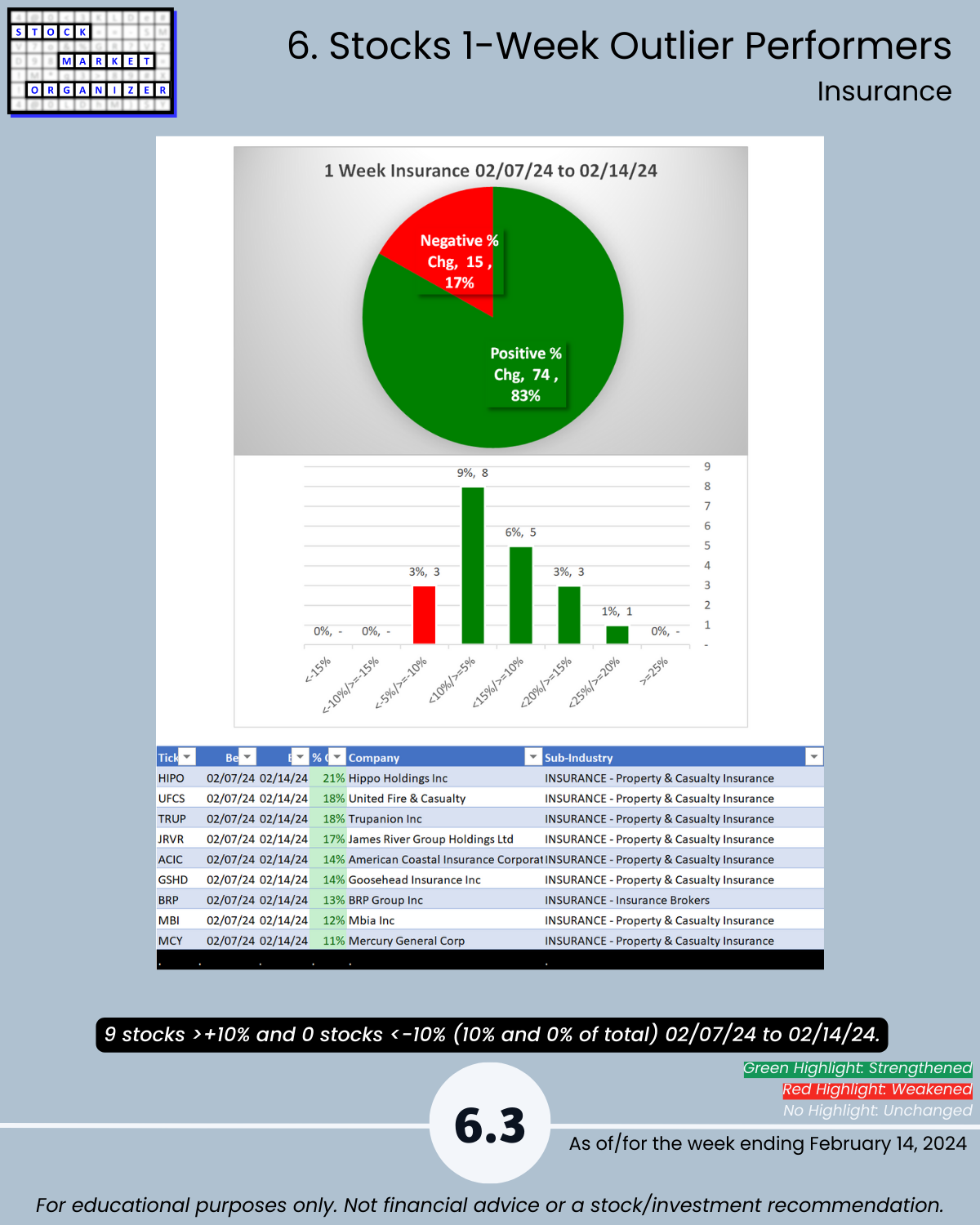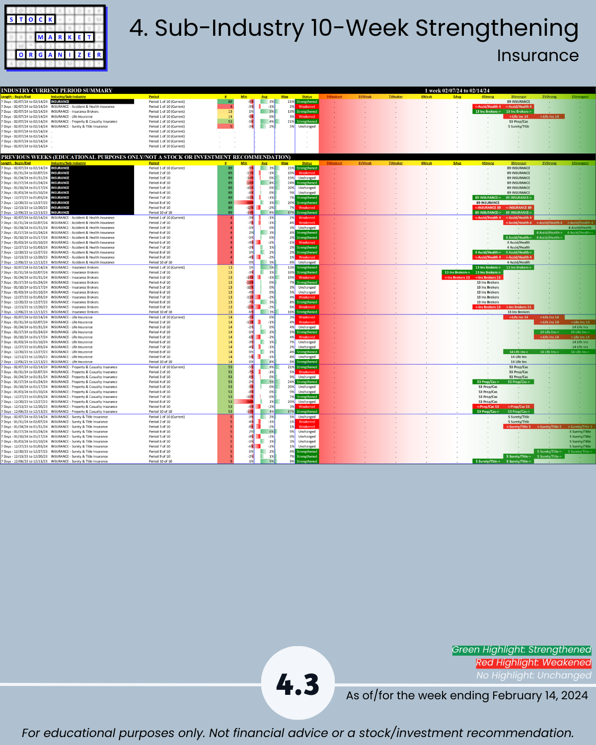 Back-and-forth market = four unchanged Financial Sector industries week ending 2/14/24. Insurance strong – 83% positive stocks last week, and its ratio of Strongest- to Weakest-rated stocks is a massive 64%:1%. Banking stopped weakening (had weakened the preceding two weeks). More detail in the attached Financial Sector Strength report which includes the Strongest- and Weakest-rated Stock Market Organizer stocks and objective strengthening/weakening measurements for the Banking, Financial Services, Insurance, and Real Estate industries.