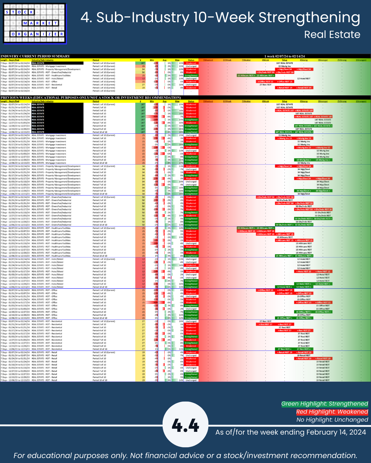 🔹 Diversified/Industrial, Healthcare, Office, Residential REITs are lowest rated sub-industries at Weak (6th strongest)