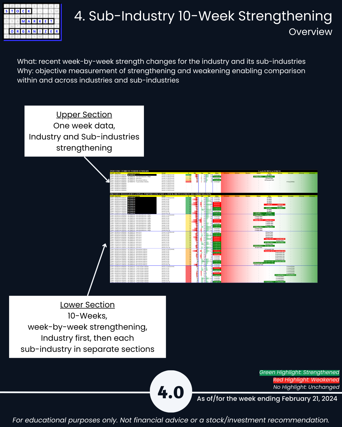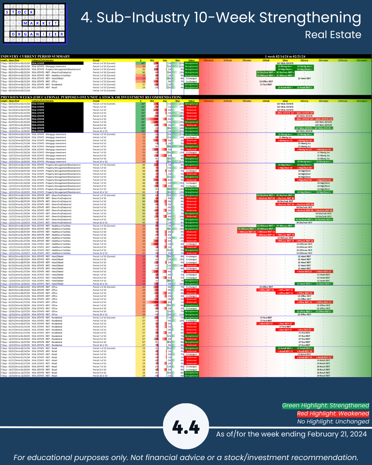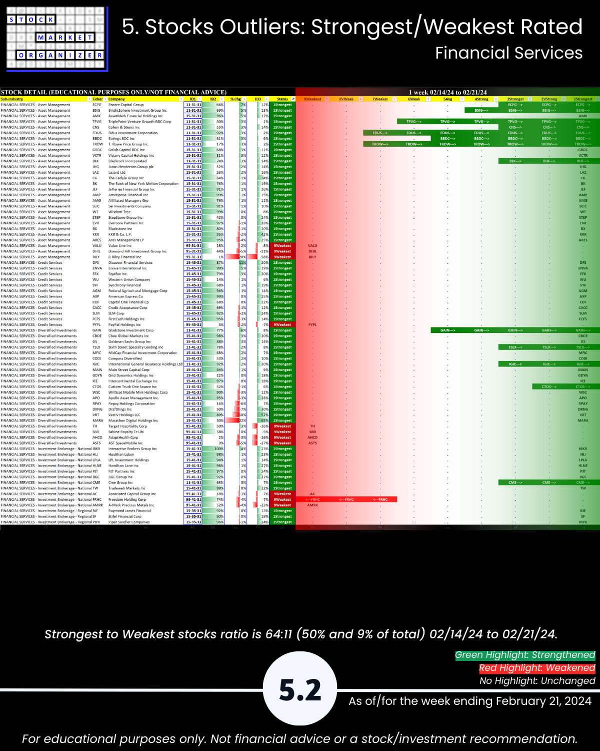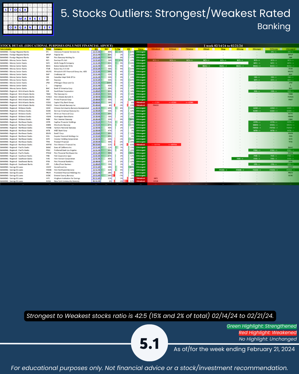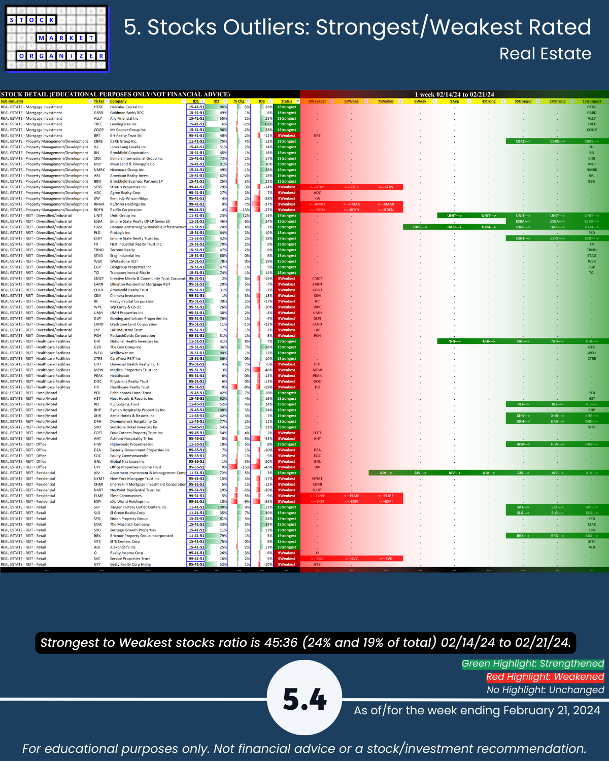 More detail below/attached including Strongest-/Weakest-rated stocks and objective strengthening/weakening measurements.