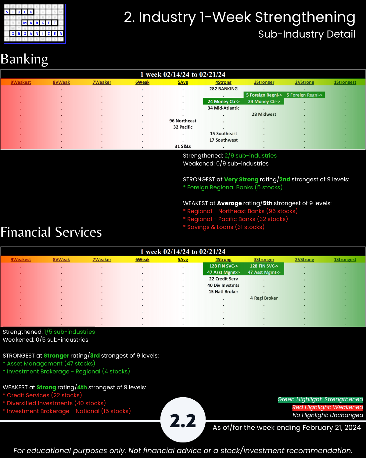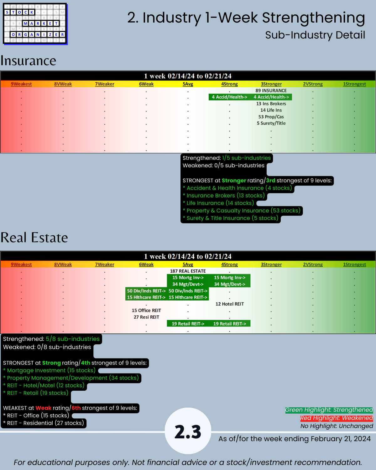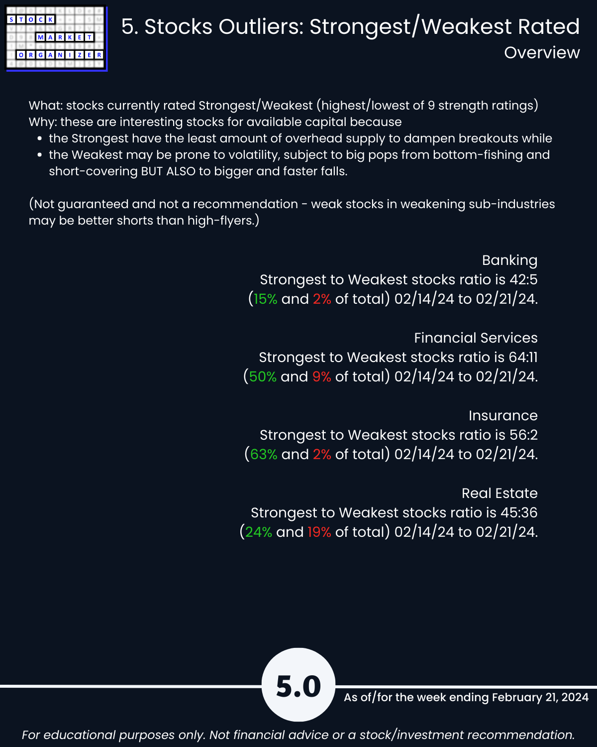 U.S. stock market… see you tomorrow for the Electronics industry report (w/ post-earnings NVDA), today 2/21/24 is the Financial sector where the Insurance industry is en fuego with 16% of its 83 stocks at 5+ year highs, a Stronger strength rating (3rd strongest of 9 levels), and a 63%:2% Strongest:Weakest stocks ratio. Today’s industries: Banking, Financial Services, Insurance, and Real Estate.