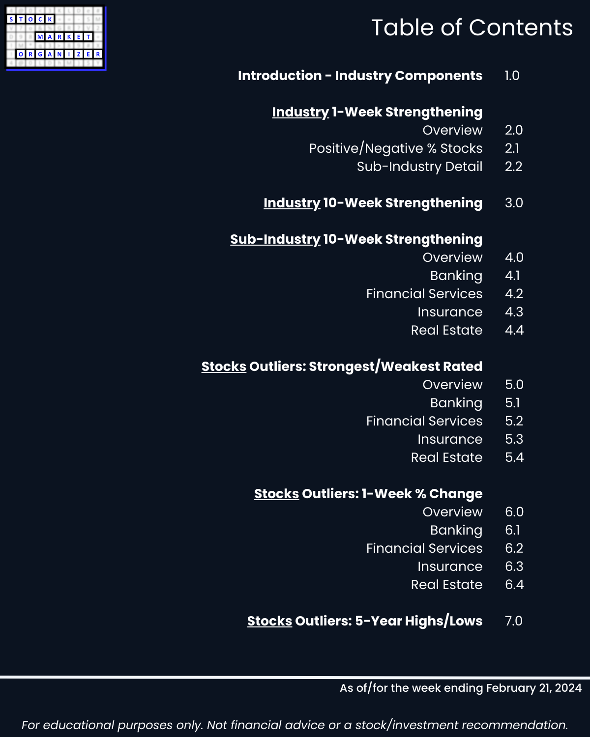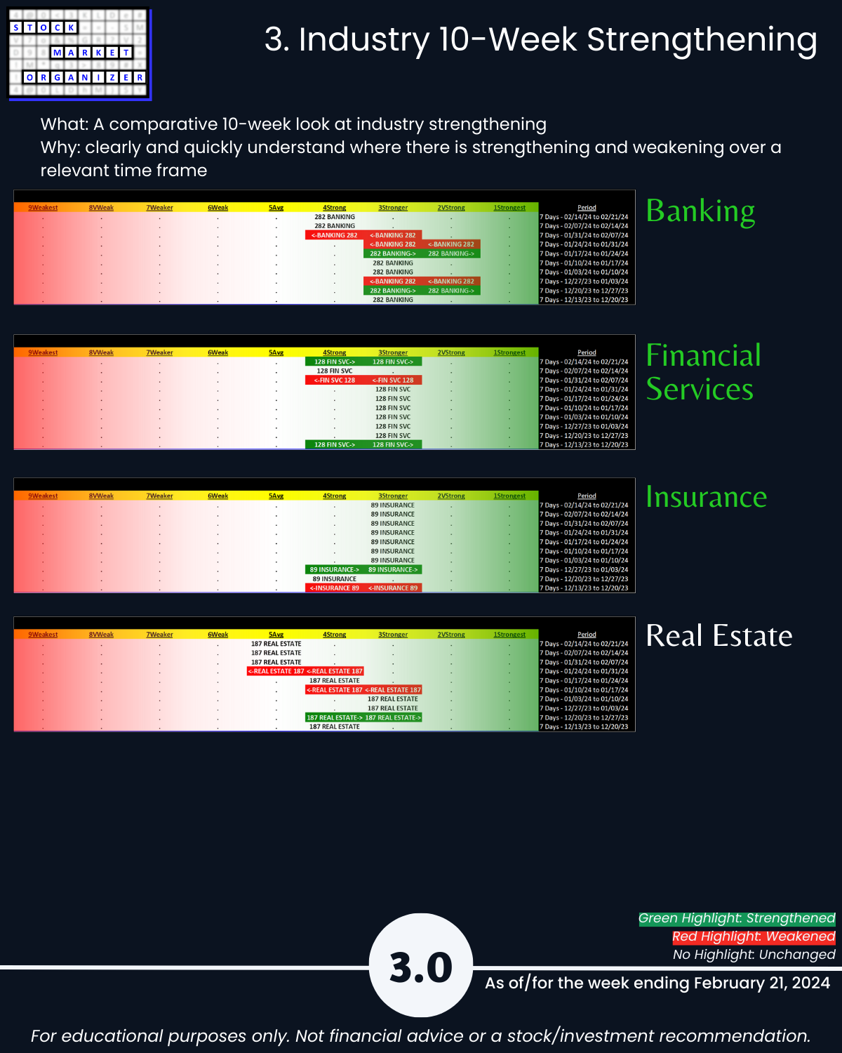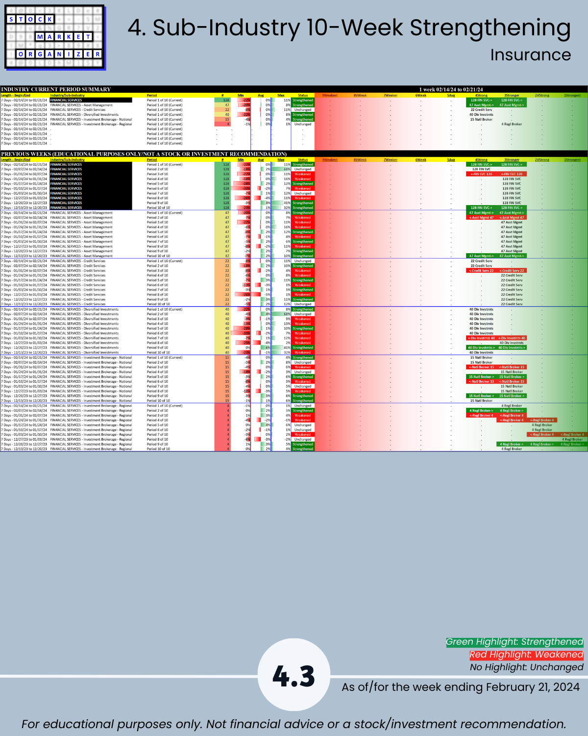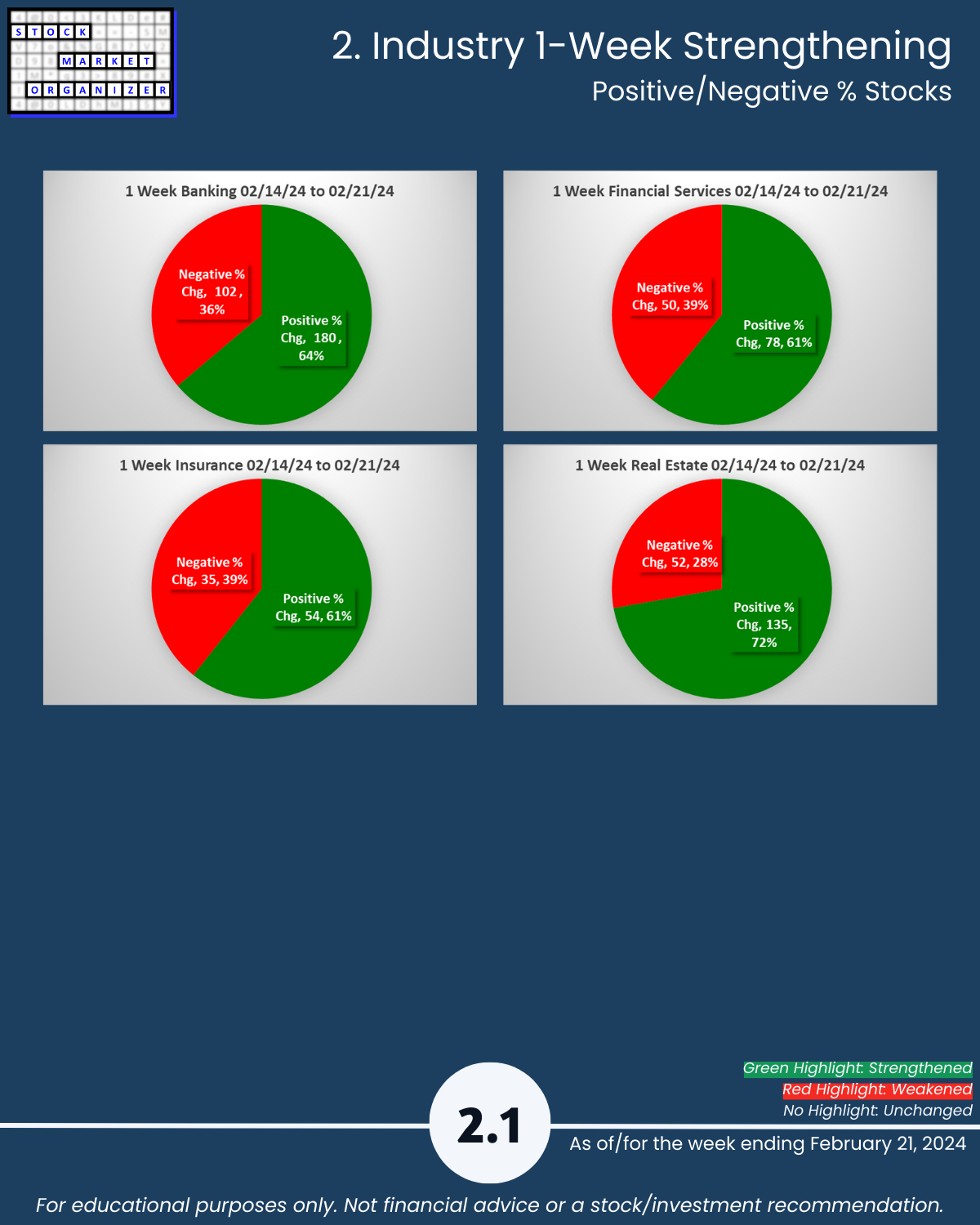 U.S. stock market… see you tomorrow for the Electronics industry report (w/ post-earnings NVDA), today 2/21/24 is the Financial sector where the Insurance industry is en fuego with 16% of its 83 stocks at 5+ year highs, a Stronger strength rating (3rd strongest of 9 levels), and a 63%:2% Strongest:Weakest stocks ratio. Today’s industries: Banking, Financial Services, Insurance, and Real Estate.