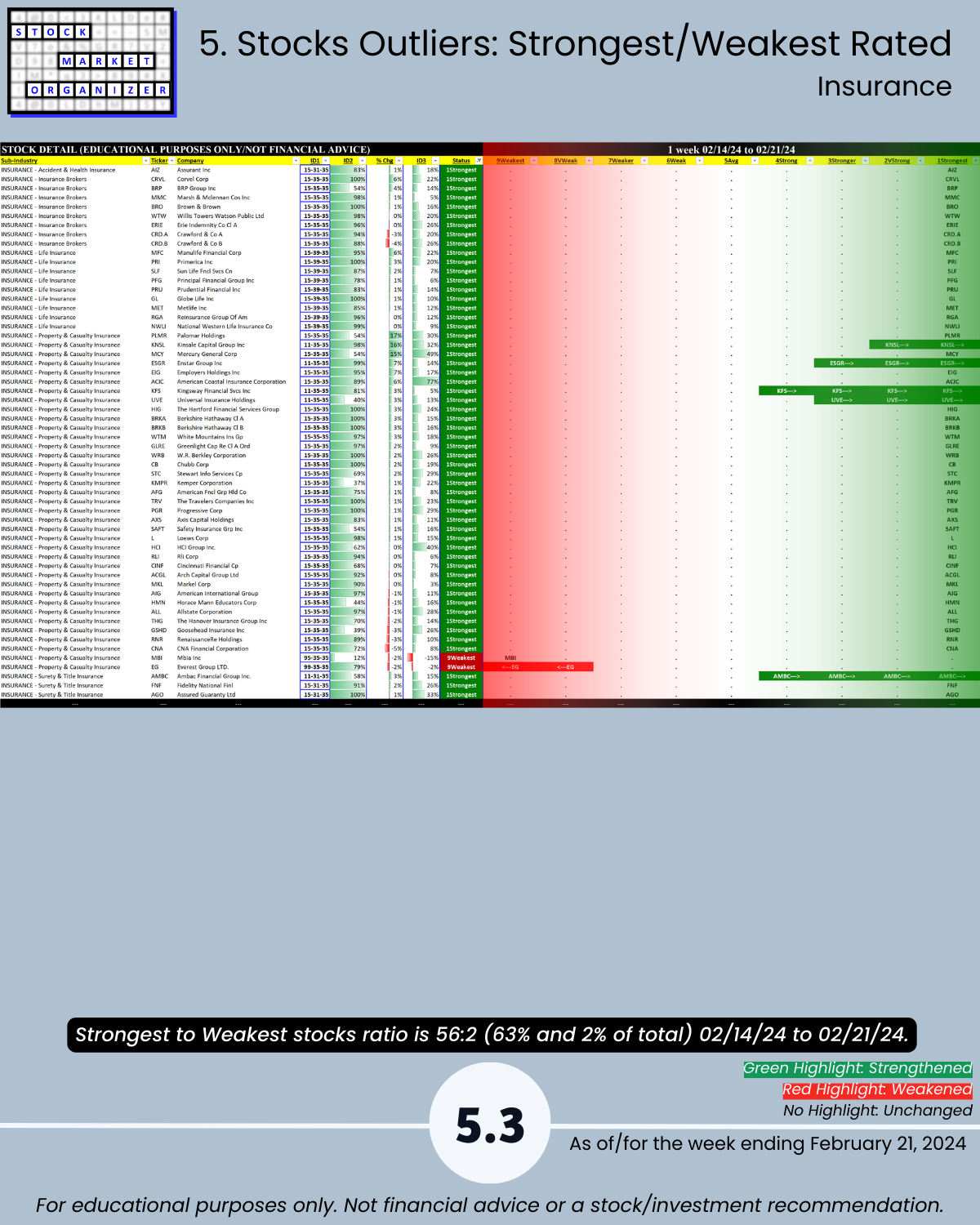 🔹 Stocks rated Strongest:Weakest: Financial Services 50%:9% of total, Insurance 63%:2%
