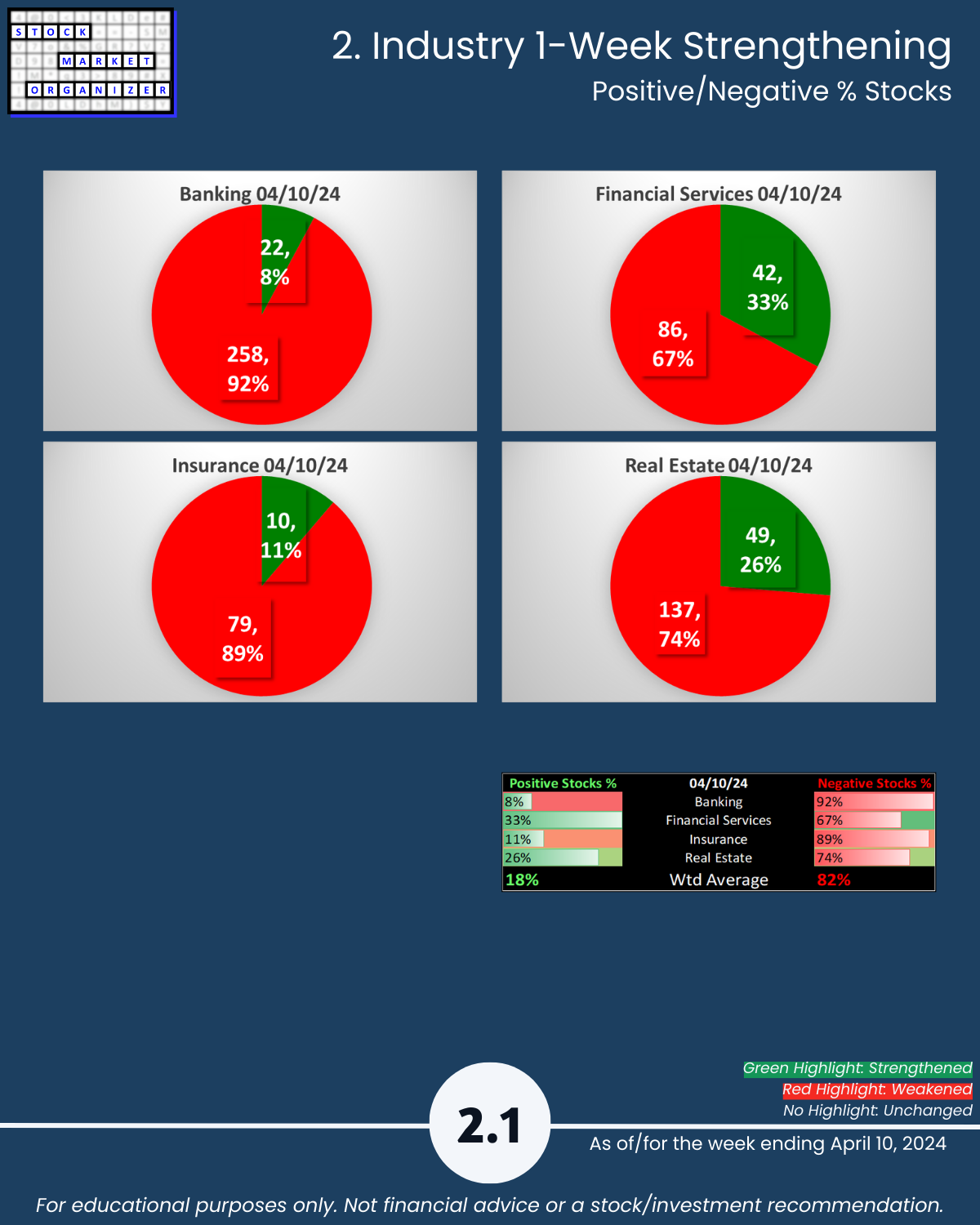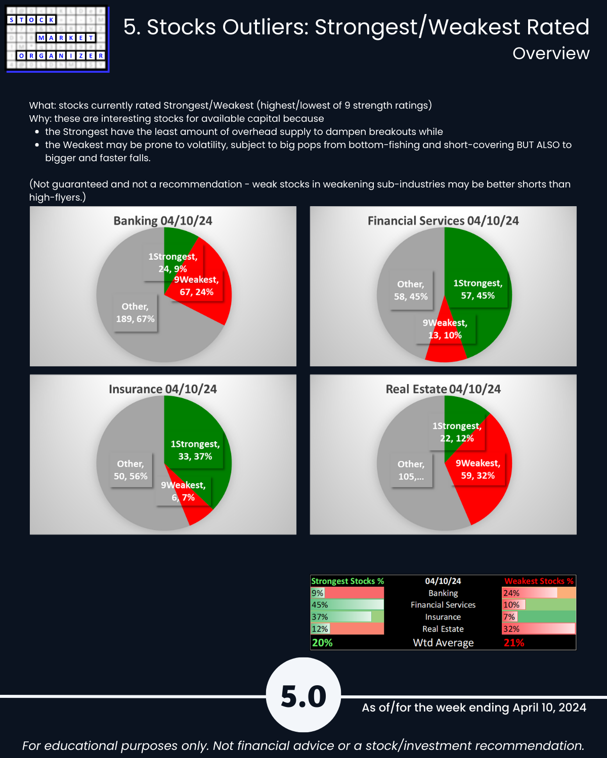 - Stocks, Strongest:Weakest: Avg 20%/21%; Financial Services 45%:10%, Insurance 37%:7% of total