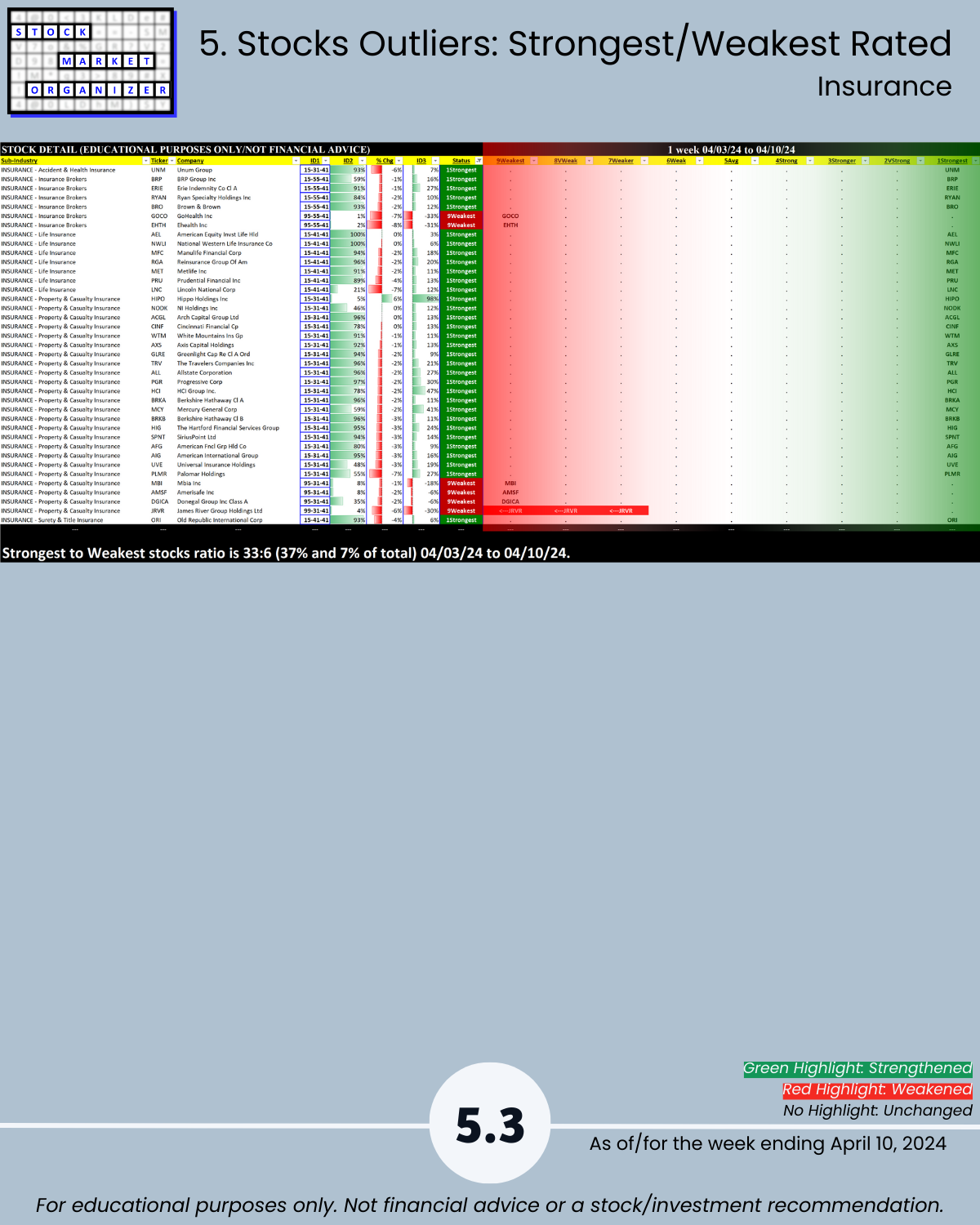 SUMMARY: ANOTHER BAD WEEK, 82% NEGATIVE STOCKS AND INSURANCE FINALLY WEAKENS