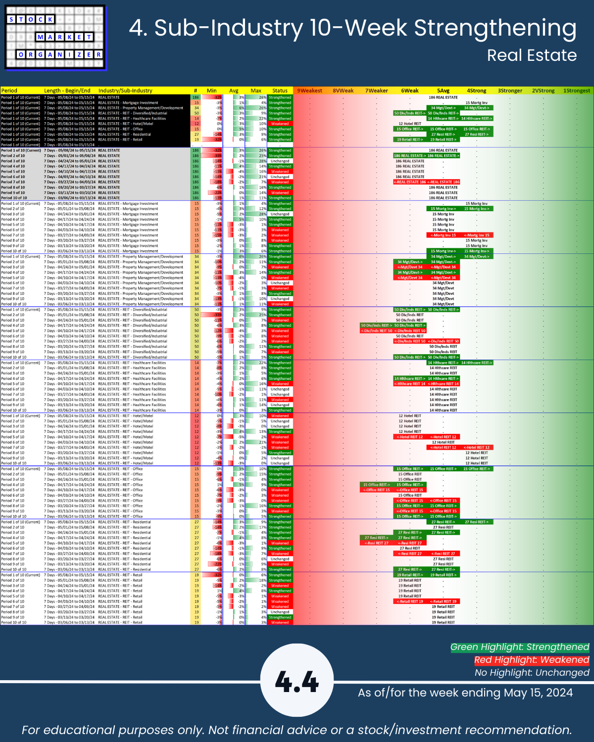 Real Estate and Banking fans, today’s 5/15/24 Financial Sector strength report is for you. Rate cuts on the way? When? How many? By how much? Much chatter about current/coming bank issues, triggered by CRE concerns… do these stocks reflect this? Place your bets.
