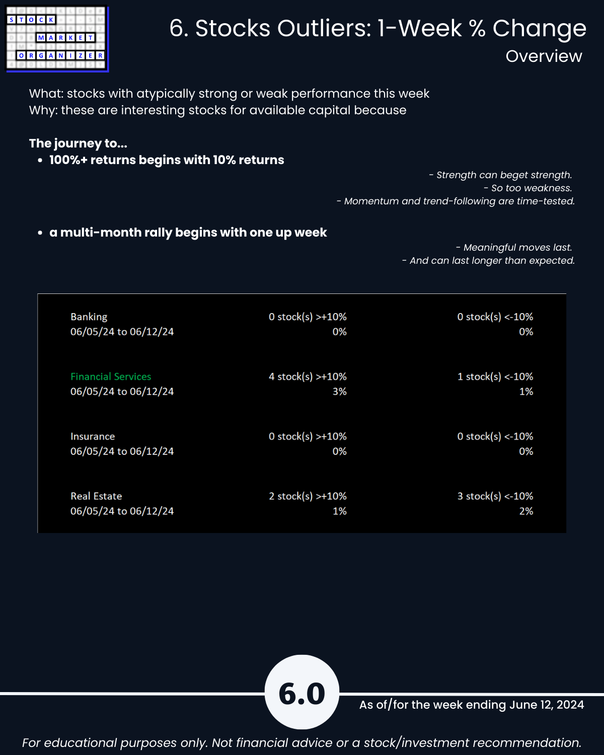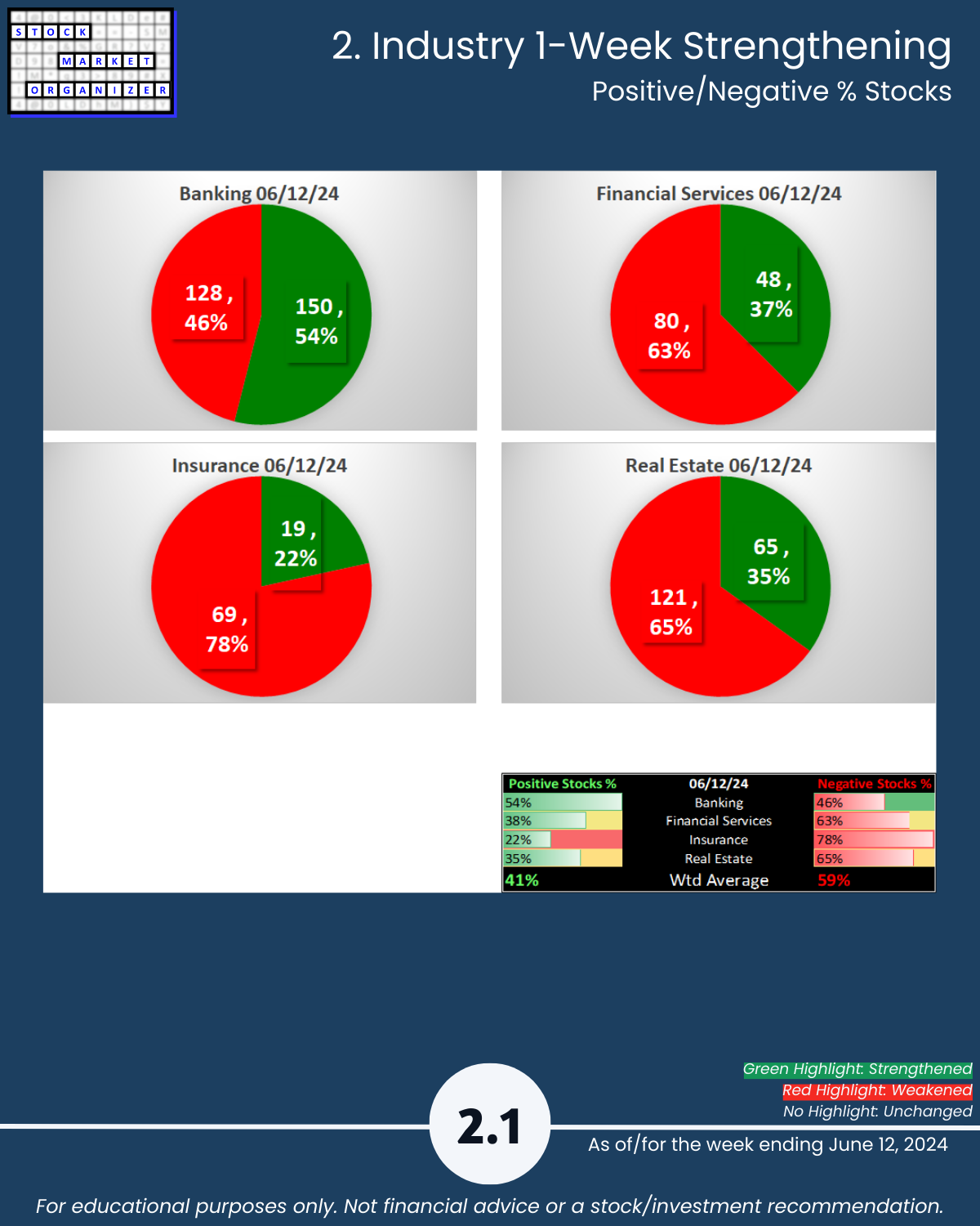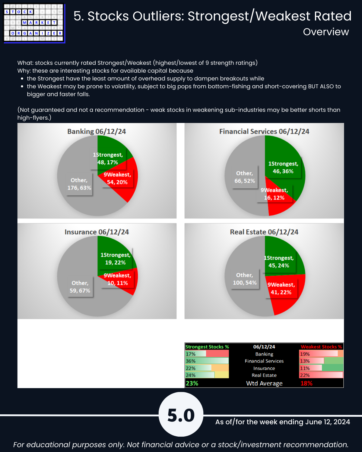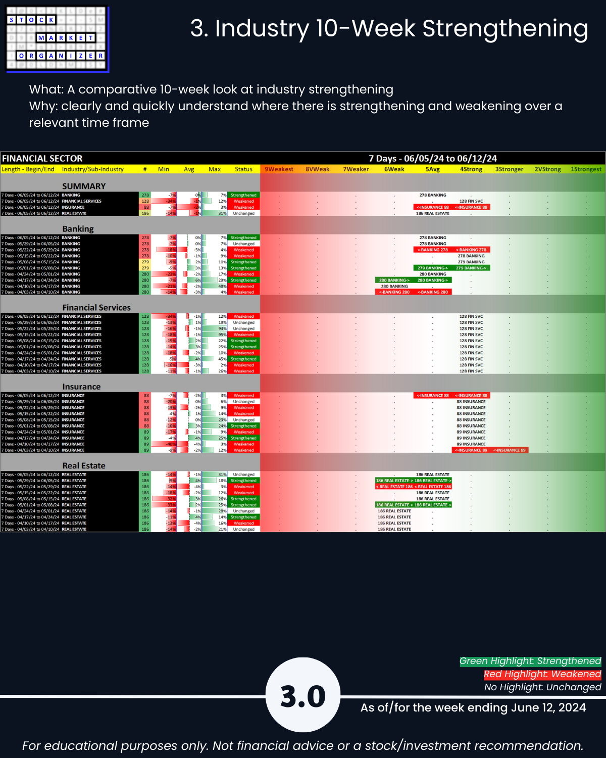 Do you know how to put current market action into actionable context? One way: see attached 6/12/24 Financial Sector overview covering the current strength status of the Banking, Financial Services, Insurance, and Real Estate industries.