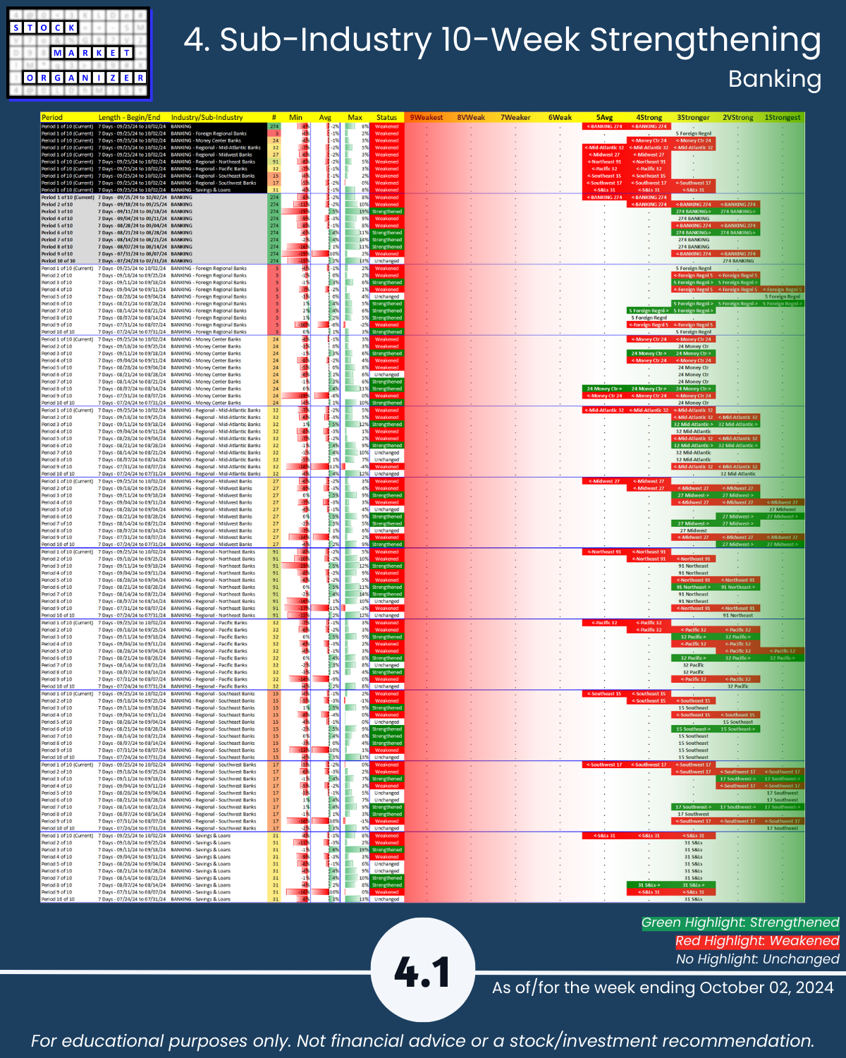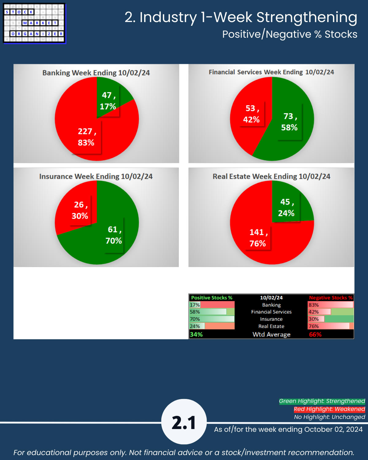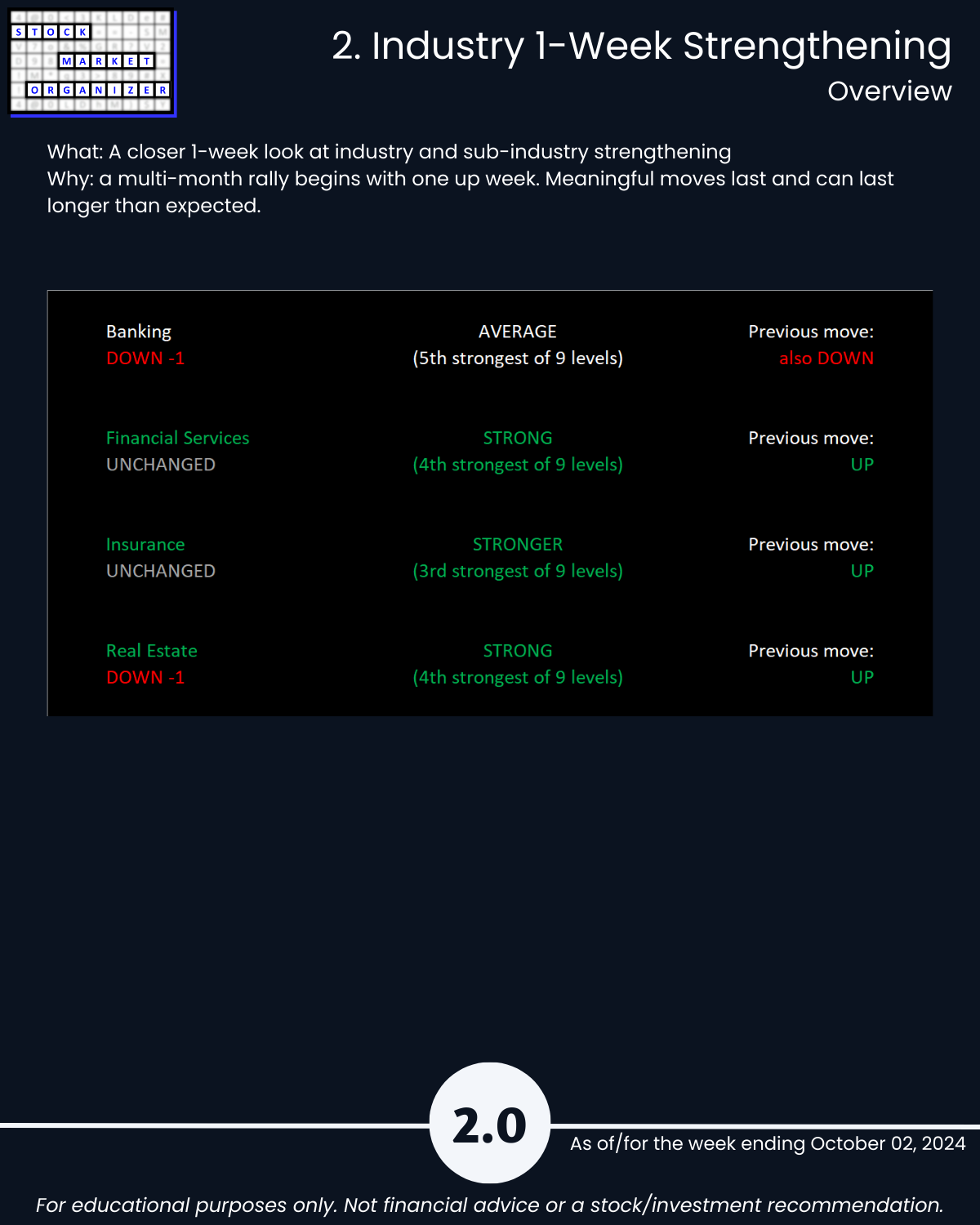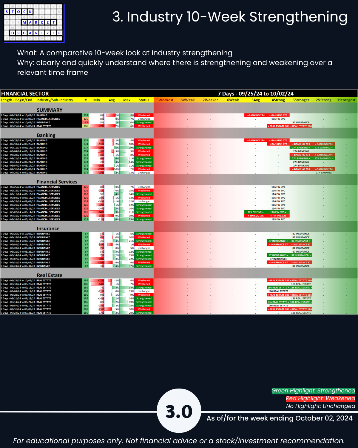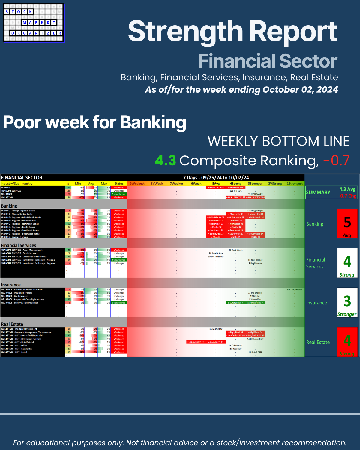 Get your unique context then stack strength/weakness in the Financial Sector with the help of the attached Stock Market Organizer Strength Report as of/for the week ending 10/02/24 focusing on the Banking, Financial Services, Insurance, and Real Estate industries. Details attached in a manner not available elsewhere because I created it from scratch to continually answer this question: “Where is there strengthening and weakening in the market at the stock, sub-industry, industry, and sector levels?” Combine this with the top-down Market Strength Score and Sector Risk Gauge to get a key competitive advantage of understanding strength at every level.