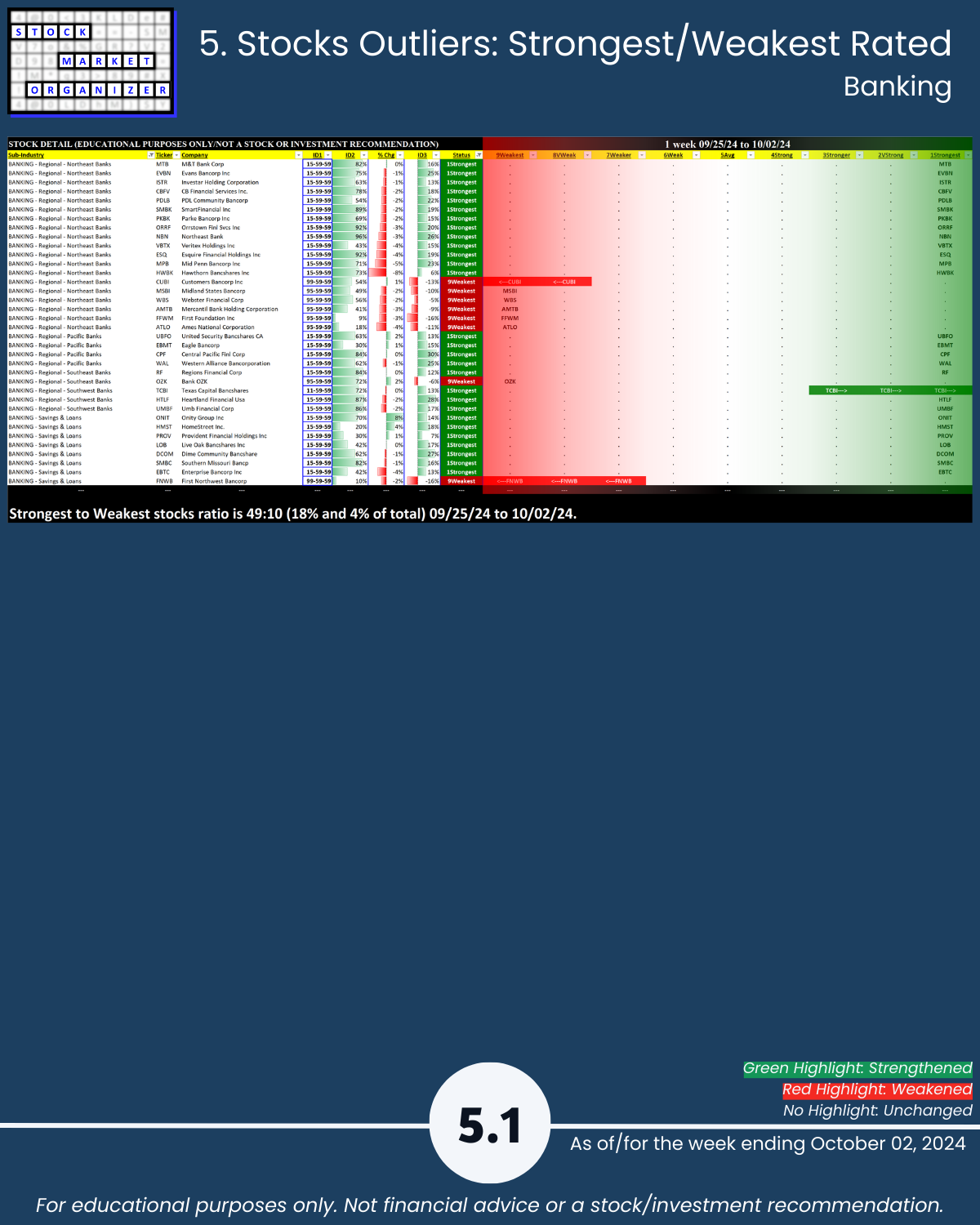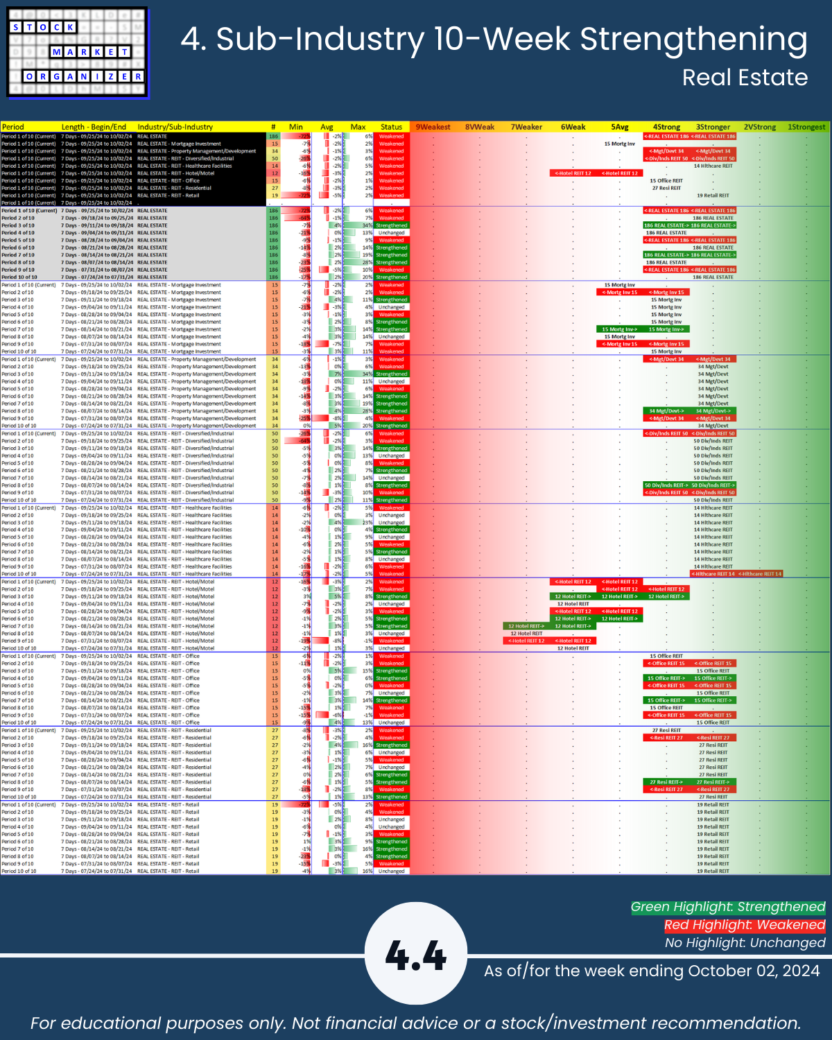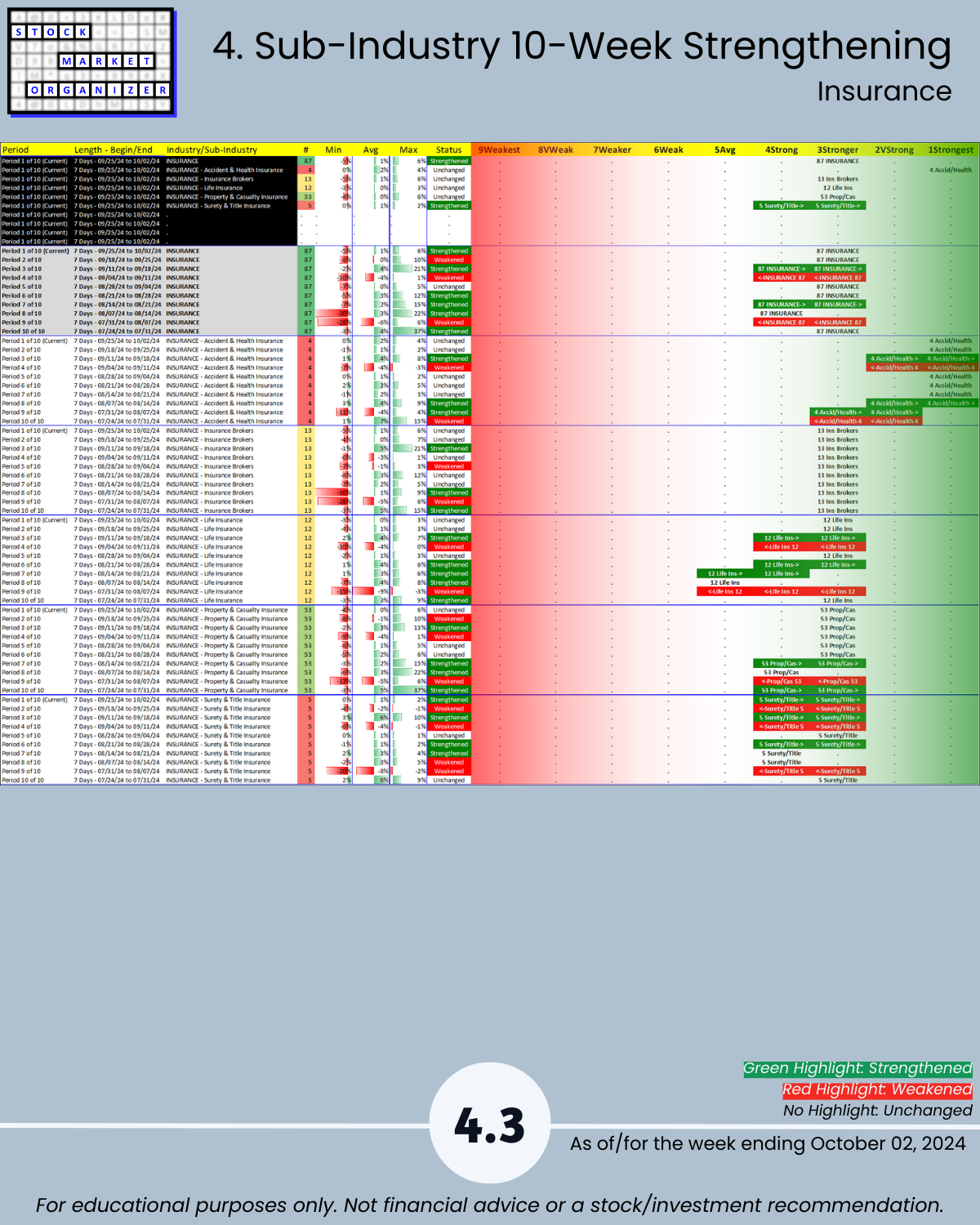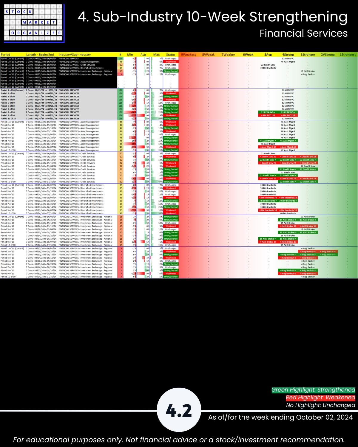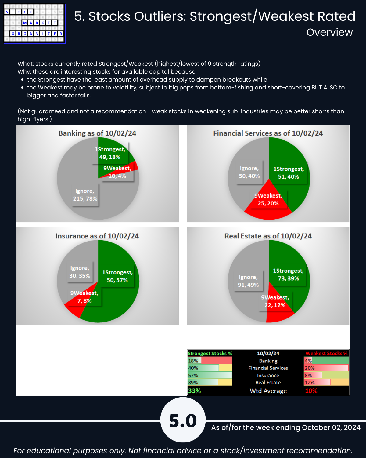 Get your unique context then stack strength/weakness in the Financial Sector with the help of the attached Stock Market Organizer Strength Report as of/for the week ending 10/02/24 focusing on the Banking, Financial Services, Insurance, and Real Estate industries. Details attached in a manner not available elsewhere because I created it from scratch to continually answer this question: “Where is there strengthening and weakening in the market at the stock, sub-industry, industry, and sector levels?” Combine this with the top-down Market Strength Score and Sector Risk Gauge to get a key competitive advantage of understanding strength at every level.
