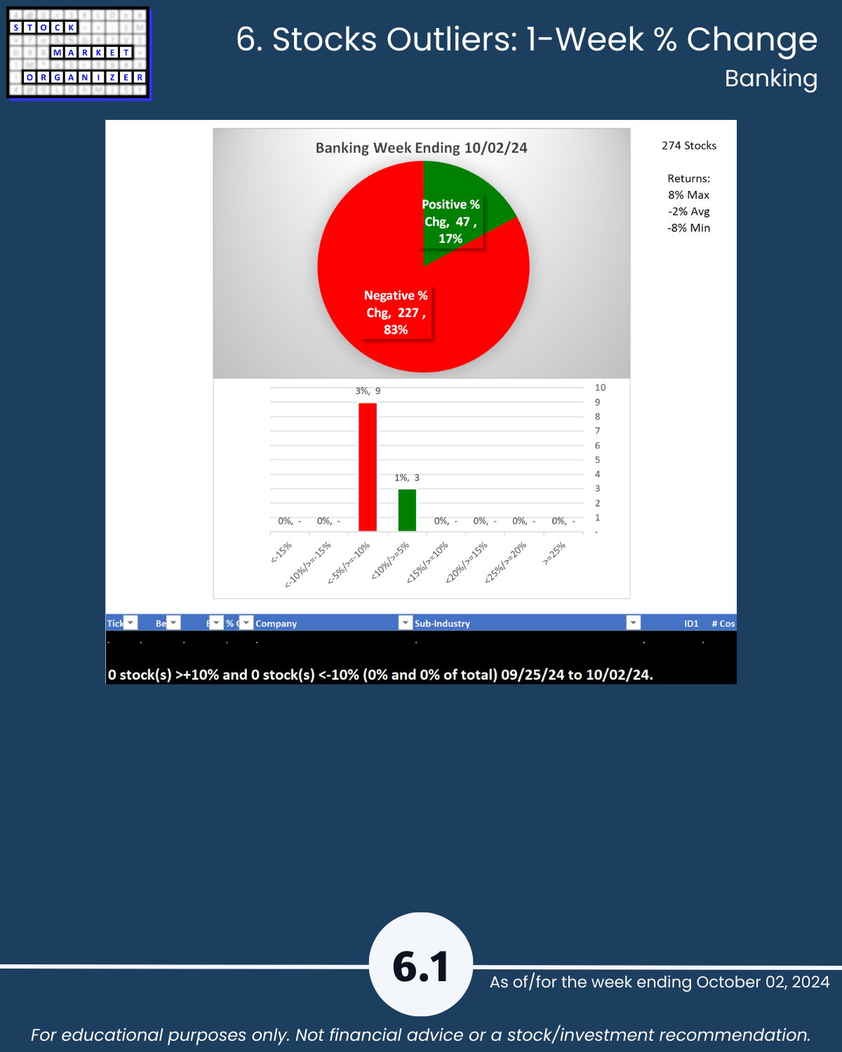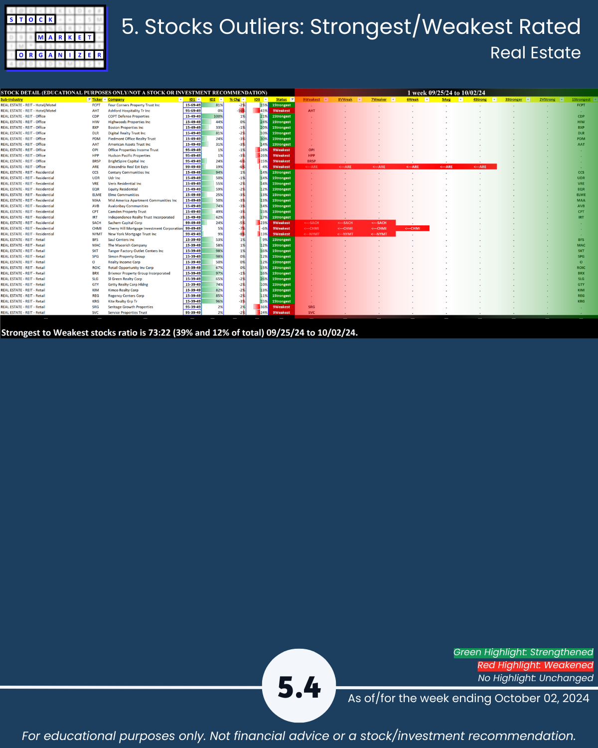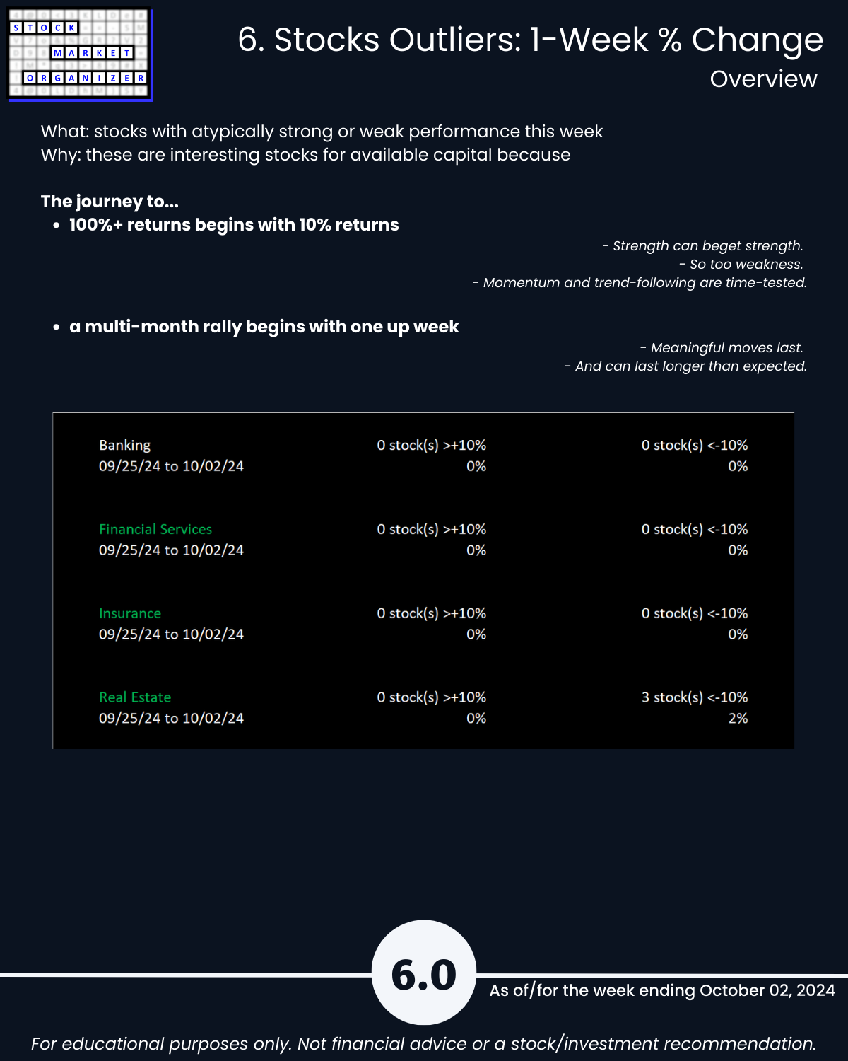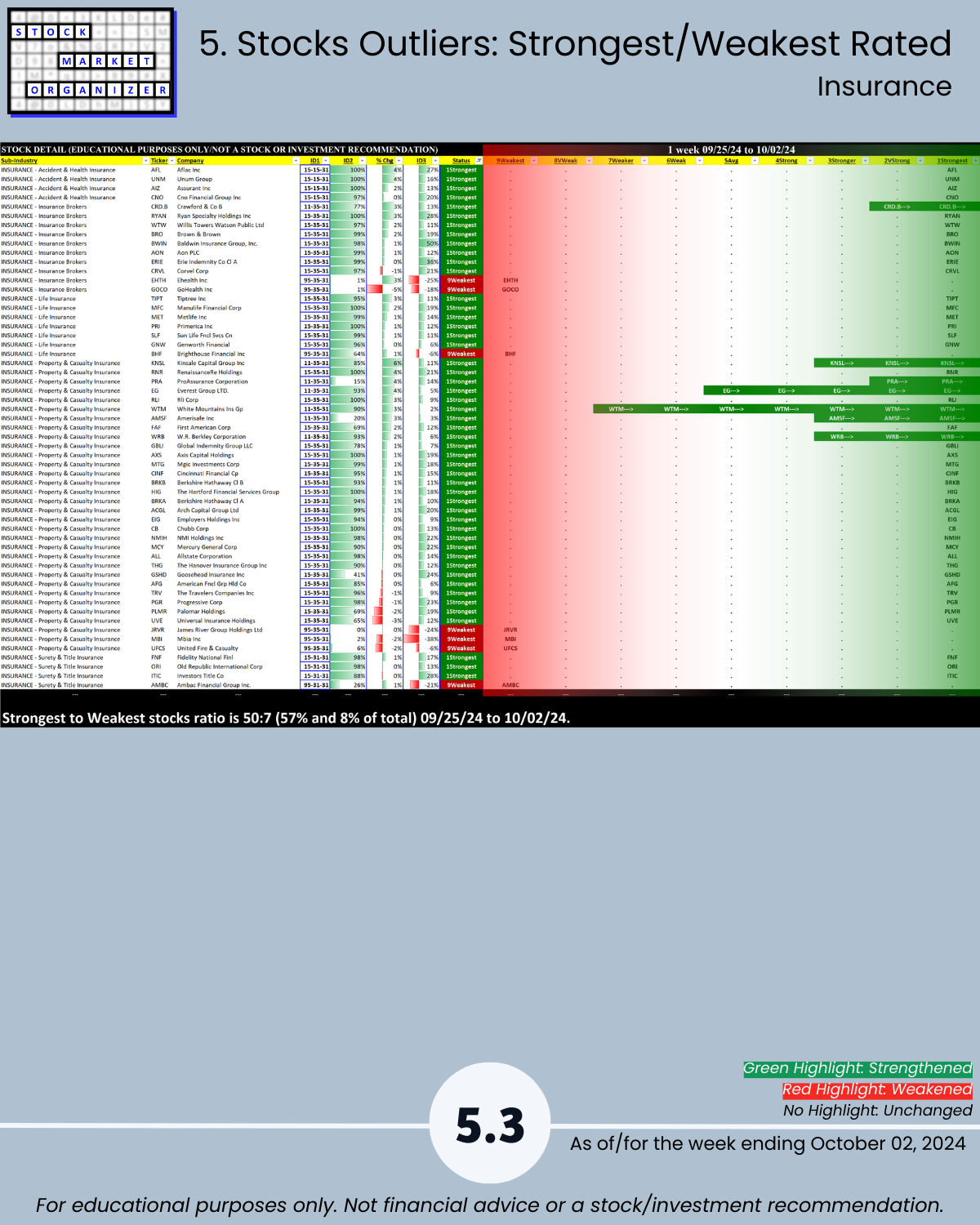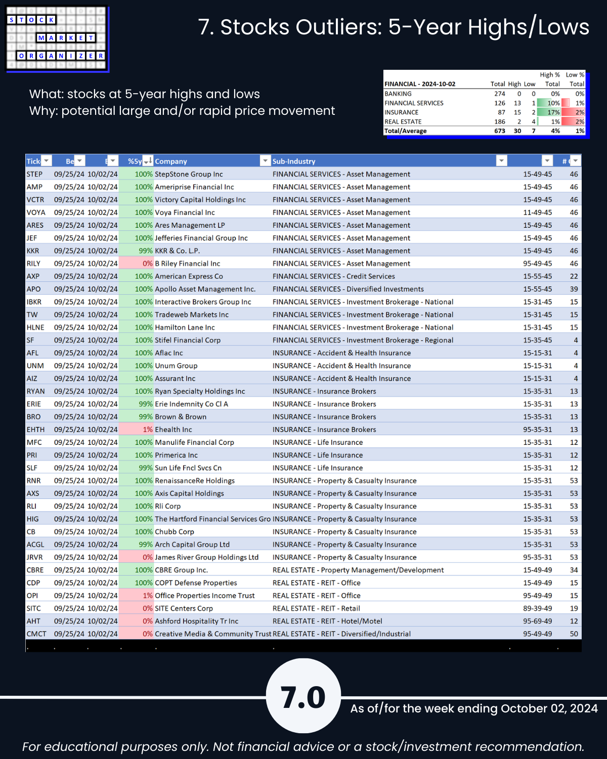 Get your unique context then stack strength/weakness in the Financial Sector with the help of the attached Stock Market Organizer Strength Report as of/for the week ending 10/02/24 focusing on the Banking, Financial Services, Insurance, and Real Estate industries. Details attached in a manner not available elsewhere because I created it from scratch to continually answer this question: “Where is there strengthening and weakening in the market at the stock, sub-industry, industry, and sector levels?” Combine this with the top-down Market Strength Score and Sector Risk Gauge to get a key competitive advantage of understanding strength at every level.