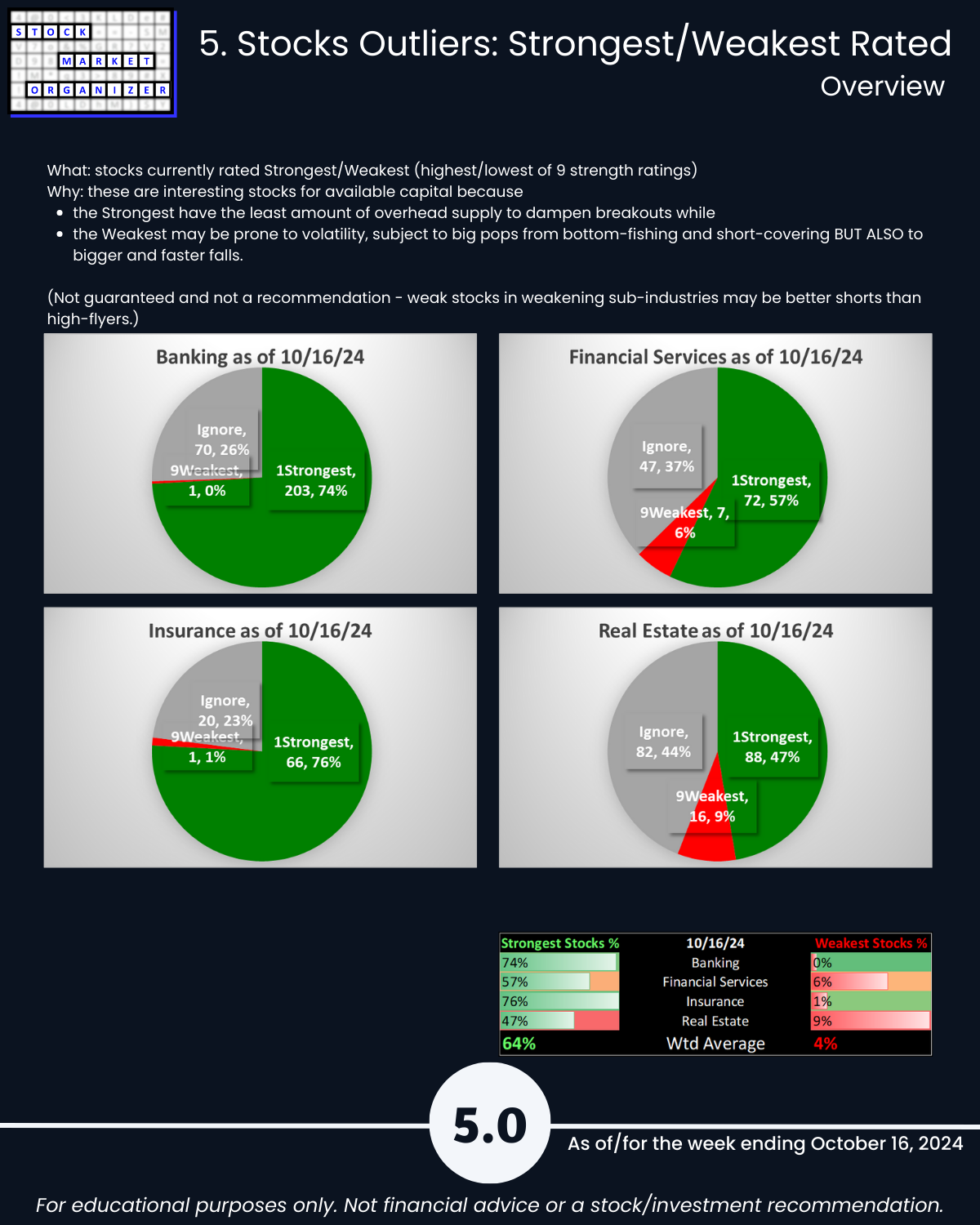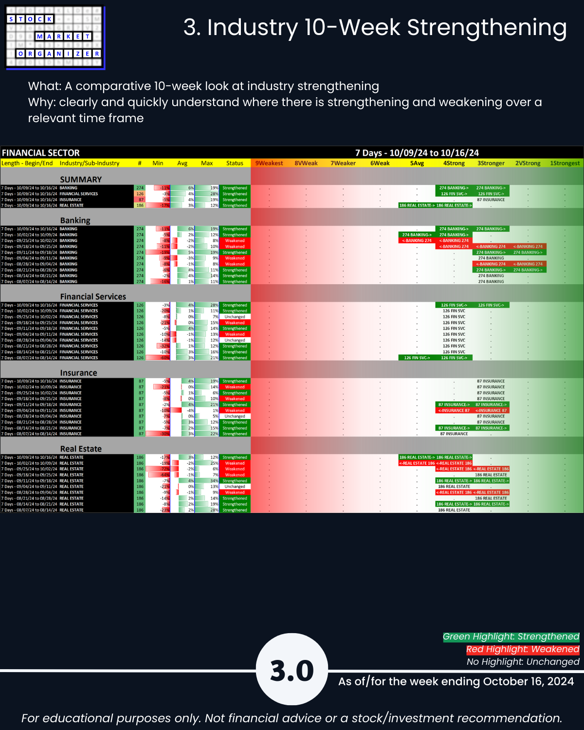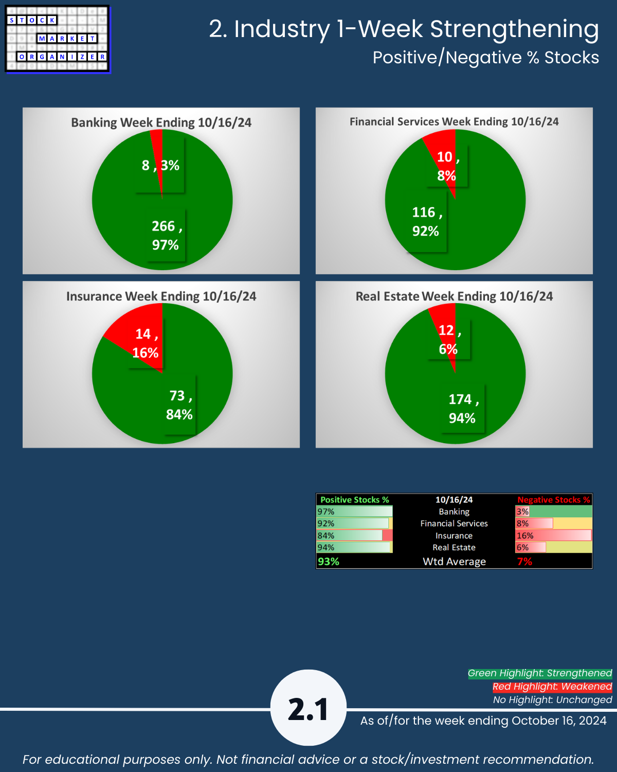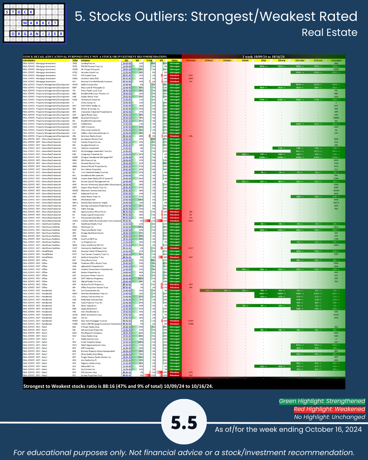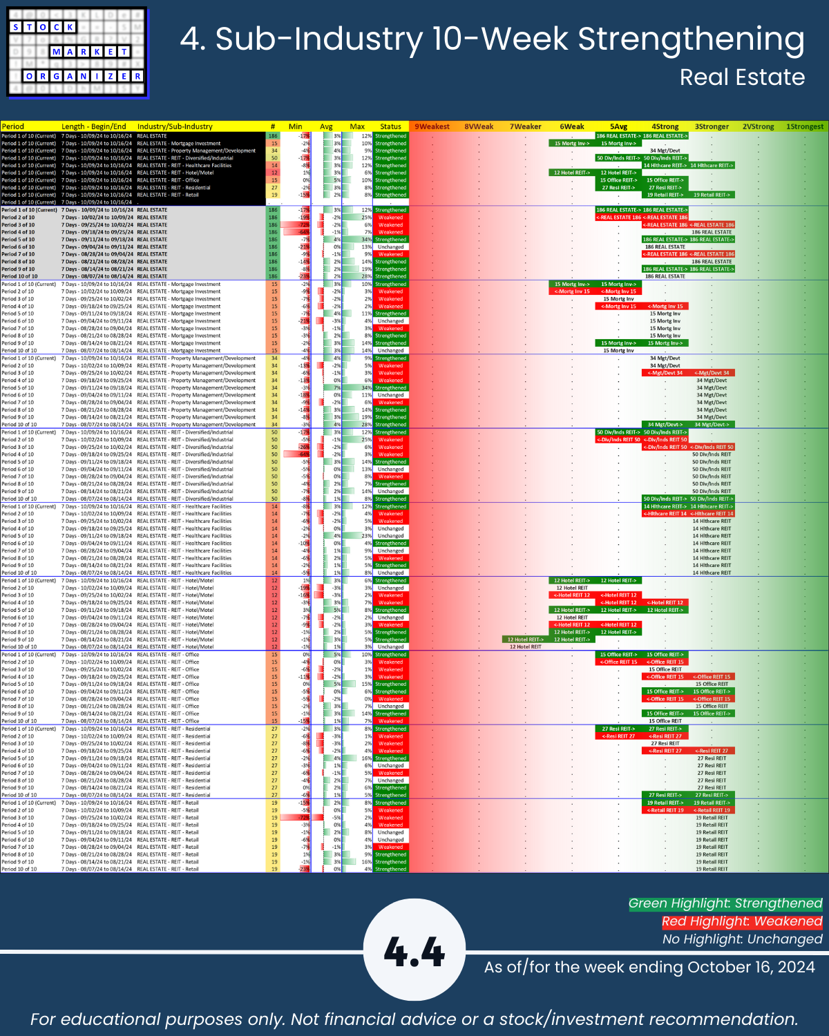 For the week ending Wednesday, October 16, 2024, three of four industries strengthened and this sector is crushing it. Real Estate bounced back - as of the end of last week (October 9), Real Estate for the first time in 10 weeks weakened below 4Strong, to a new recent low of 5Average. This week, the Real Estate industry strengthened to 4Strong again powered by all eight sub-industries strengthening (seven enough to increase one strength rating each).
