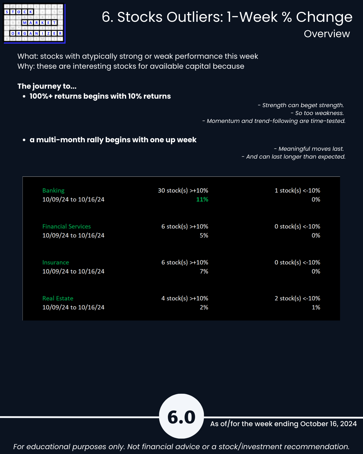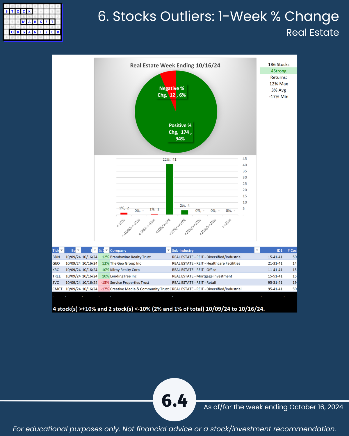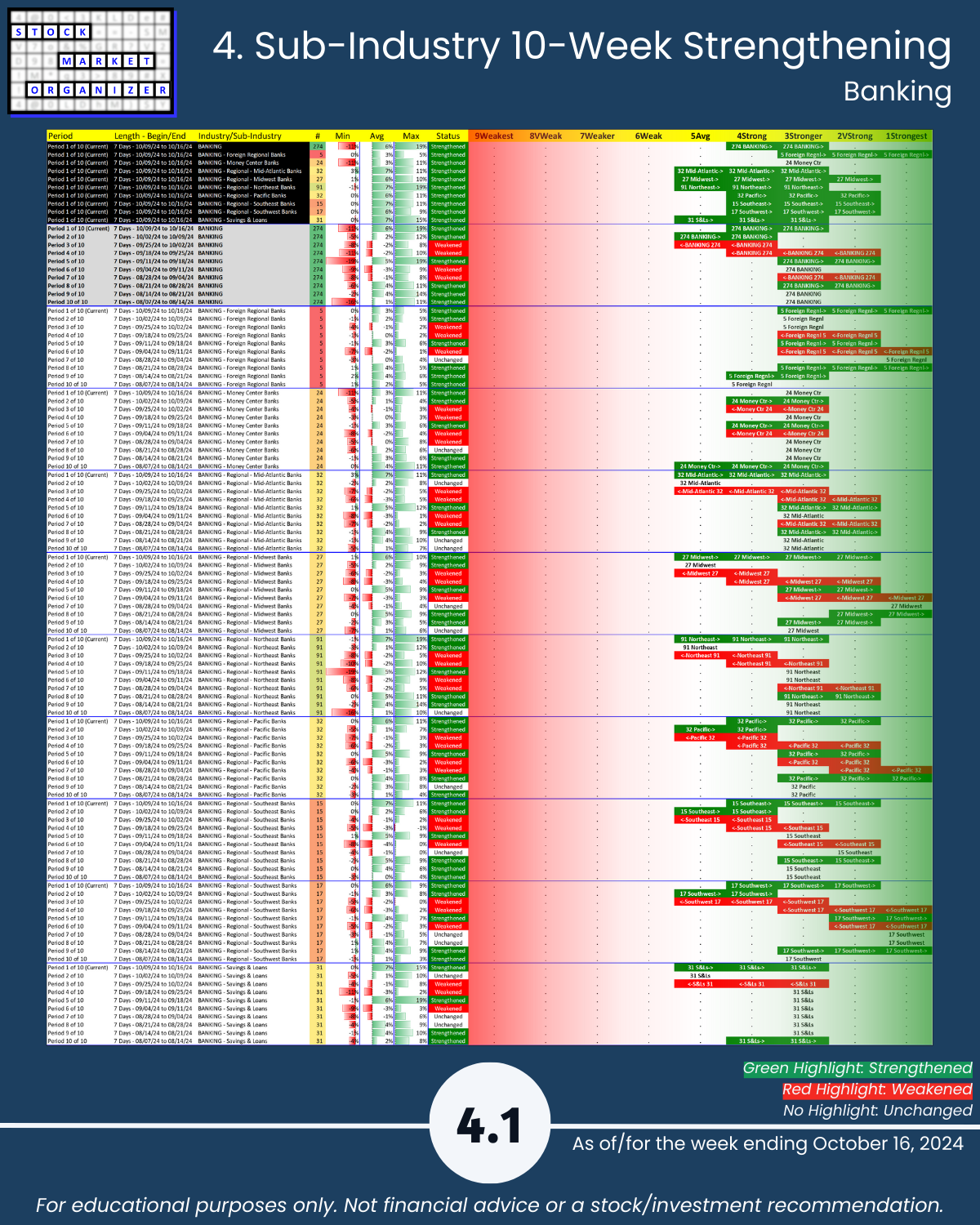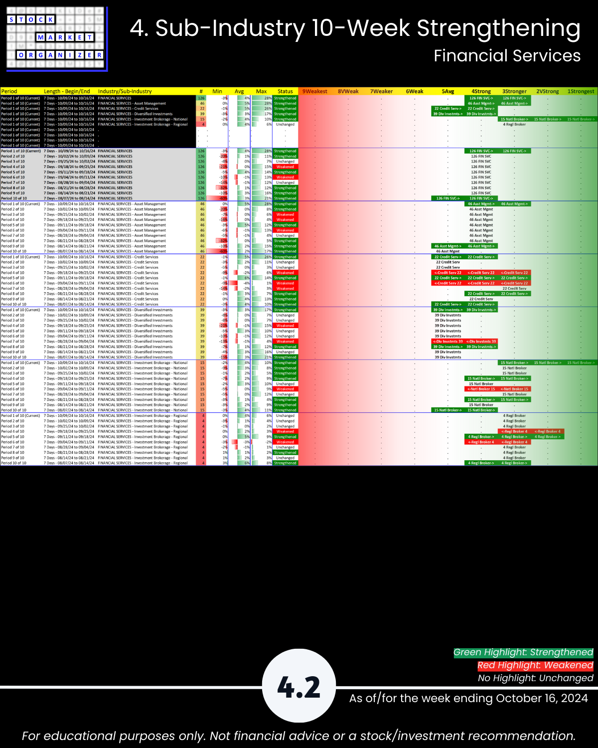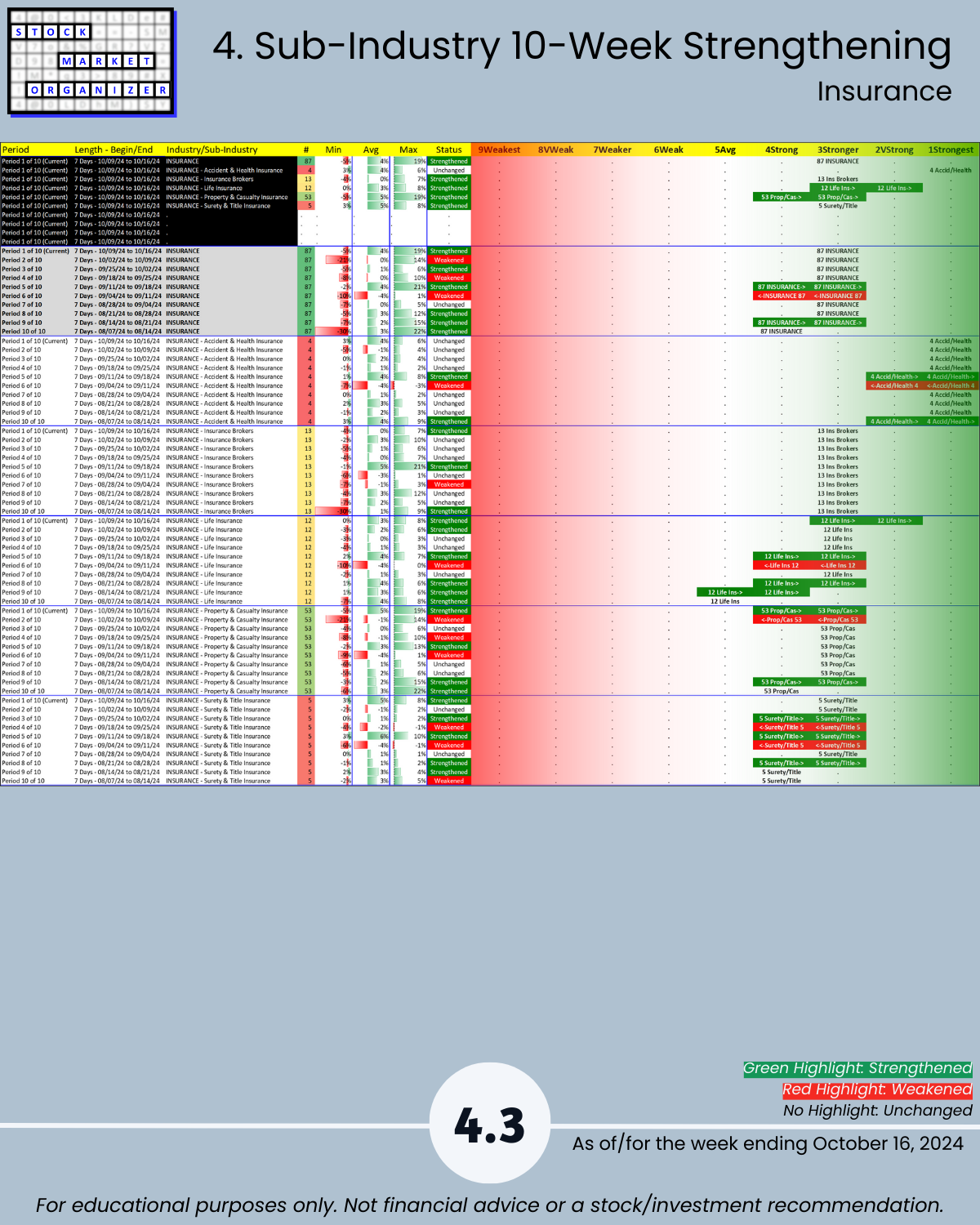 For the week ending Wednesday, October 16, 2024, three of four industries strengthened and this sector is crushing it. Real Estate bounced back - as of the end of last week (October 9), Real Estate for the first time in 10 weeks weakened below 4Strong, to a new recent low of 5Average. This week, the Real Estate industry strengthened to 4Strong again powered by all eight sub-industries strengthening (seven enough to increase one strength rating each).