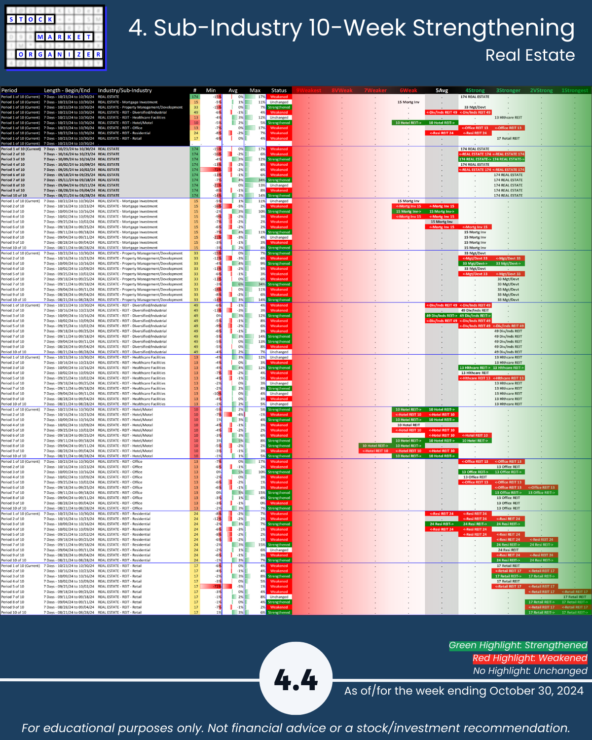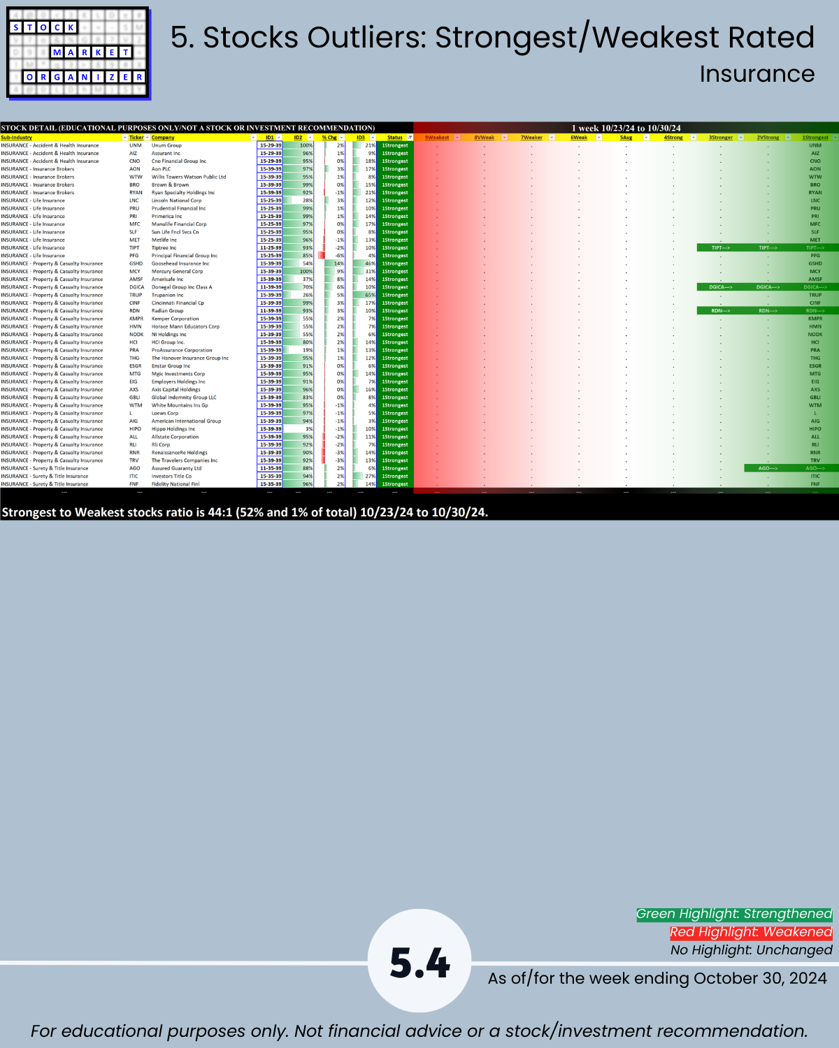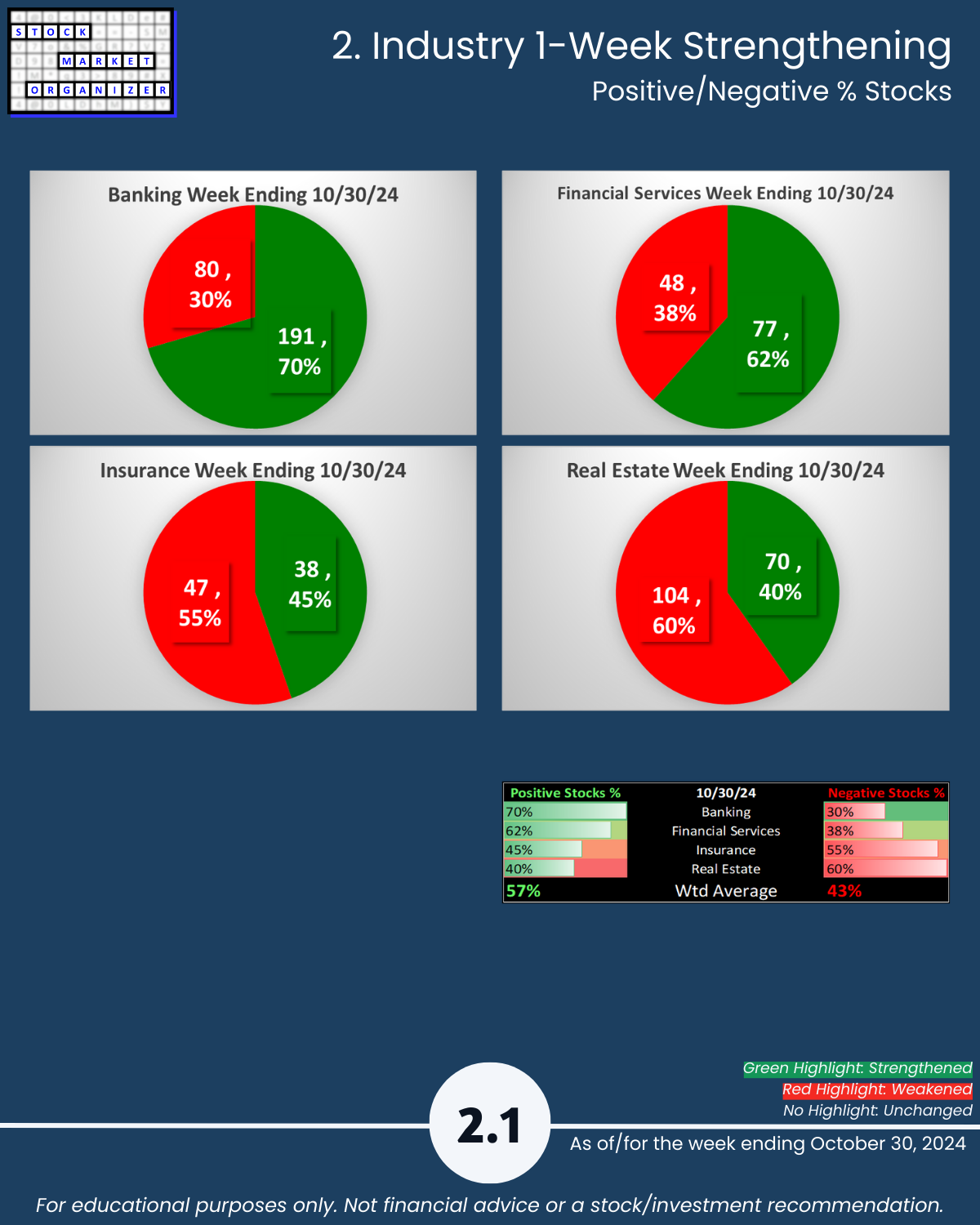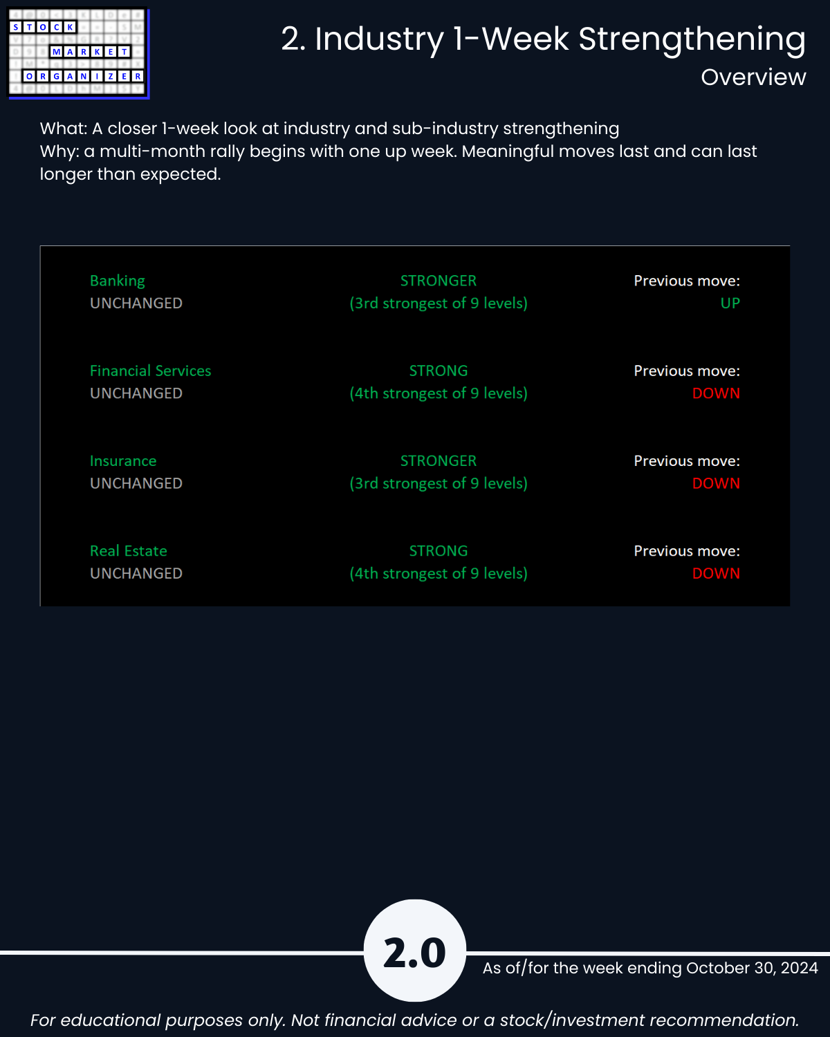 For the week ending Wednesday, October 30, 2024, all four industries were unchanged in terms of strength rating, though both Insurance and Real Estate did weaken (just not enough to affect the industry strength rating).